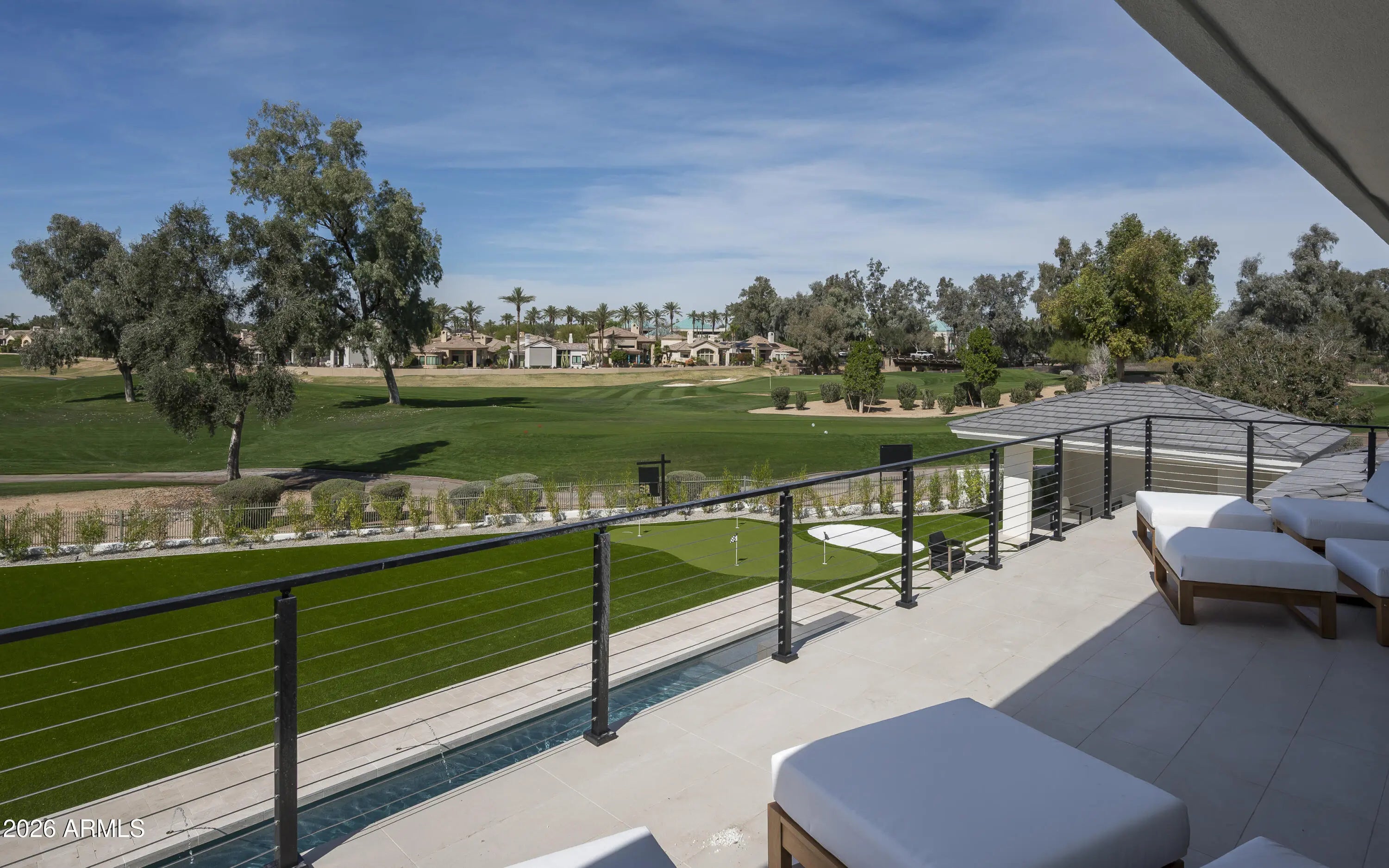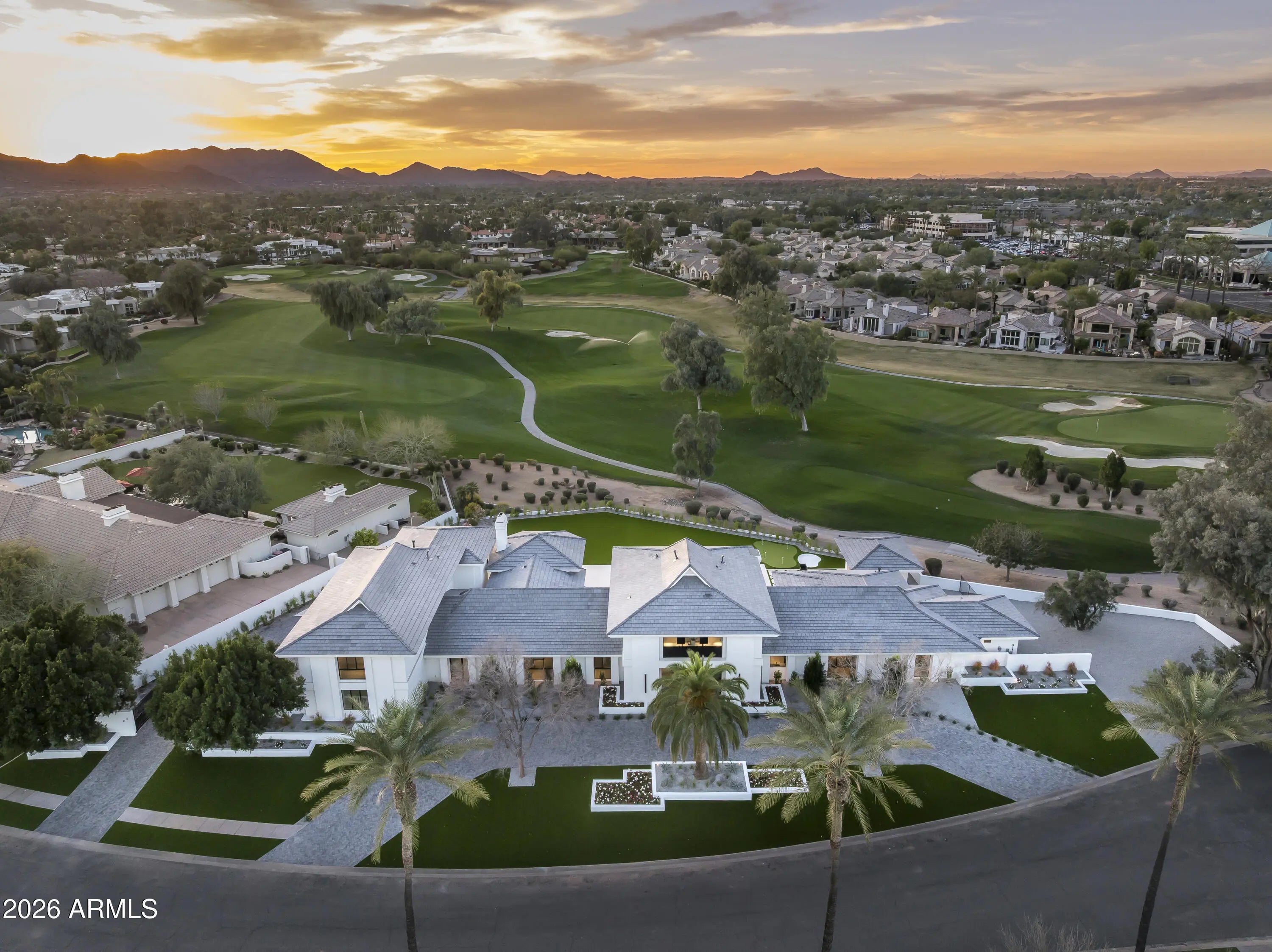 Welcome home to Vaquero Dr at Gainey Ranch, a prestigious gated enclave offering lush surroundings, championship golf, resort-style amenities, and exceptional location convenience. Perfectly situated along the Arroyo golf course on a near 1 acre lot, this remarkable estate captures sweeping golf course and Mummy Mountain views while being just minutes from upscale shopping, dining, the Loop 101, and SDL & PHX Airports. Designed for refined living and entertaining, the home includes an attached guest house with 2-3 bedrooms, living room, full kitchen and bar, private laundry, and a dedicated movie theater--ideal for guests or multigenerational living. The primary suite is a luxurious retreat featuring a private balcony with breathtaking views, drop-down ceiling TV, coffee bar, oversized steam shower, freestanding soaking tub, makeup vanity, and custom his-and-hers designer walk-in closets with washer and dryer, all serviced by an elevator. Entertain effortlessly in the elegant great room with fireplace, dry bar, and dramatic 24-foot sliding doors. Additional highlights include a glass-enclosed wine room for over 350 bottles, a private study/office with custom built-ins, and a game/teen room with full wet bar opening to the backyard. 3 en-suite bedrooms provide comfort and privacy, while a private gym and spa offer a sauna, cold plunge, outdoor shower, and patio access. The resort-style backyard features a brand new pool w/ zero-edge spa, covered outdoor dining with fireplace, BBQ area, fire pit, ramada, putting green, and expansive turf. A gated motor court and 6-8 car garage complete this exceptional Gainey Ranch estate, enhanced by a discreet whole-home automation and AV system for seamless modern living.