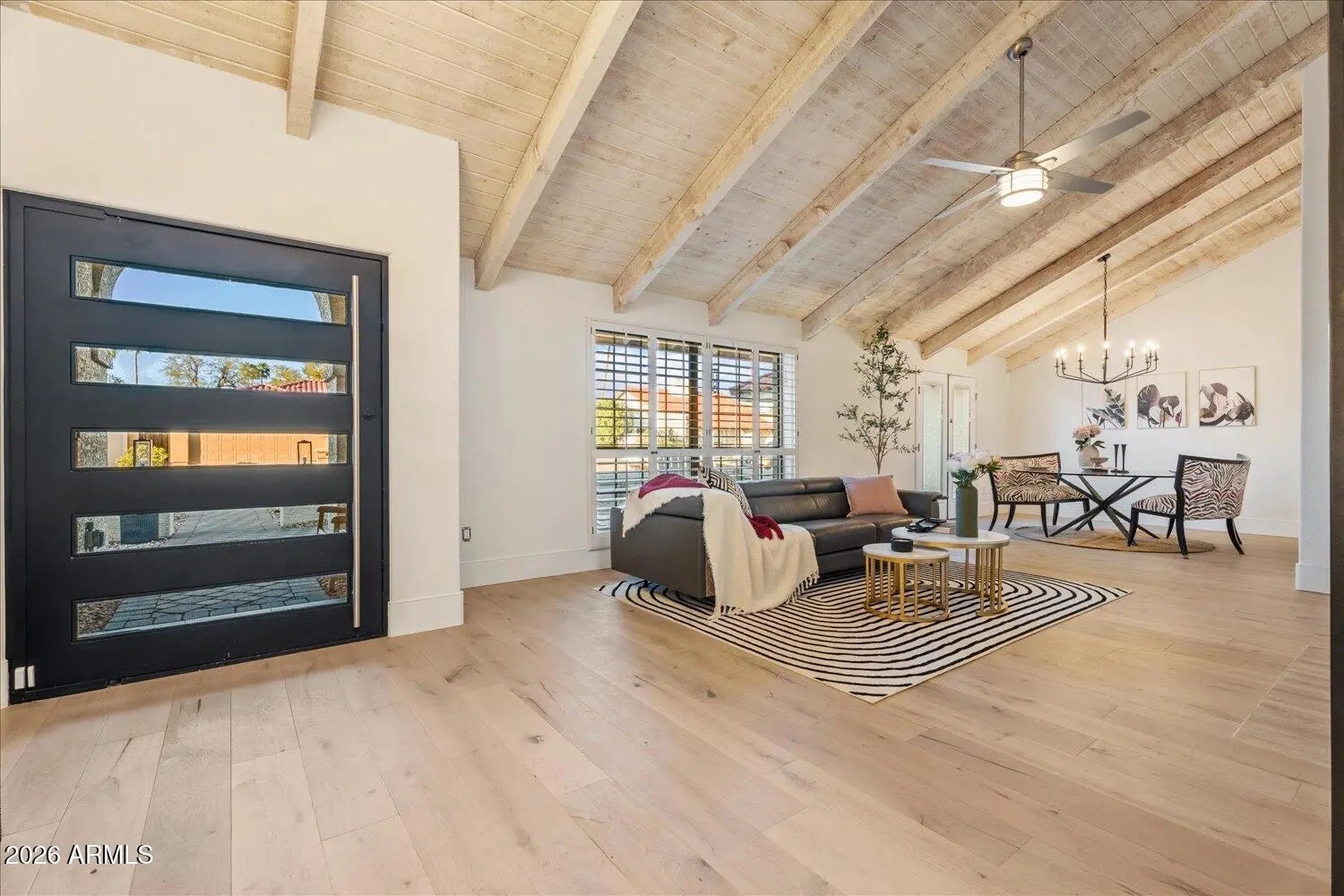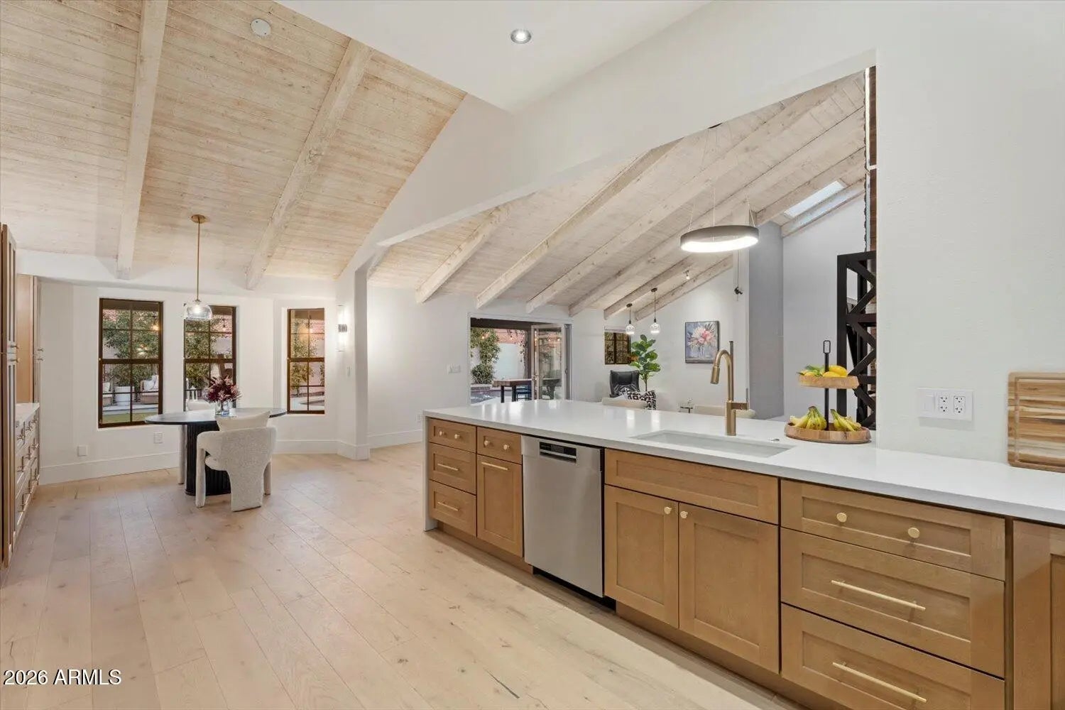 Remarkable McCormick Ranch renovation beautifully blends modern, elegant interior with a spectacular pool area perfect for entertaining and relaxed livability. near tons of shopping/dining. Property has an open floorplan w/ towering, white-washed vaulted ceilings, exposed beams with living area flowing easily to the back yard/pool area. Must see! Recent reno: Kitchen opened with wood-tone shaker cabinets and quartz counters/waterfall, Engineered wood flooring, master bath - custom tile floor and showers, both secondary bath/showers with honed marble counters. Other features: Induction cooktop, Wolf oven, Bosch Series 800 dishwasher, plantation shutters, custom marble flooring, chic light fixtures, upscale ceiling fans, new roof 2014 & pool reno 2013