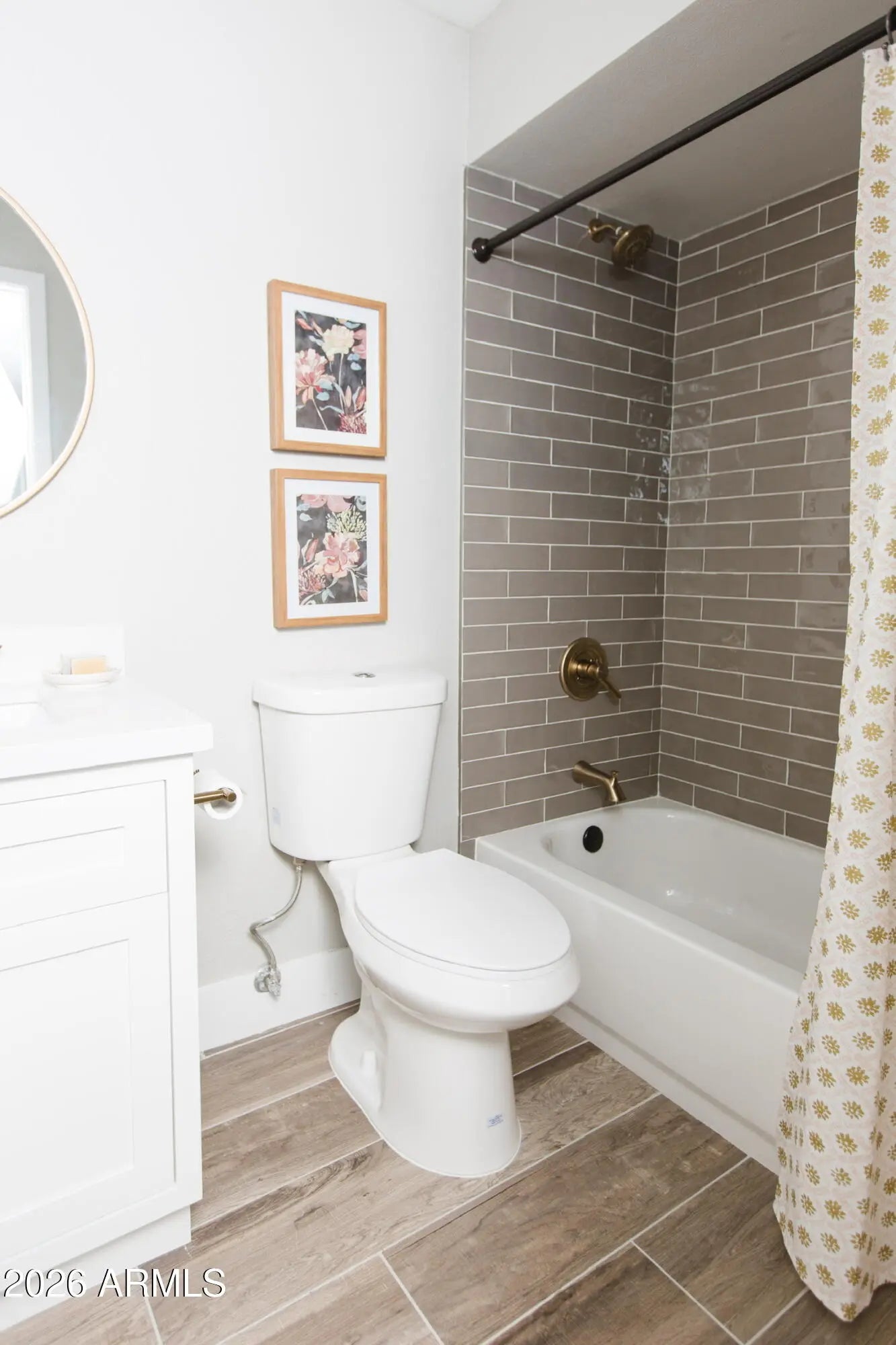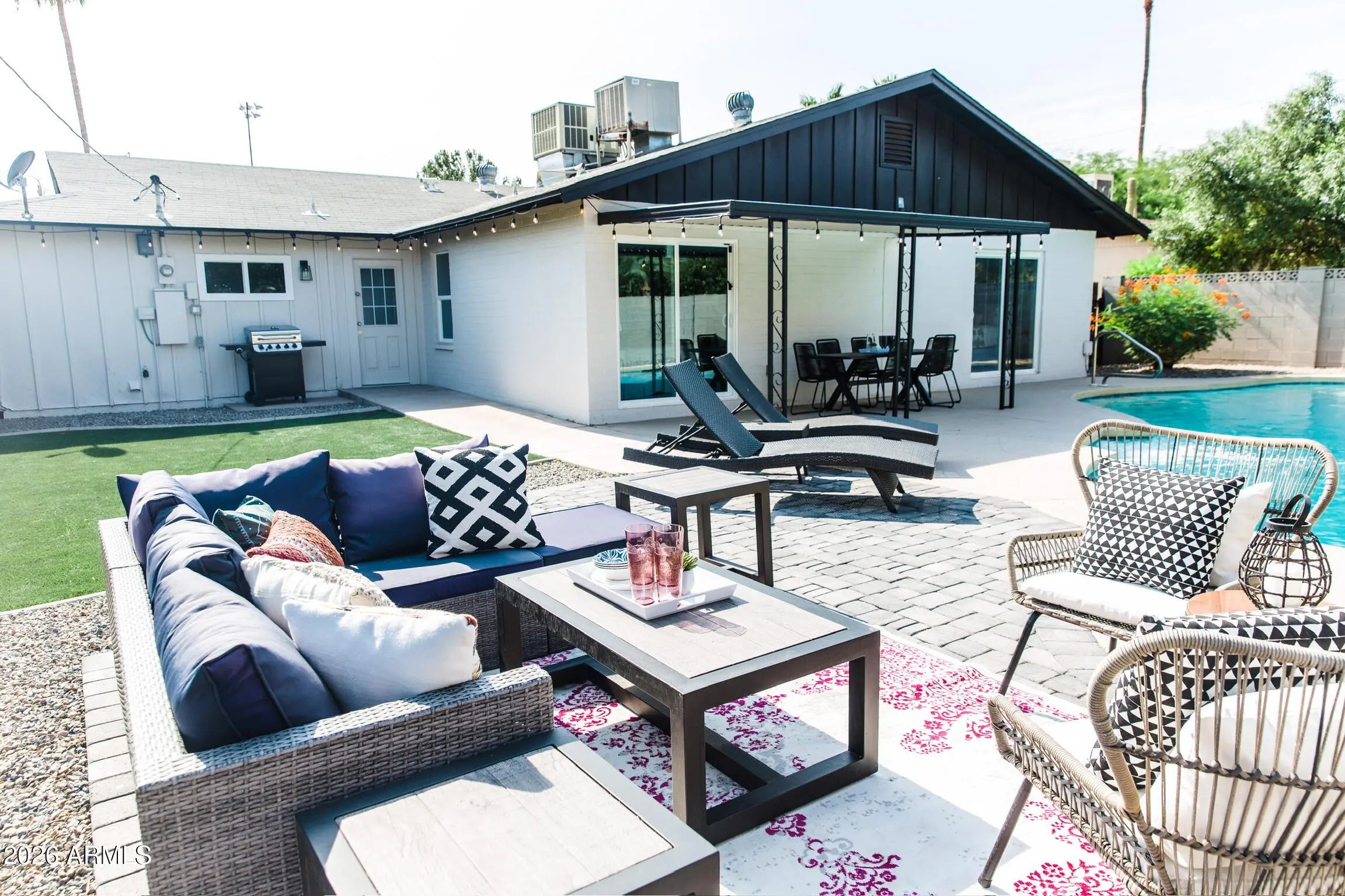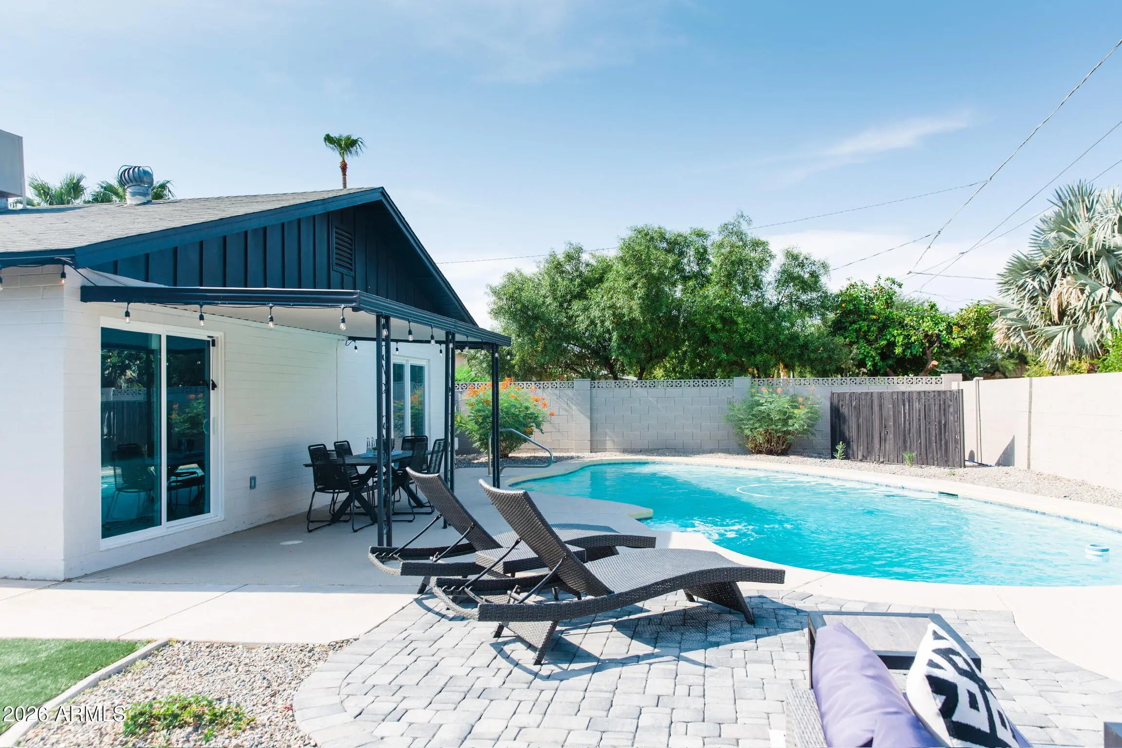 Come and see this fabulously updated home in Scottsdale with a garage and pool! Neutral paint colors, wood look tile flooring, recessed lighting and modern fixtures throughout make this home feel fresh. Guest bath has custom shower tile wall and dual flush toilet. Primary suite features sliding glass door with direct access to backyard oasis. En suite bathroom includes custom tile and glass shower surround. Backyard is perfect for relaxing with low maintenance turf, covered patio, and generous pool and seating area. Make this your home today! (Property does NOT come furnished. It was staged for photos.)