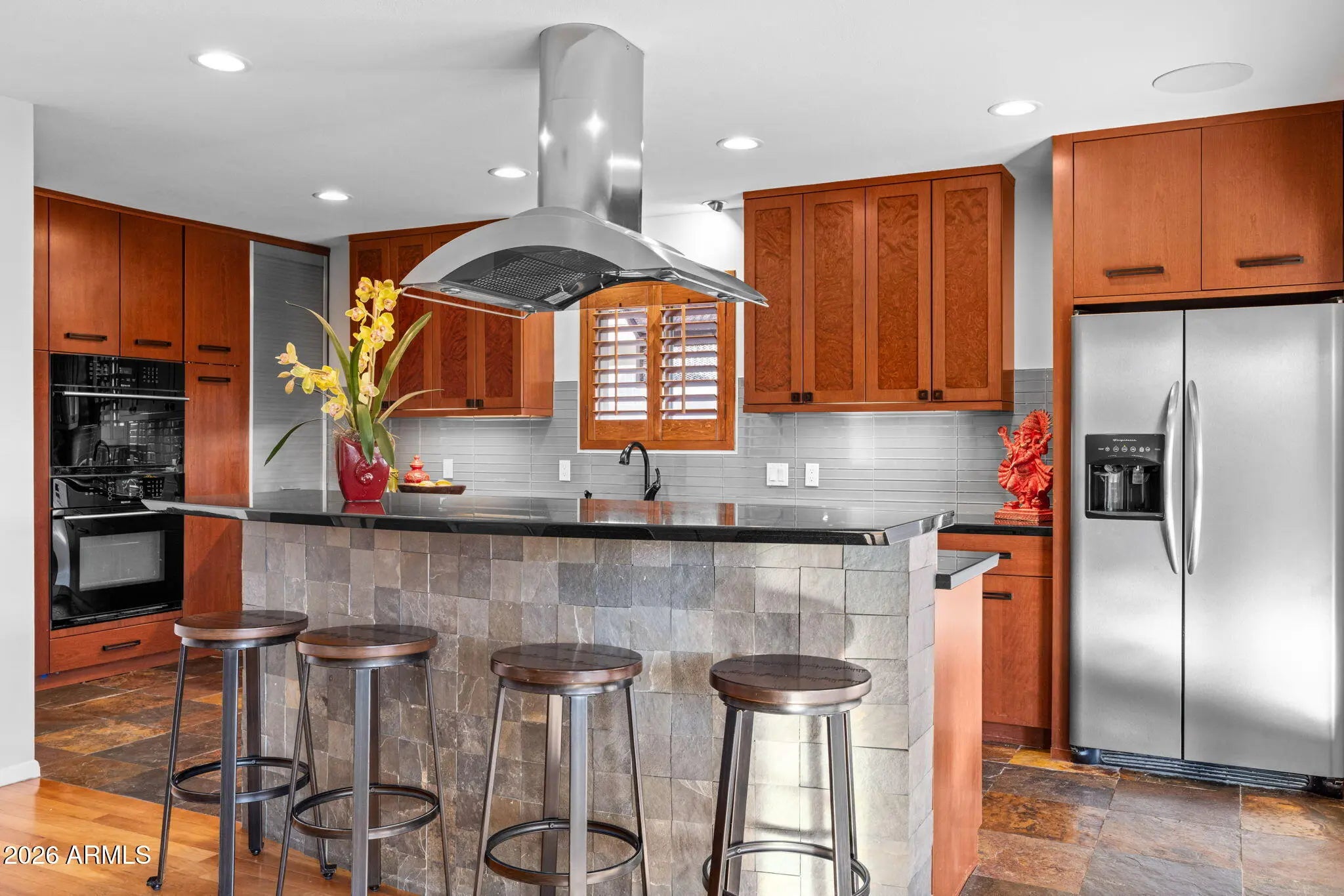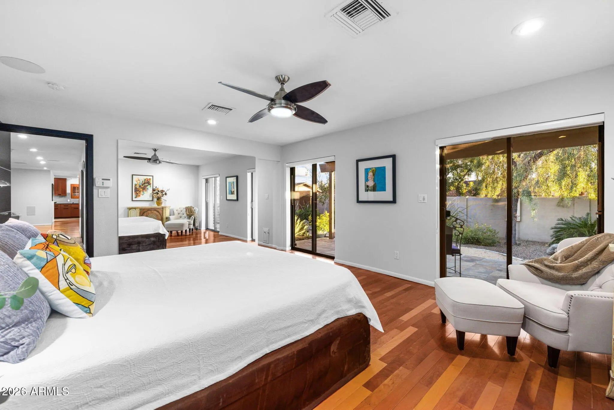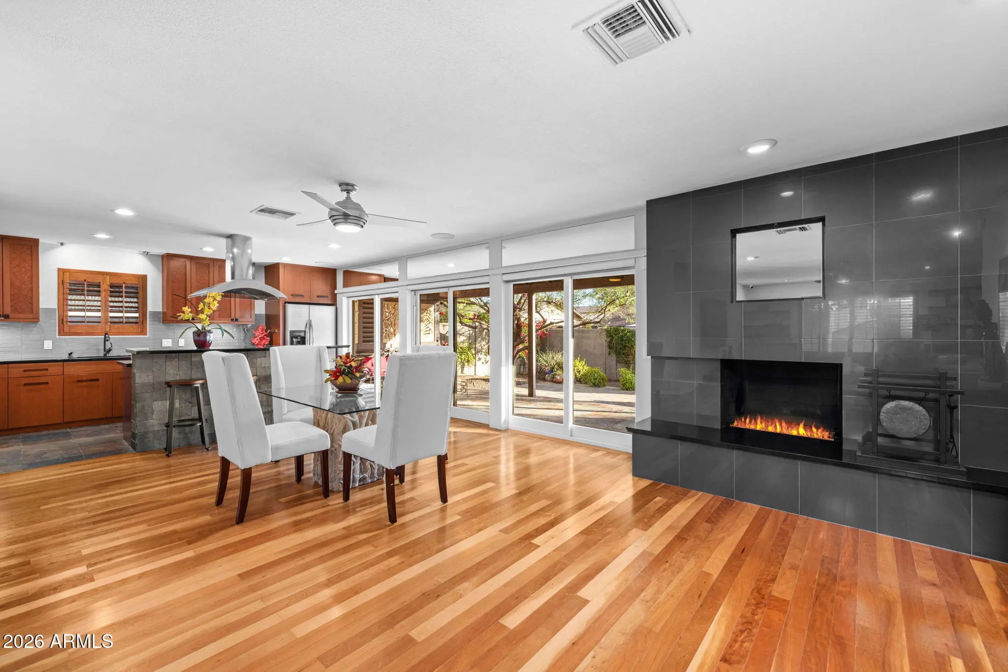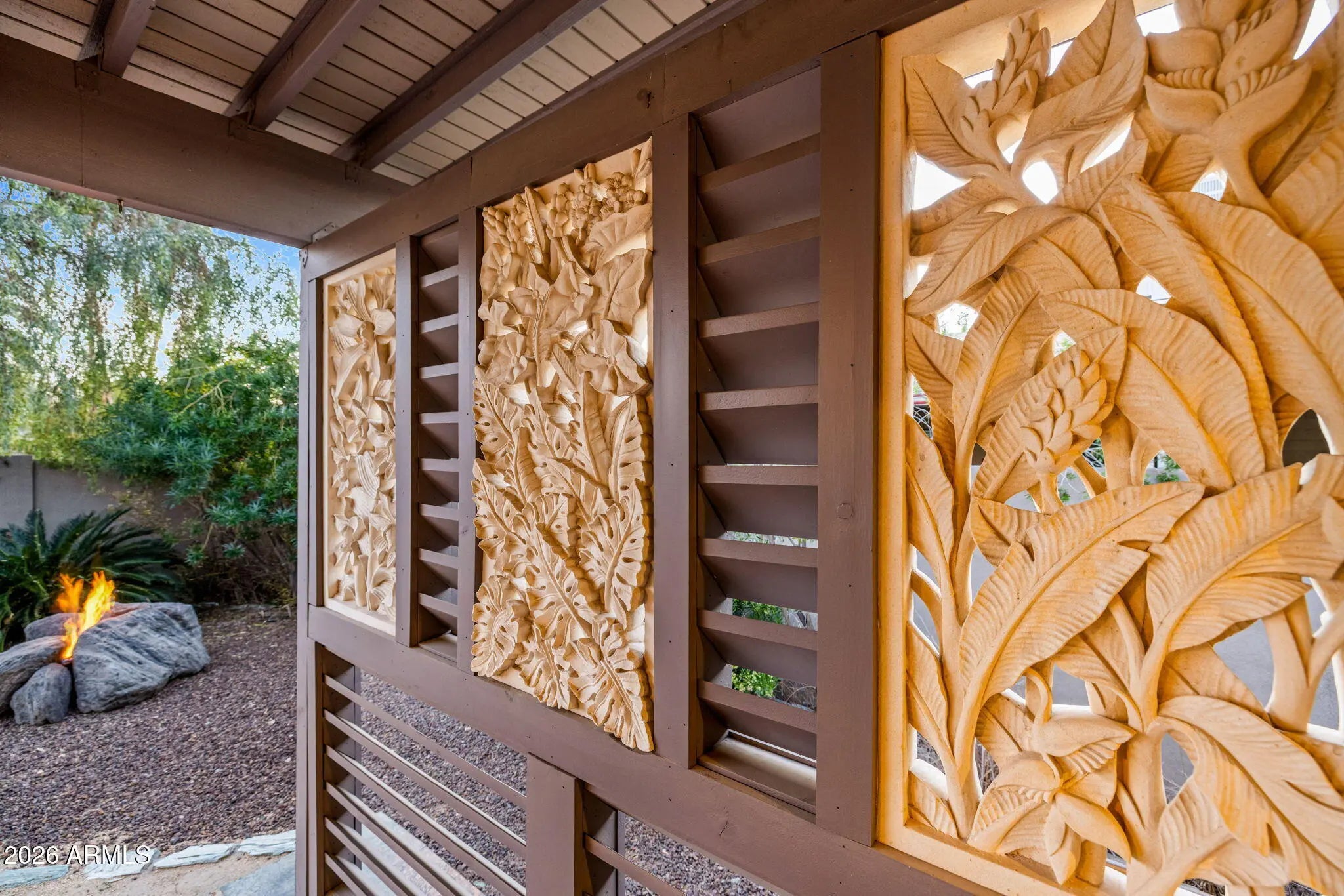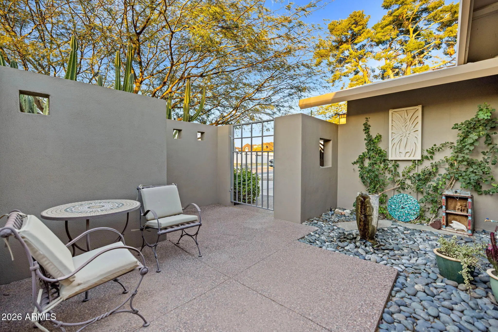 Completely reimagined by an award-winning designer using timeless finishes and distinctive architectural details, every inch of this home is stunning. Access your private retreat through the gated courtyard and beautifully crafted entry door. Inside, you will find a spacious interior rich with designer touches, cherry wood flooring, and custom upgrades throughout. The front room features built-in cabinetry and opens seamlessly to an expanded living area anchored by a contemporary gas fireplace and a wall of windows overlooking the backyard. The gourmet kitchen is both beautiful and functional, equipped with double ovens, a pantry, appliance garage, large island and gorgeous European cherry cabinets with mahogany burl wood inlays. The primary suite is a true sanctuary, complete with a generous walk-in closet and French doors leading to a private covered patio. The award-recognized bathroom showcases an exceptional wet-room design with a soaking tub, separate shower, dual sinks, and remarkable craftsmanship. One of the four bedrooms has been transformed into an expansive secondary closet, ideal for a substantial wardrobe. Equally impressive, the outdoor living space has also received industry recognition. Mature landscaping, privacy screens, and expansive covered patios create a serene setting enhanced by a dramatic lava-rock gas fire pit, a custom metal art screen, and hand-carved stone art imported from Bali. This exceptional home is perfectly suited for the discerning buyer seeking refined luxury in the heart of North Central Phoenix. Please refer to the Custom Features List in the Documents tab for a complete overview of upgrades.