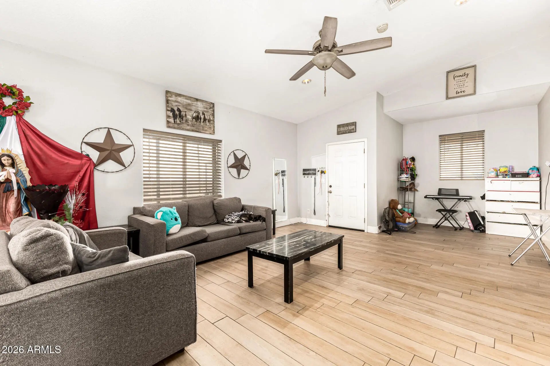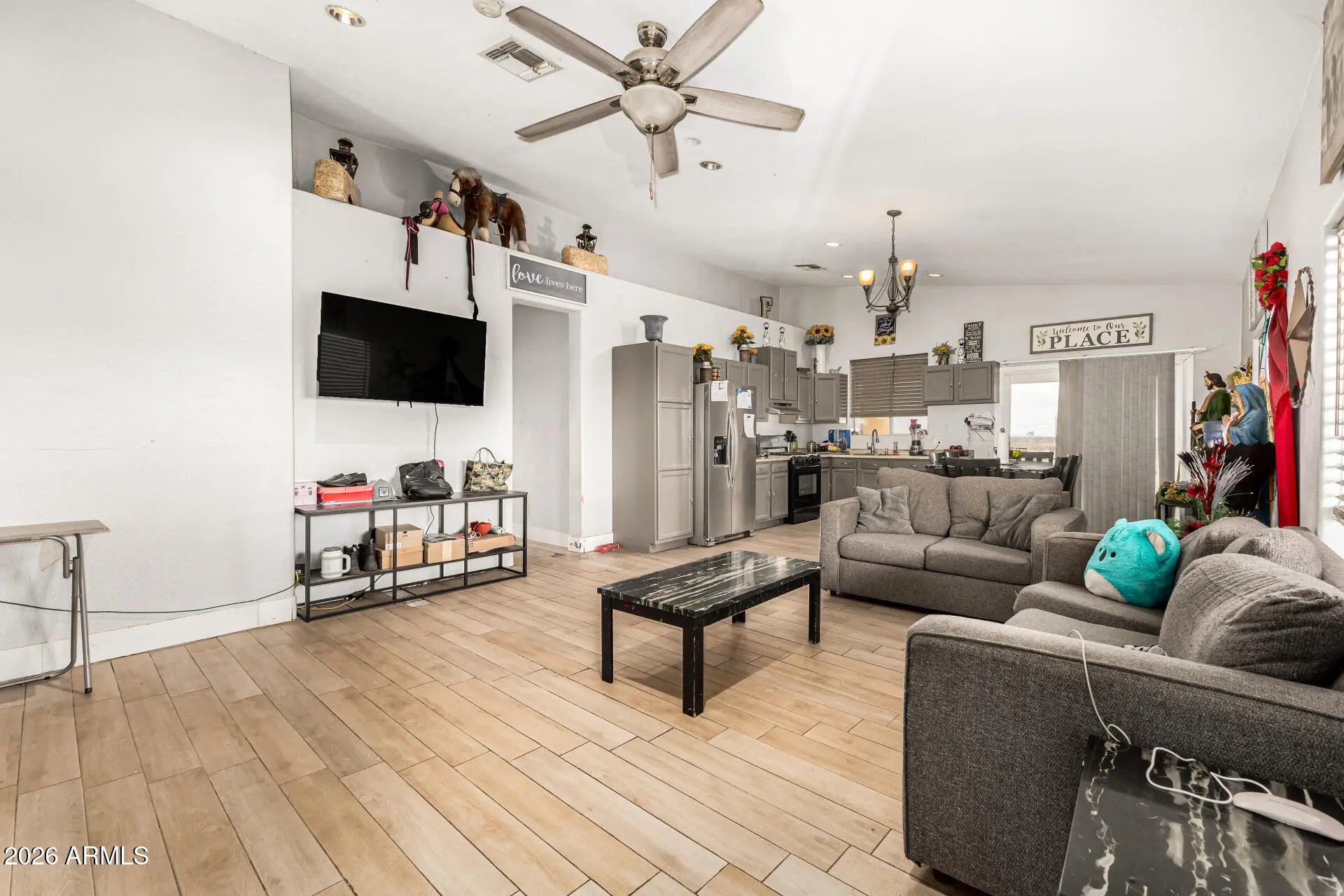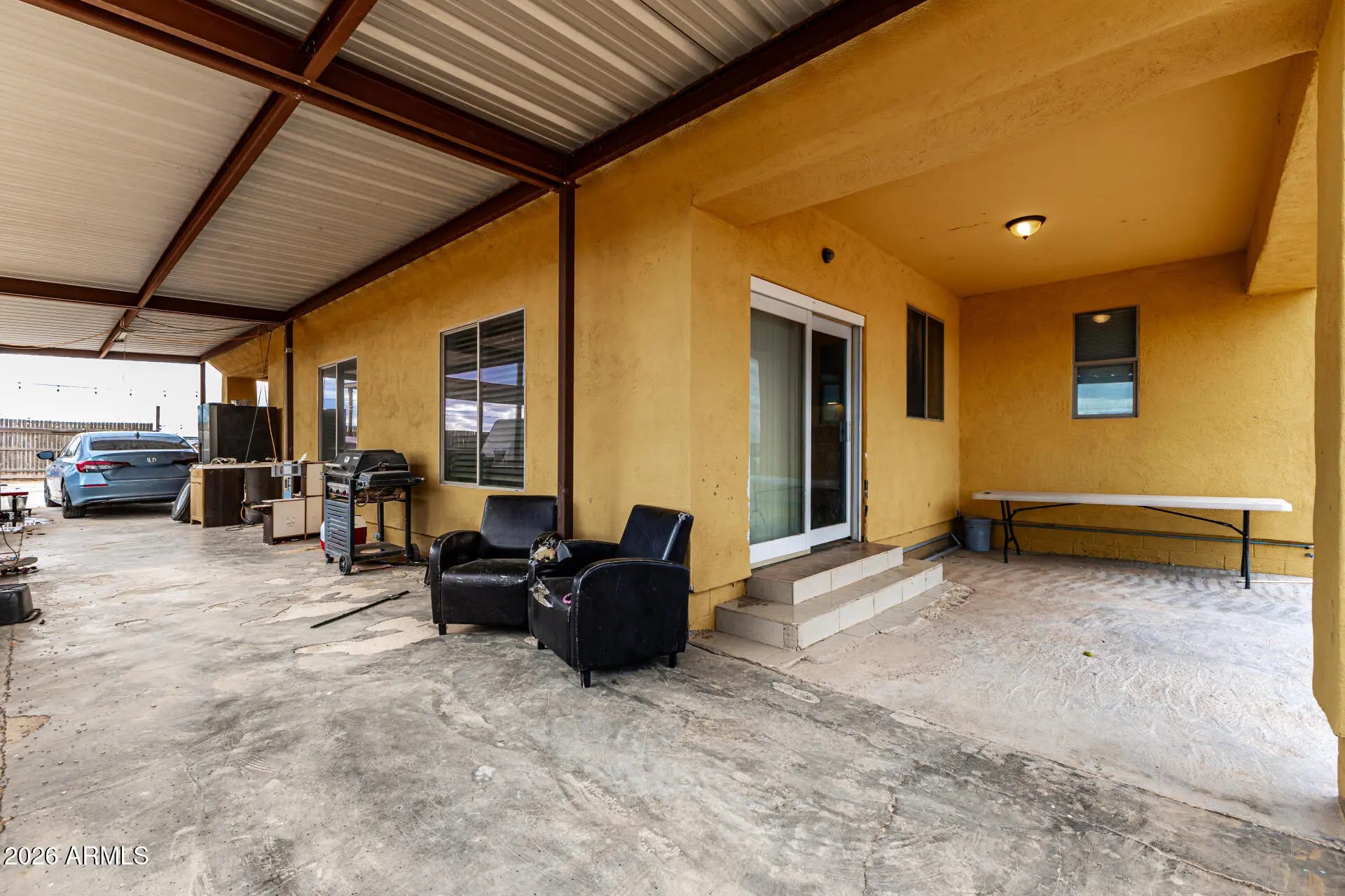Start creating lasting memories in this 3-bedroom horse property designed for comfort and possibility! A 2-car garage plus an additional carport provide plenty of parking and flexibility. Inside, you'll love the wood-look floors, vaulted ceilings, and a spacious great room perfect for entertaining or relaxing nights in. Kitchen features essential appliances, abundant cabinetry, and generous counter space ready for everyday meals or weekend gatherings. Primary bedroom offers a private bathroom and walk-in closet. A versatile bonus room makes an ideal den, office, or extra storage space. Out back, a covered patio invites you to unwind with your favorite beverage while enjoying wide-open space with endless potential to grow, personalize, and truly make it your own. Come make it yours today!