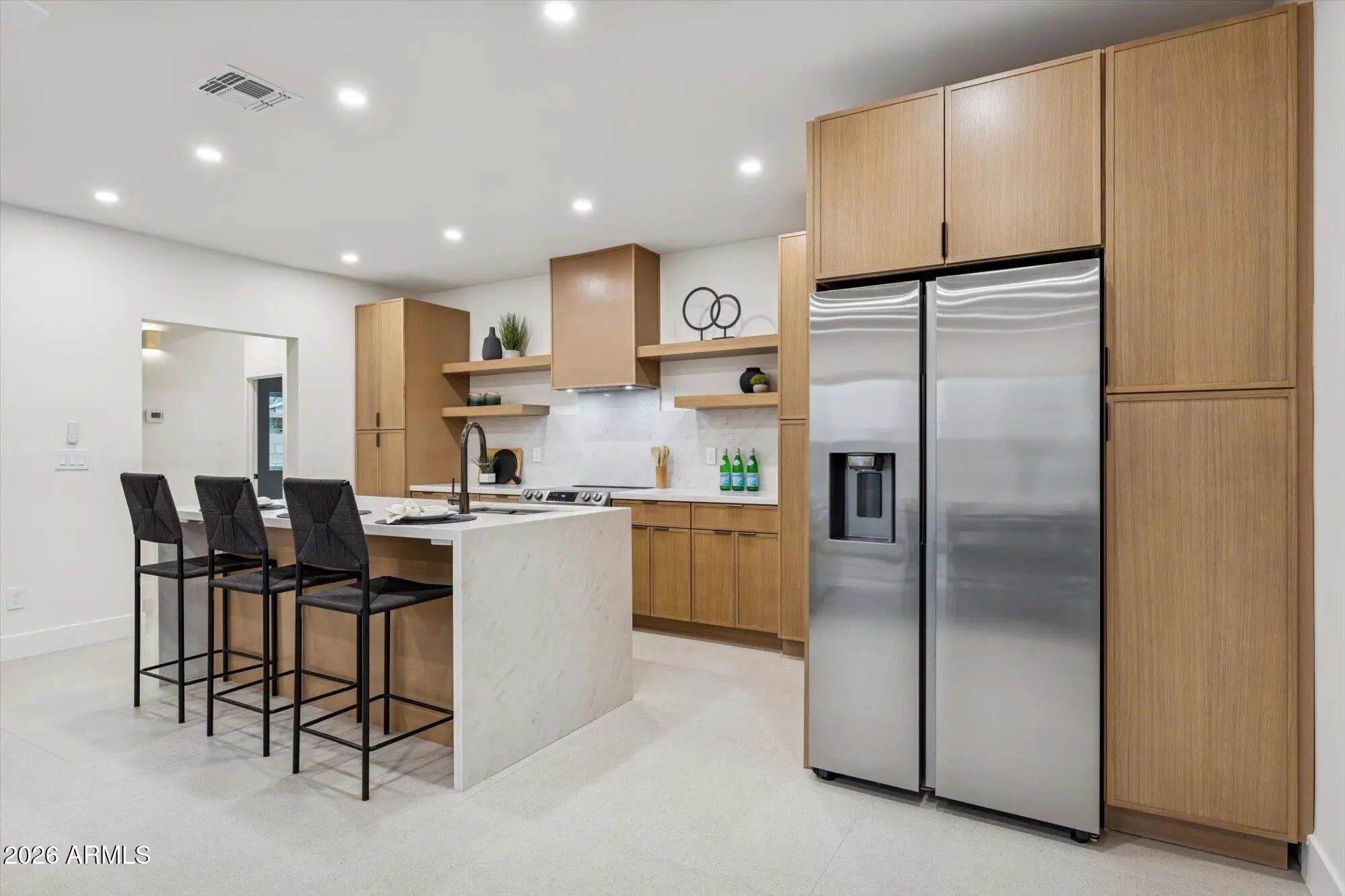 Fully reimagined this home lives like a new build, completely torn down and rebuilt except for one block wall. Every surface has been thoughtfully redesigned with clean architectural lines and warm modern finishes. The private courtyard welcomes you with curated desert landscaping. Inside, the open-concept layout features white oak cabinetry, quartz countertops, a large island, and sleek stainless steel appliances. This home features three ample bedrooms and two bathrooms with designer tile and fixtures. With all new systems, finishes, and design throughout, this is essentially new construction without the new-build price tag.