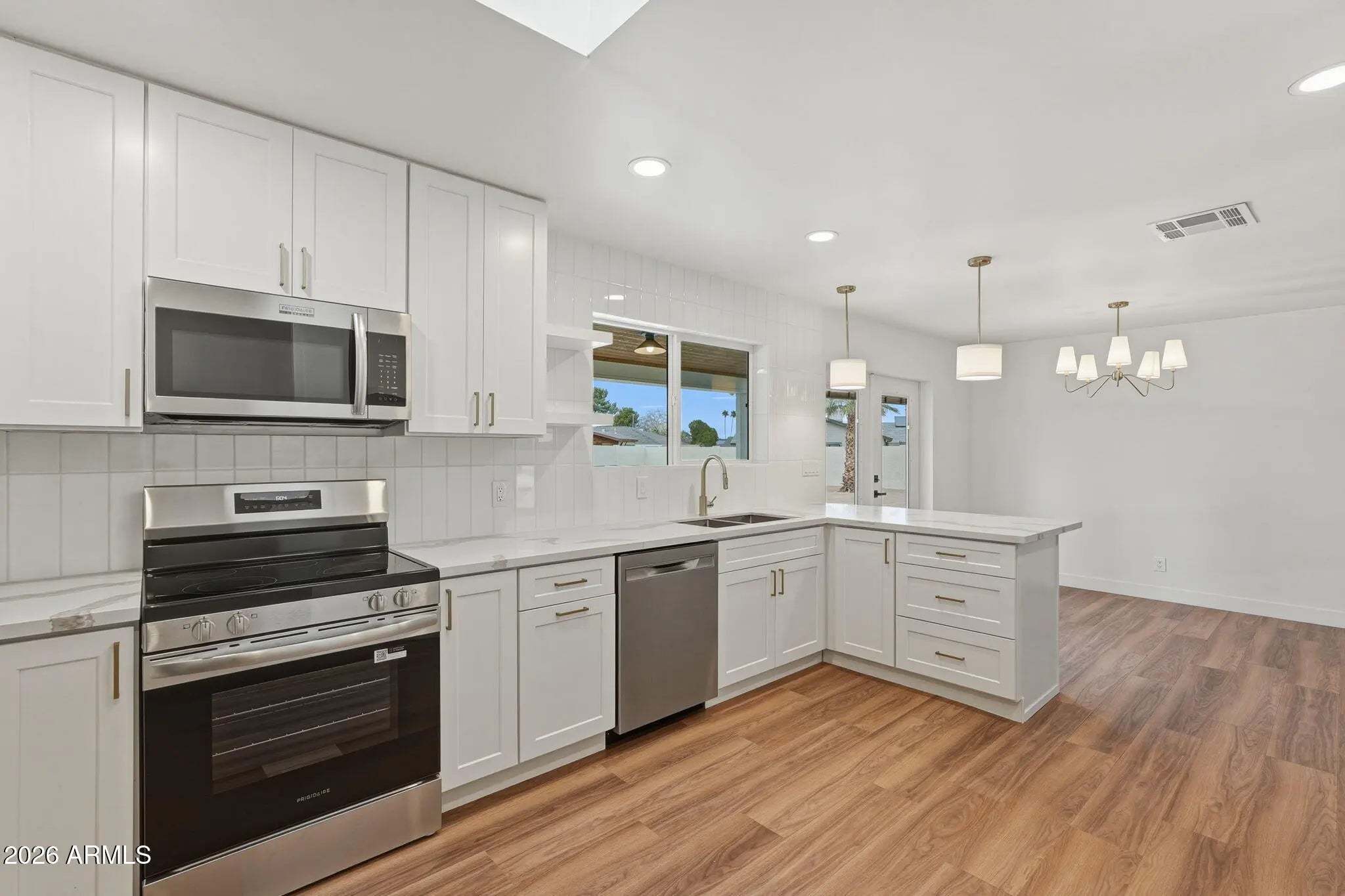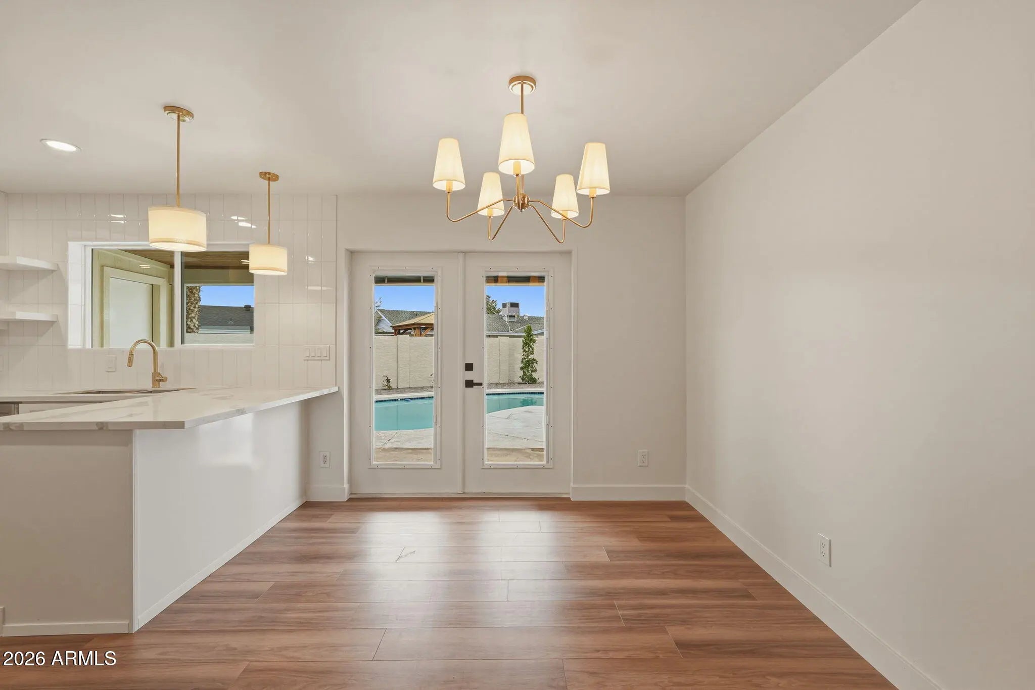 Immaculate and completely renovated 4-bedroom, 3-bath home in Candlelight Estates with no HOA, ideally positioned on an oversized cul-de-sac lot. This 2026 remodel features a thoughtfully redesigned kitchen with custom white shaker cabinetry, updated backsplash, new stainless-steel appliances, sleek countertops, and luxury LVP wood flooring throughout the main living areas. Fresh interior paint, new baseboards, recessed lighting, updated plumbing and lighting fixtures, and new interior and exterior doors create a cohesive, elevated finish from start to finish. Hall bedrooms include new carpet, and added hallway cabinetry provides extra storage and functionality. The spacious split floor plan offers comfortable single-level living with no interior steps. A newly added third bathroom with direct pool access enhances convenience and flexibility. Step outside to your private backyard retreat complete with a sparkling blue pool, refurbished pool pump, new pavers, RV gate and massive side yard, refreshed landscaping, and a covered patio featuring a beautiful tongue-and-groove ceiling--perfect for relaxing or entertaining. Move-in ready and conveniently located near freeways, top-rated schools, parks, trails, golf, dining, and shopping, this exceptional Mesa home delivers space, style, and location all in one.