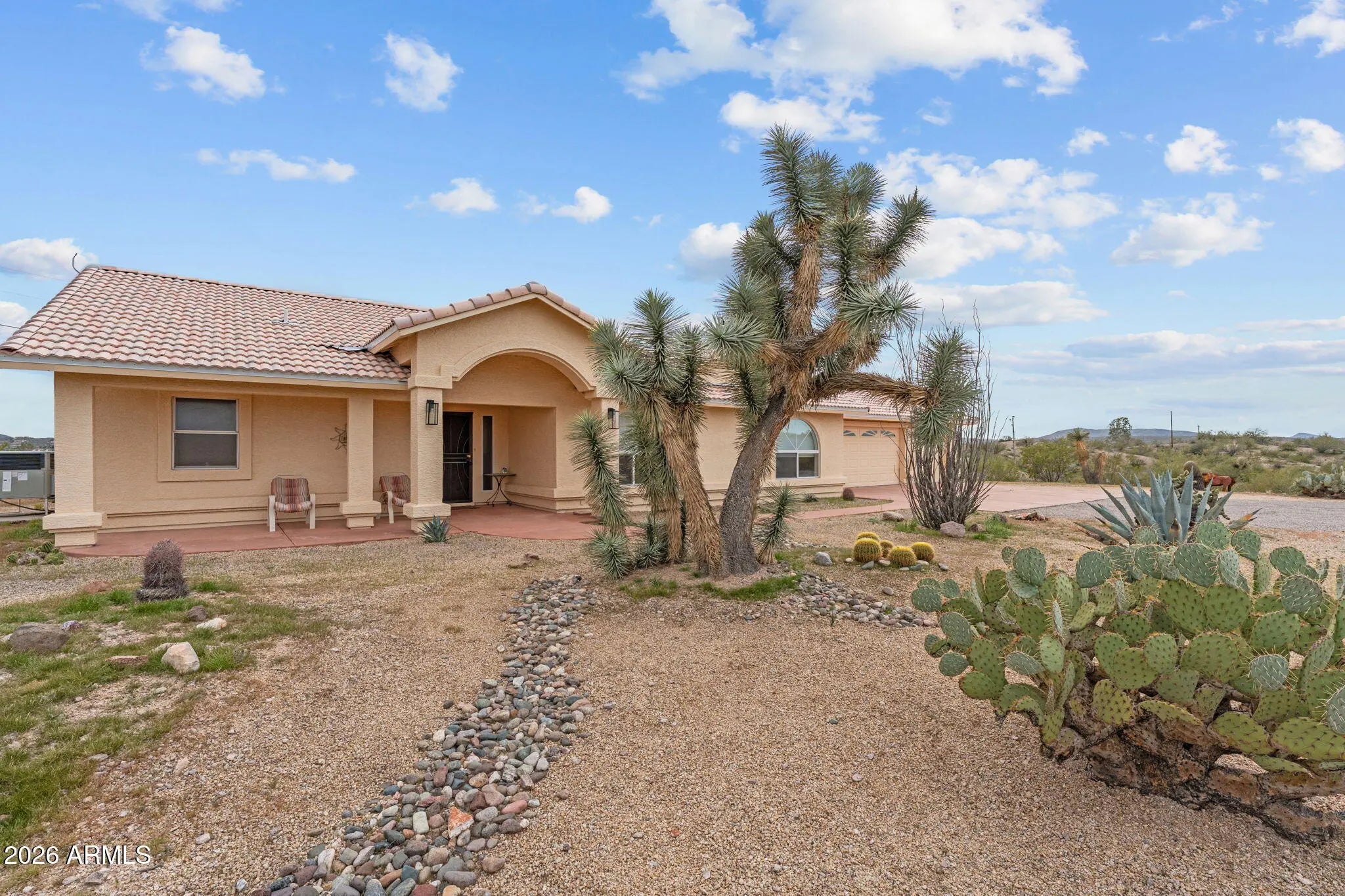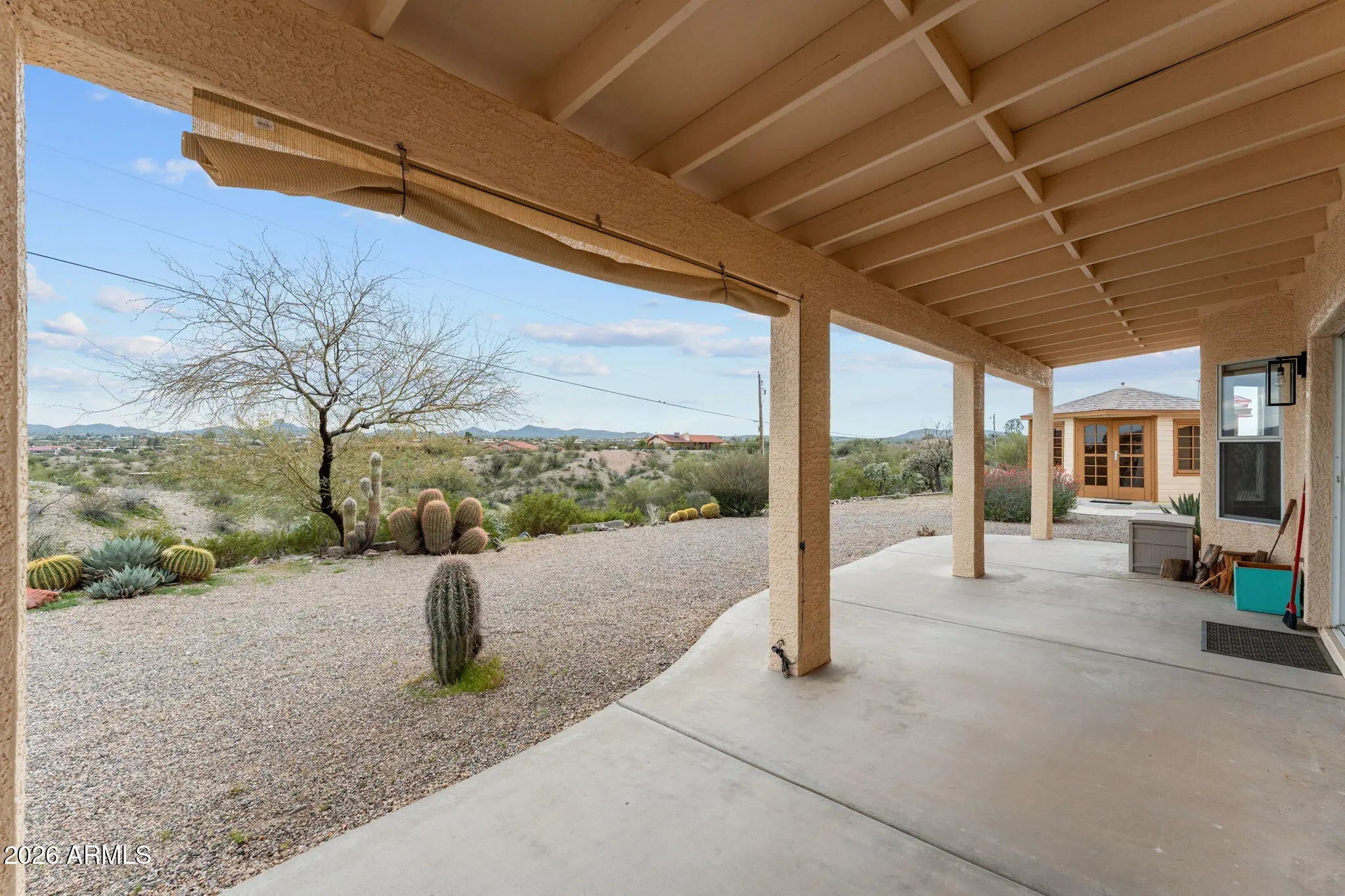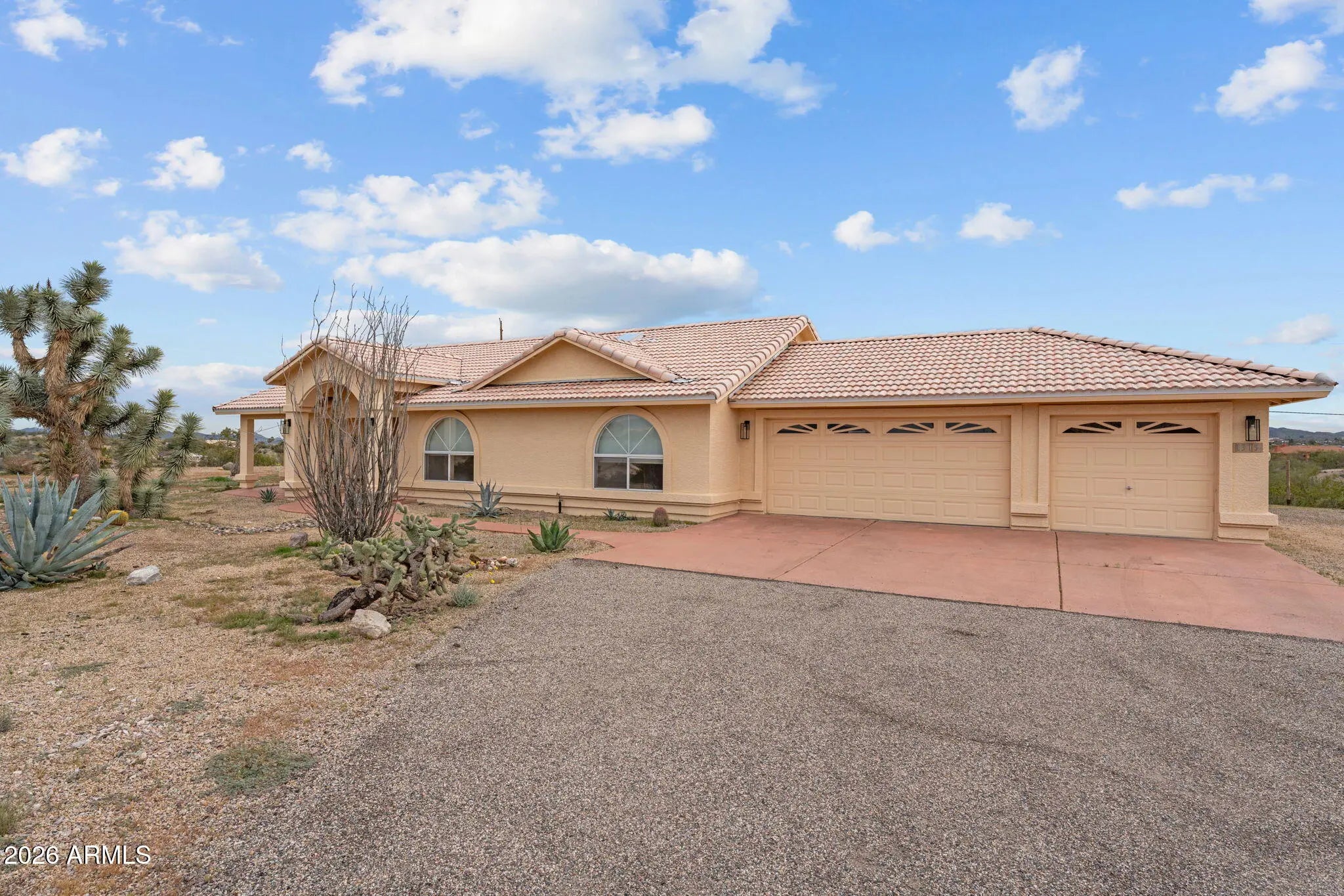 Set on just under two hilltop acres, this private desert retreat captures breathtaking 360-degree views that truly set it apart. Take in panoramic scenery of the Bradshaw and Weaver Mountains to the north and east, along with stunning Vulture Mountain views to the south. From this elevated vantage point, the sunsets are simply unforgettable. The thoughtfully designed 3-bedroom, 2-bath home features a desirable split floor plan, with the primary suite privately situated on one side and guest bedrooms on the opposite wing. A spacious great room anchors the home, enhanced by large windows and glass doors that open to covered patios at both the front and rear--creating seamless indoor-outdoor living ideal for Arizona evenings.Recent upgrades add tremendous value and peace of mind, including a new roof, new HVAC system, and fresh interior paint, making this home move-in ready. Inside, you'll also find generous closet space, a walk-in pantry, dedicated laundry room, and abundant storage throughout. The oversized three-car garage offers plenty of room for vehicles, toys, and equipment, plus additional space for RV parking. Tucked just behind the home is a charming octagon-style shed complete with tile flooring and French glass doors--perfect for an outdoor kitchen, creative studio, hobby shop, or private retreat space. With peace, privacy, spectacular views, modern updates, and even space for a small horse setup, this hilltop property delivers the best of relaxed desert living.