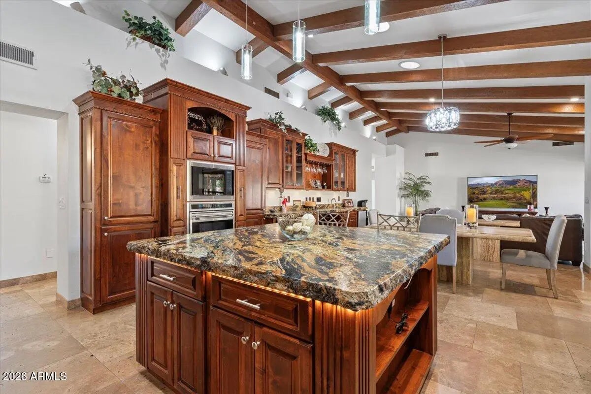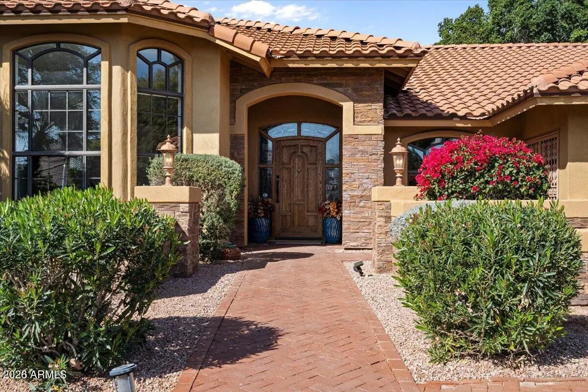 Sprawling single level 4,000 sq ft, 5 bedrooms/5 baths, cul-de-sac lot providing a sense of privacy and exclusivity. Thoughtfully designed floorplan provides both communal gathering spaces and completely private living quarters with multi-generational living ensuite or executive office with separate entrance. The heart of the home boasts high-end appliances, an oversized island, wet bar, custom cabinets, granite, expansive family room, and 2nd ensuite bdr. A separate large, dedicated room offers a media room/workout facility or playroom. The resort-style backyard oasis boasts a sparkling pool complete with a rock waterfall/slide, built-in BBQ, fireplace, spacious areas. Solar tubes for natural light. Views of So Mountain with access to trails/hiking/biking/A+ schools/restaurants/shopping.