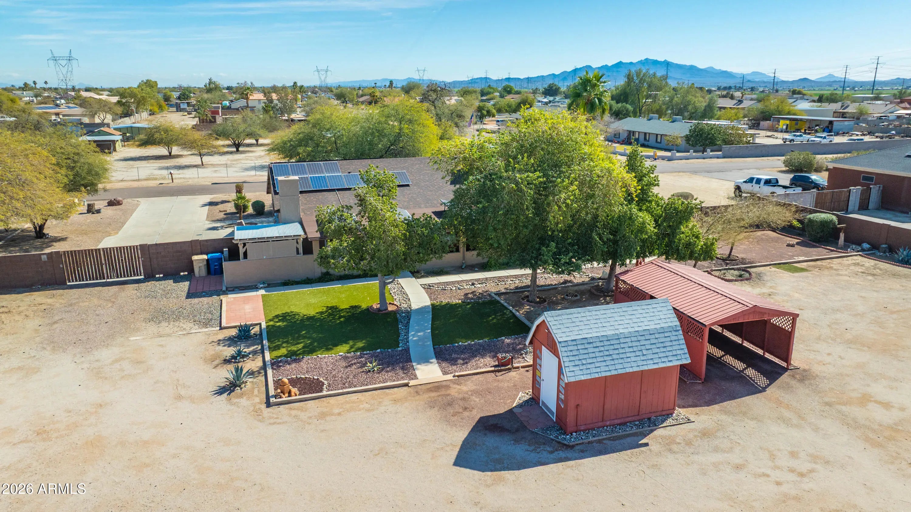 Beautiful 4 bedroom 2 bath home on one acre fully fenced and landscaped with workshop, garden shed, RV hook up and carport in a sought after neighborhood in the city of Buckeye close to all amenities. Family room, living room with cozy fireplace, eat in kitchen, separate pantry, inside laundry room, spacious bedrooms with walk in closets, covered patios in front and back. Natural custom wood cabinets throughout. RO and soft water system. Updated sprinkler system front and back. Pull down sun shades on back patio complete with outside cabinetry. Large mature trees. Open and spacious backyard with plenty of room to build horse pens or for backyard animals. Gorgeous mountain views in a great location!