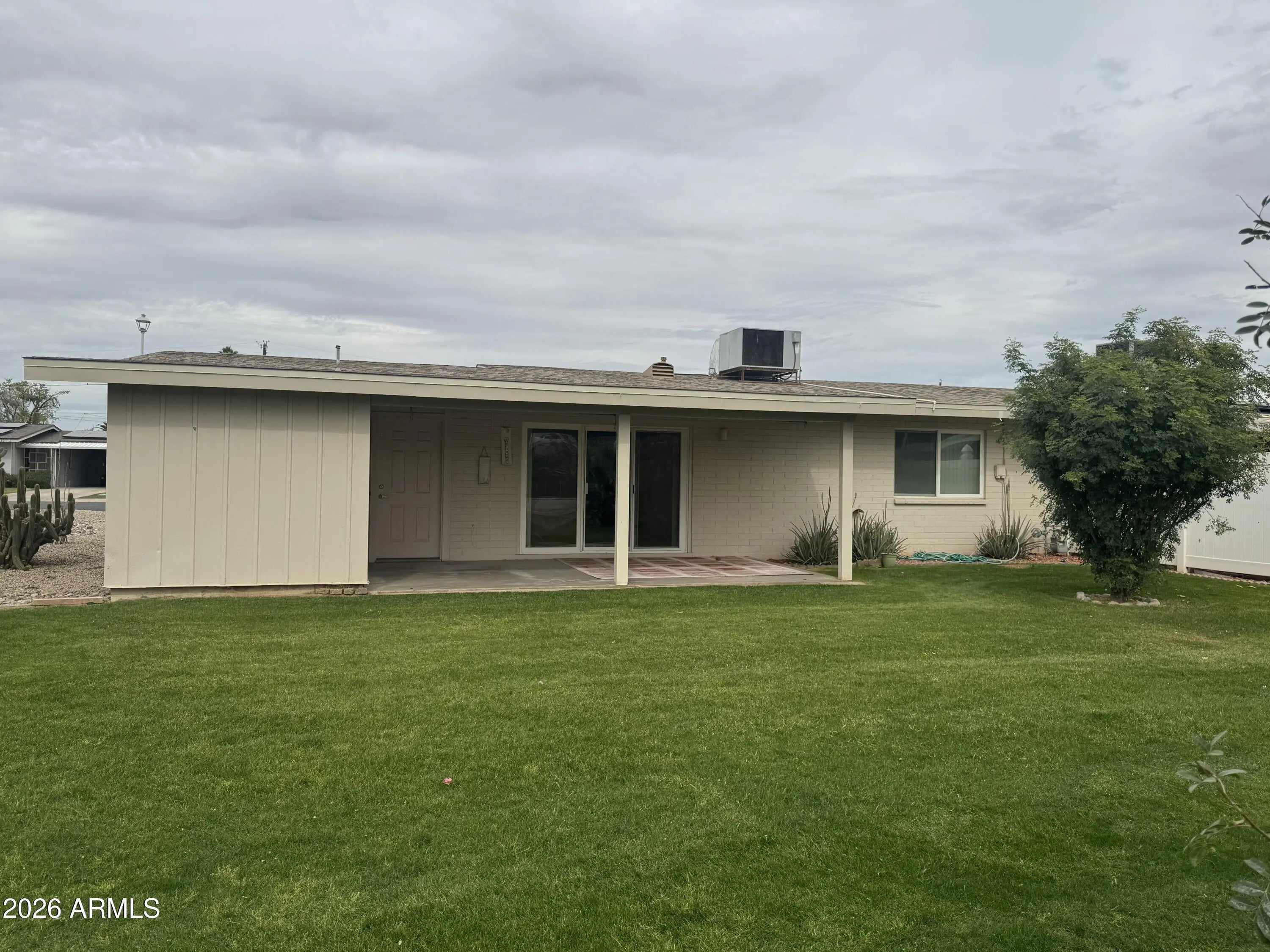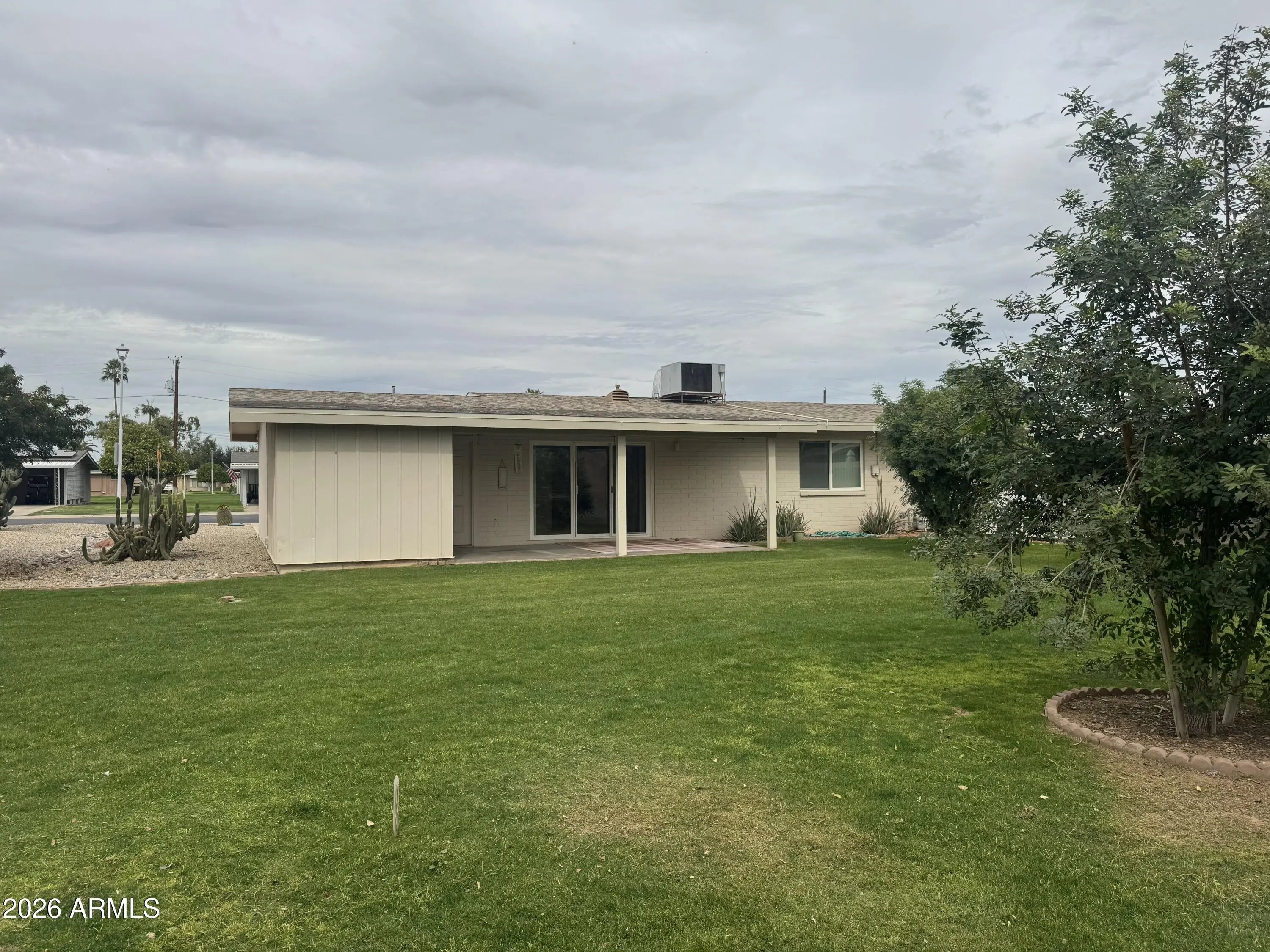 Enjoy this quiet, cozy home in this welcoming Sun City adult (55+) community. The front yard features mature desert landscaping with beautiful views of serene greenbelts and plenty of citrus trees. Relax on the spacious patio--perfect for morning coffee, reading, or chatting with neighbors. This Gemini Twin-style home includes two comfortable bedrooms, two full bathrooms, and an open, inviting layout. The dining area flows into an eat-in kitchen, and the large laundry room provides a working sink, plenty of storage, and flexible space. The one-car garage adds parking security or a place to store your utility or golf cart. The HOA covers roof repair and maintenance and provides access to numerous amenities, activities, and community resources that make Sun City such a desirable place to li