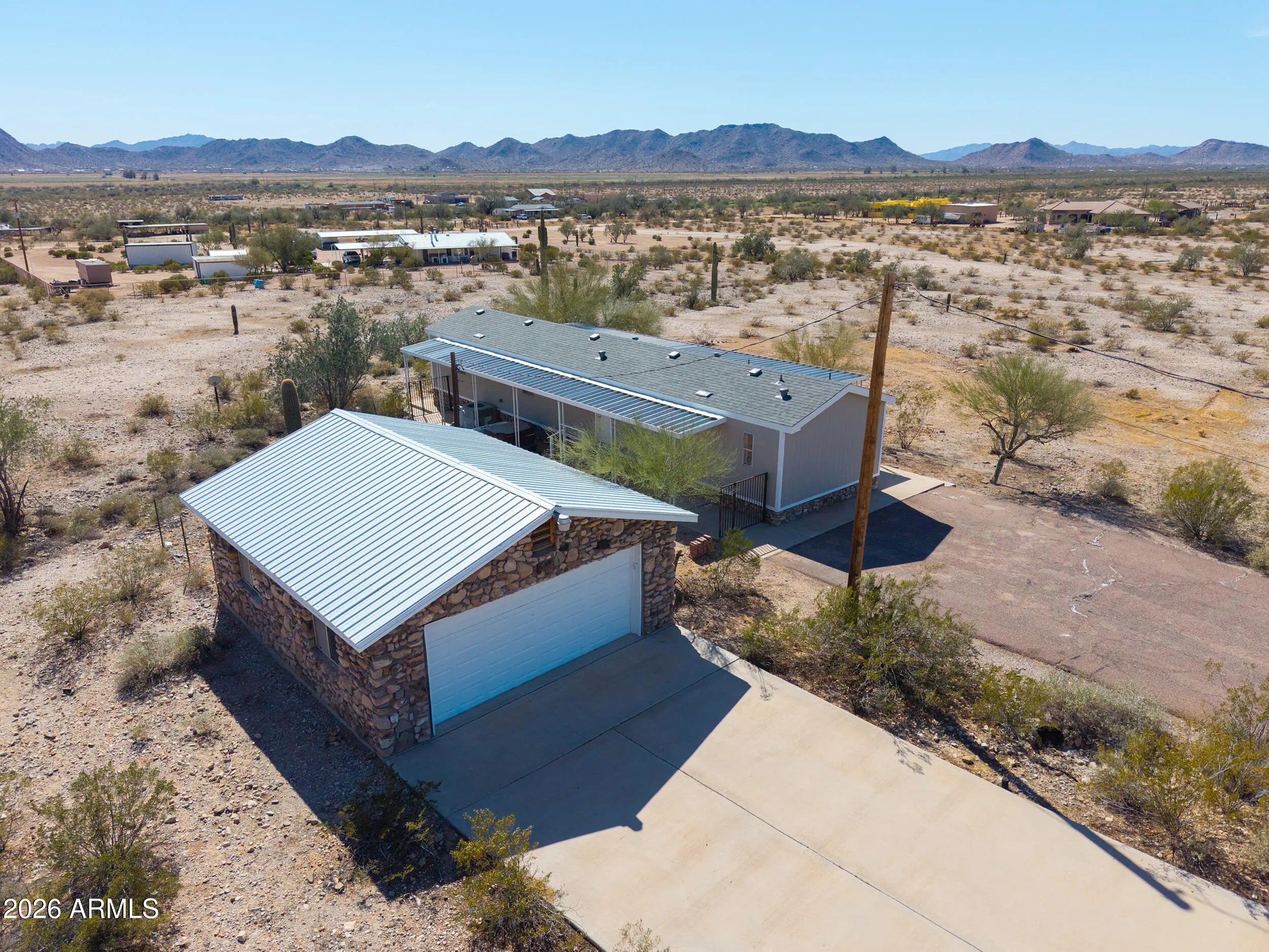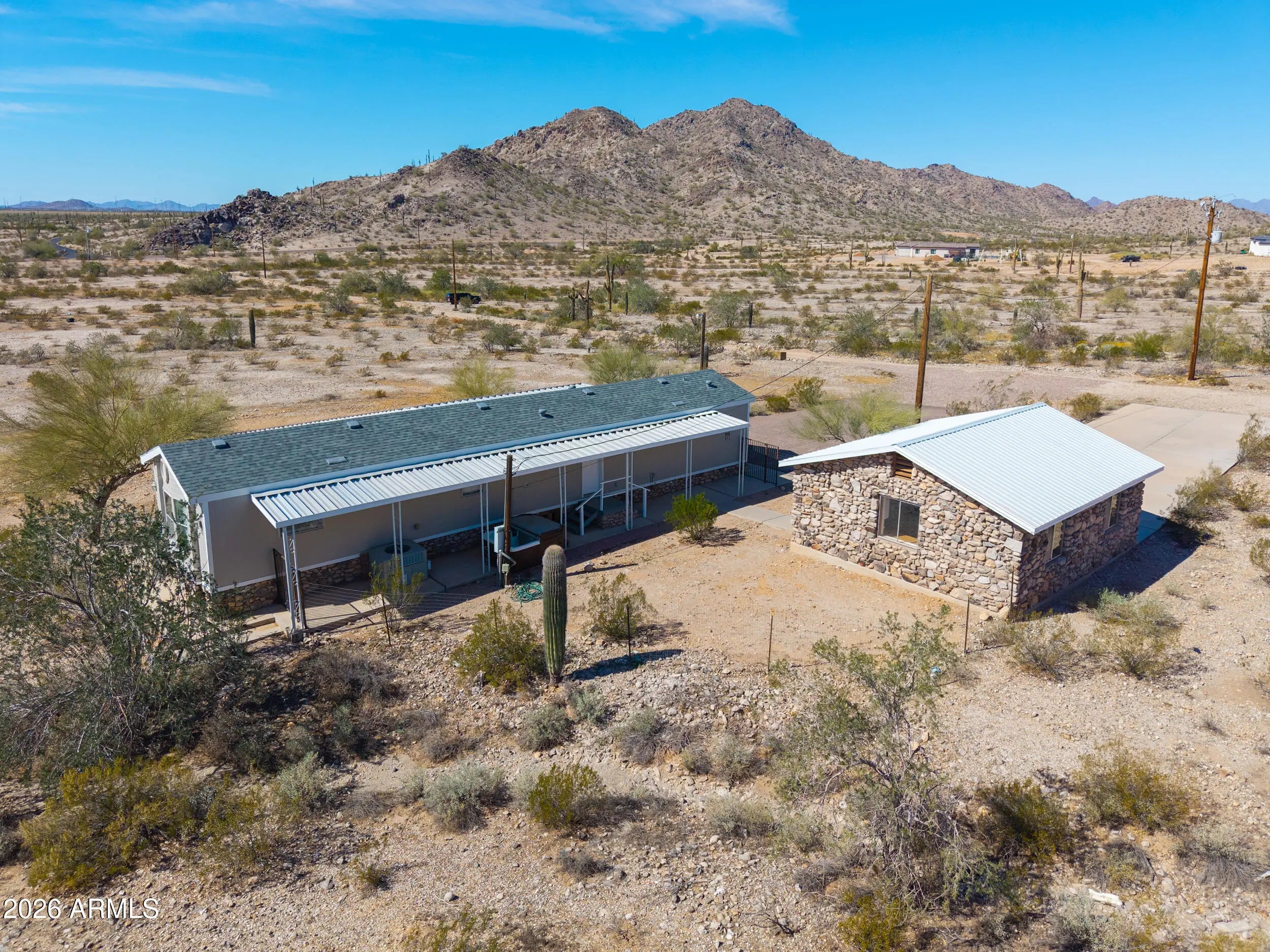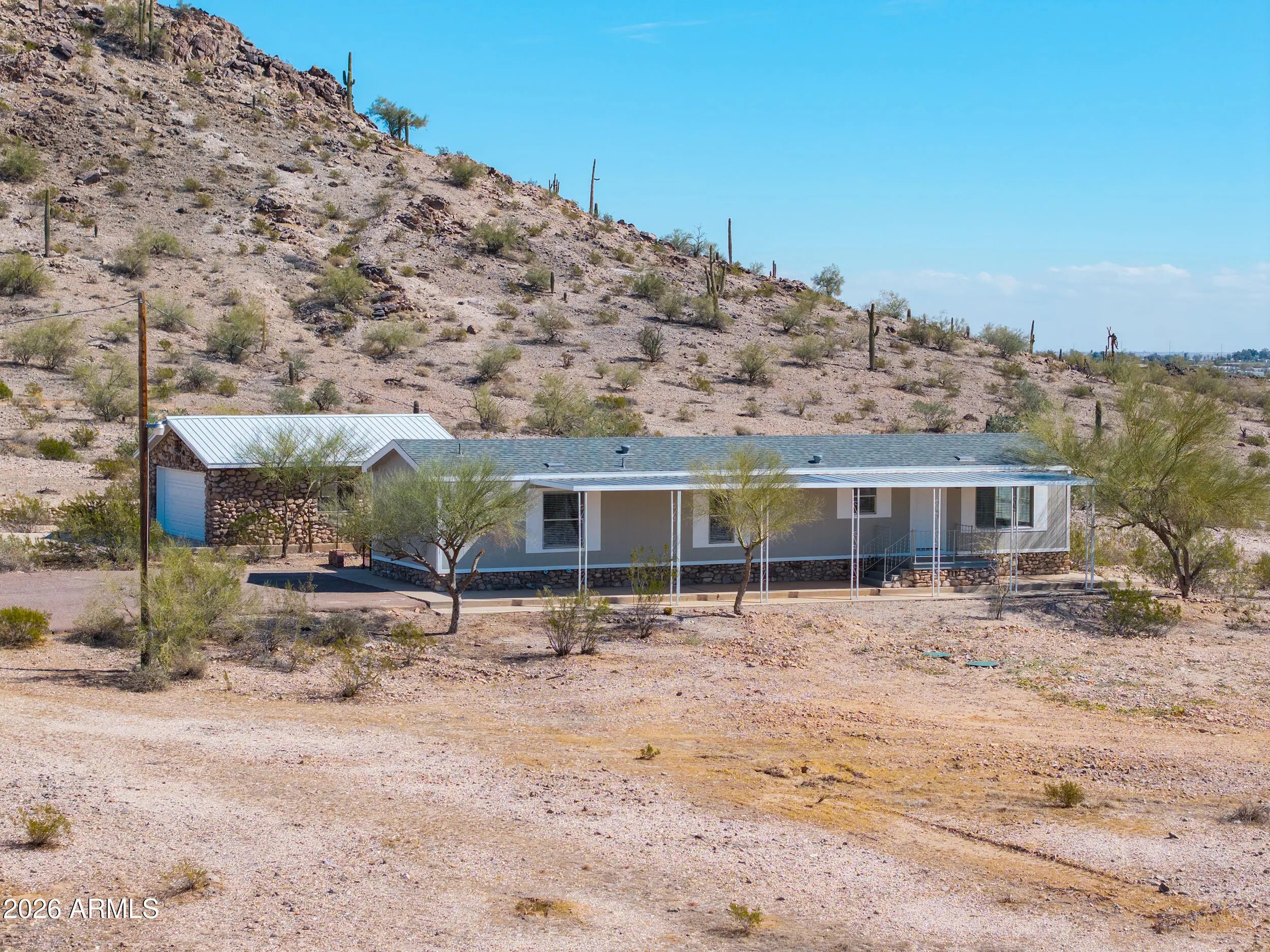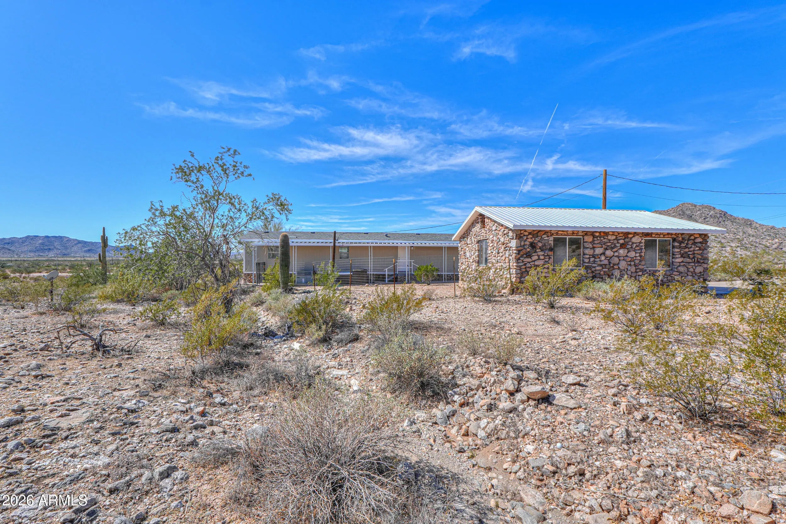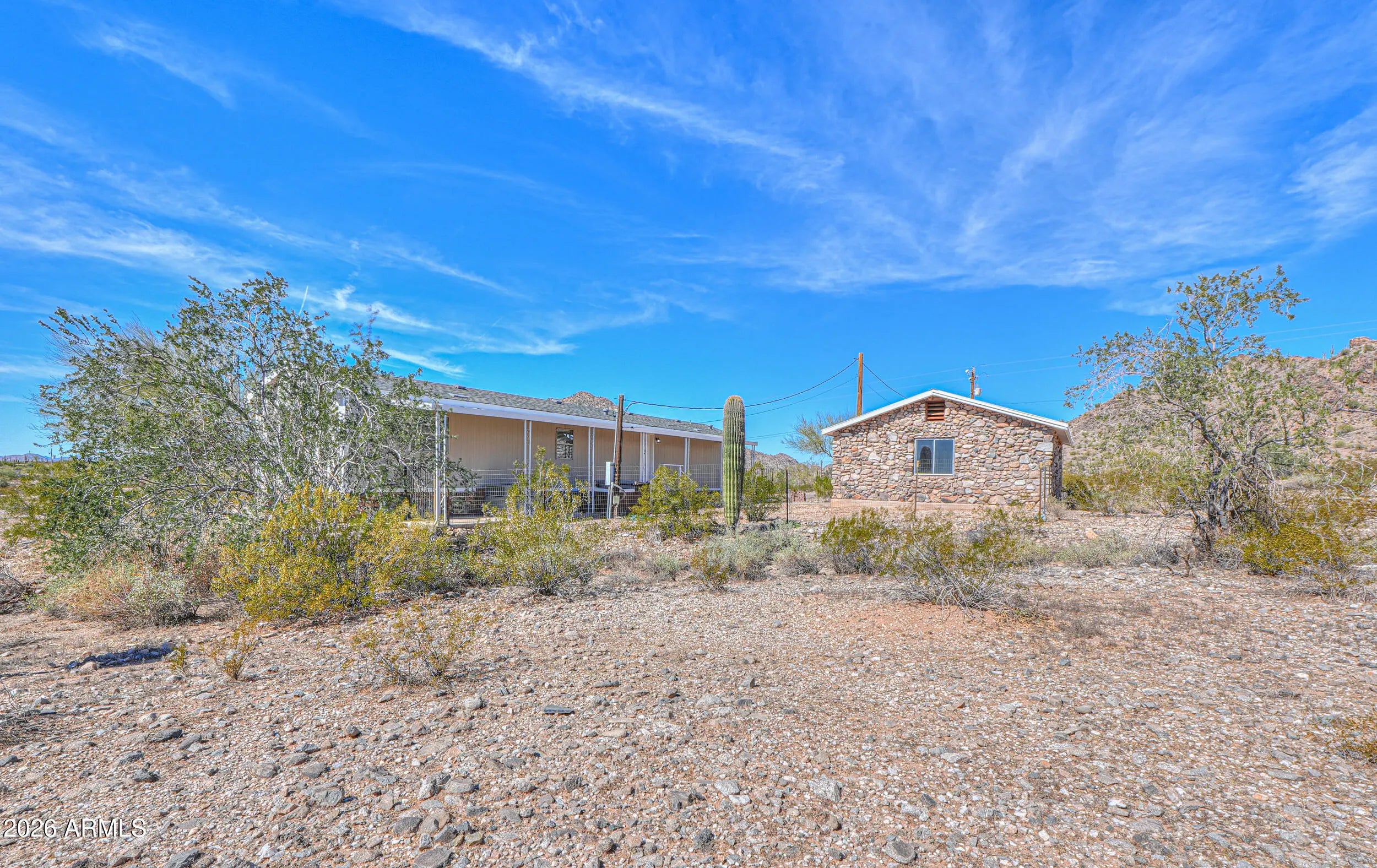 A MUST SEE! This REMODELED beauty sits on 2.8 MOUNTAINSIDE acres & has plenty of room for horses & toys! This gorgeous MOVE-IN READY home boasts over 1000 sq ft & is loaded with upgrades- NEW ROOF, wood laminate flooring throughout, FRESH neutral two-toned paint inside & out, vaulted ceilings, upgraded fixtures & more! Featuring spacious entertainers kitchen with White cabinetry, granite countertops, SS appliances + 2 large bedrooms (with walkin closets), 2 full baths & open concept floorplan with palatial great room with bay window & breakfast bar! Spacious primary features an ensuite bath with granite vanity & large shower! Stunning lot nestled among saguaros & pristine desert landscaping with detached 2 car garage, full covered patios, no HOA, shared well, paved roads & MOUNTAIN VIEWS!