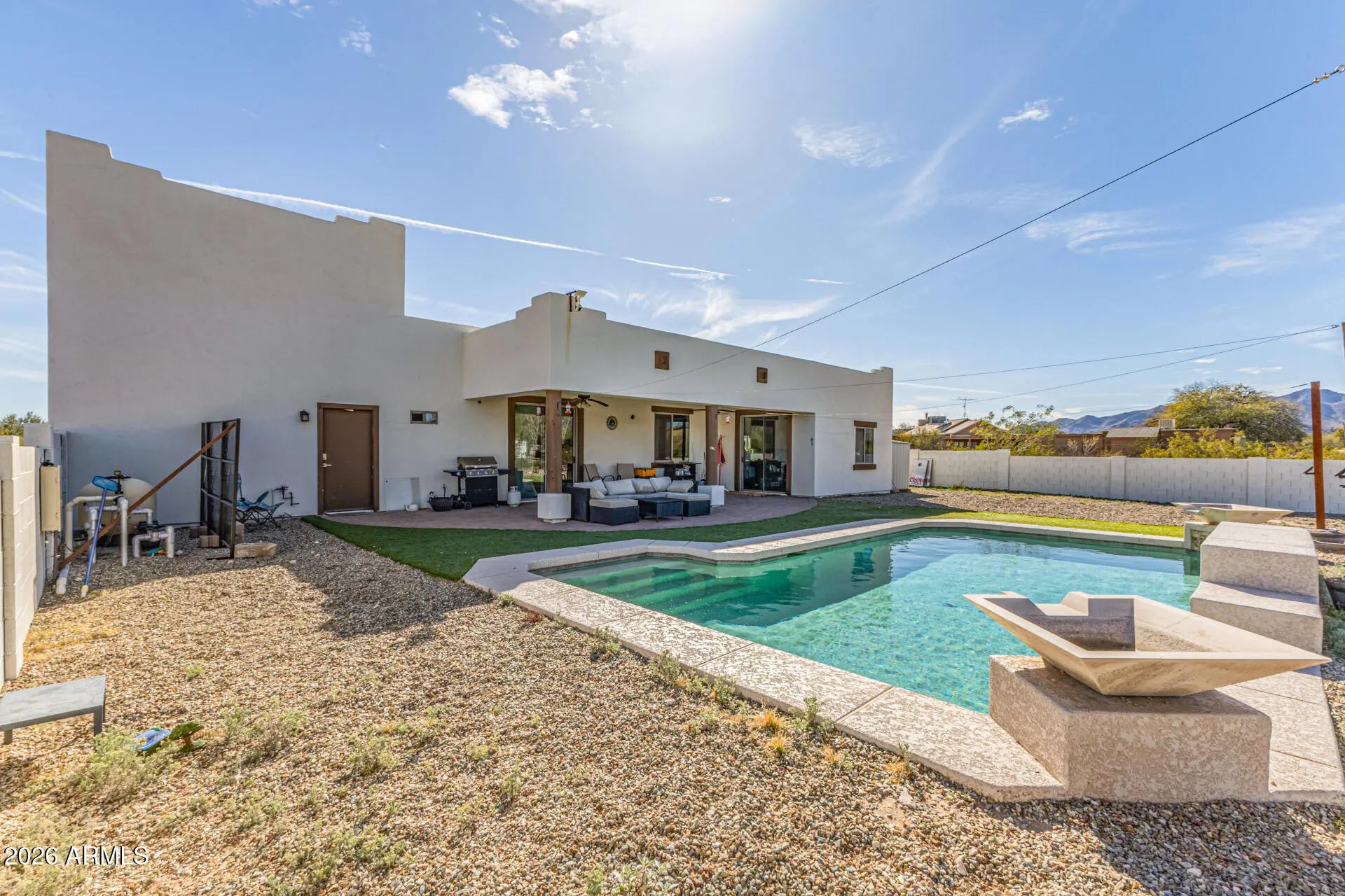 Experience the allure of this beautiful custom home with POOL & GORGEOUS MOUNTAIN VIEWS on an almost 1-acre lot! The property features an RV gate and spacious 2-car car + RV garage (with additional loft storage, workshop area and its own HALF BATH)! Paver driveway for added curb appeal. The inviting interior showcases a welcoming foyer, bountiful natural light, wood-look floors in common areas/primary, and soft carpet in secondary bedrooms. Designed for everyday living, the seamlessly flowing open layout is sure to impress! The impeccable kitchen boasts SS appliances, granite counters recessed & pendant lights, a walk-in pantry, ample wood cabinetry, and an island w/breakfast bar. Primary suite has private exit to the backyard, spa-like ensuite with dual vessel sinks, walk-in closet and walk in shower. You'll love the large, entertainer's backyard! Featuring a paver-covered patio, artificial turf, a storage shed, a fire pit, and a sparkling pool for year-round enjoyment. Plus, BREATHTAKING MOUNTAIN VIEWS create a stunning natural backdrop! Bring your toys, trucks, and RVs; there's room for everything here. Zoned for horse privileges.