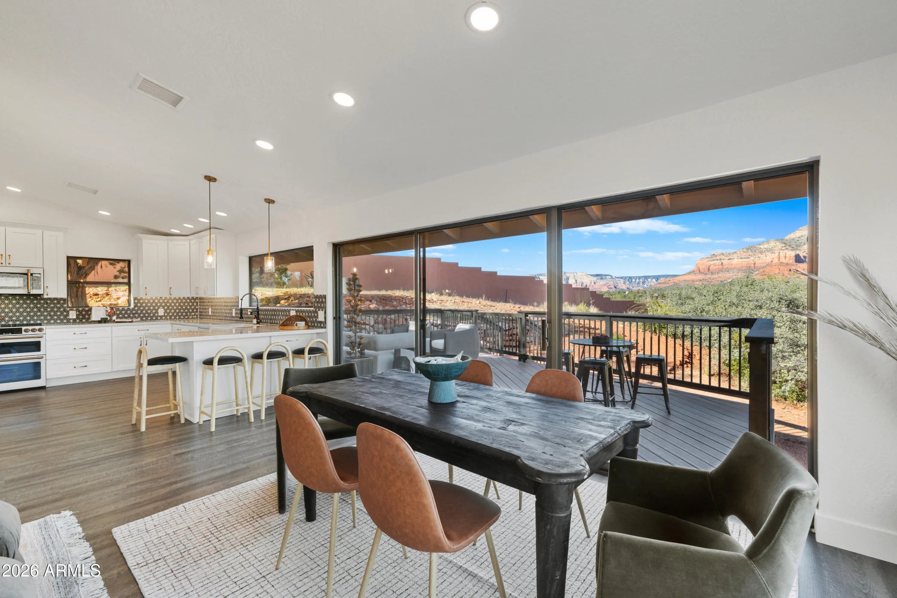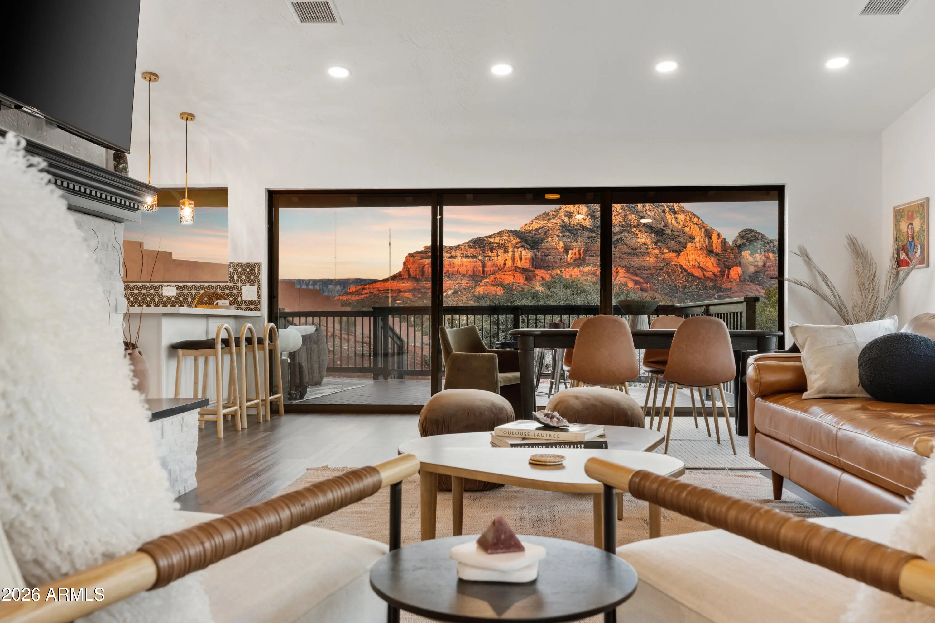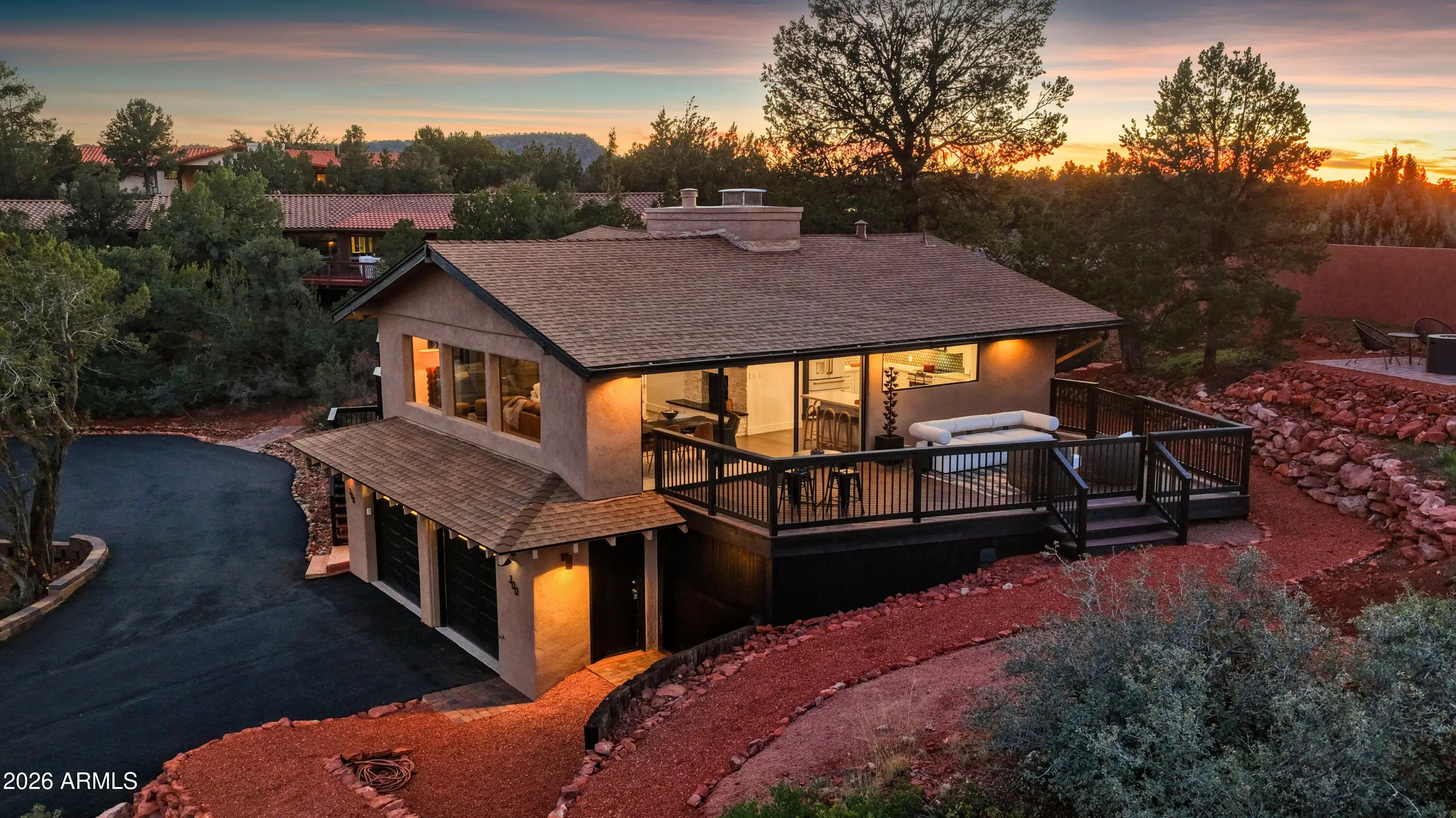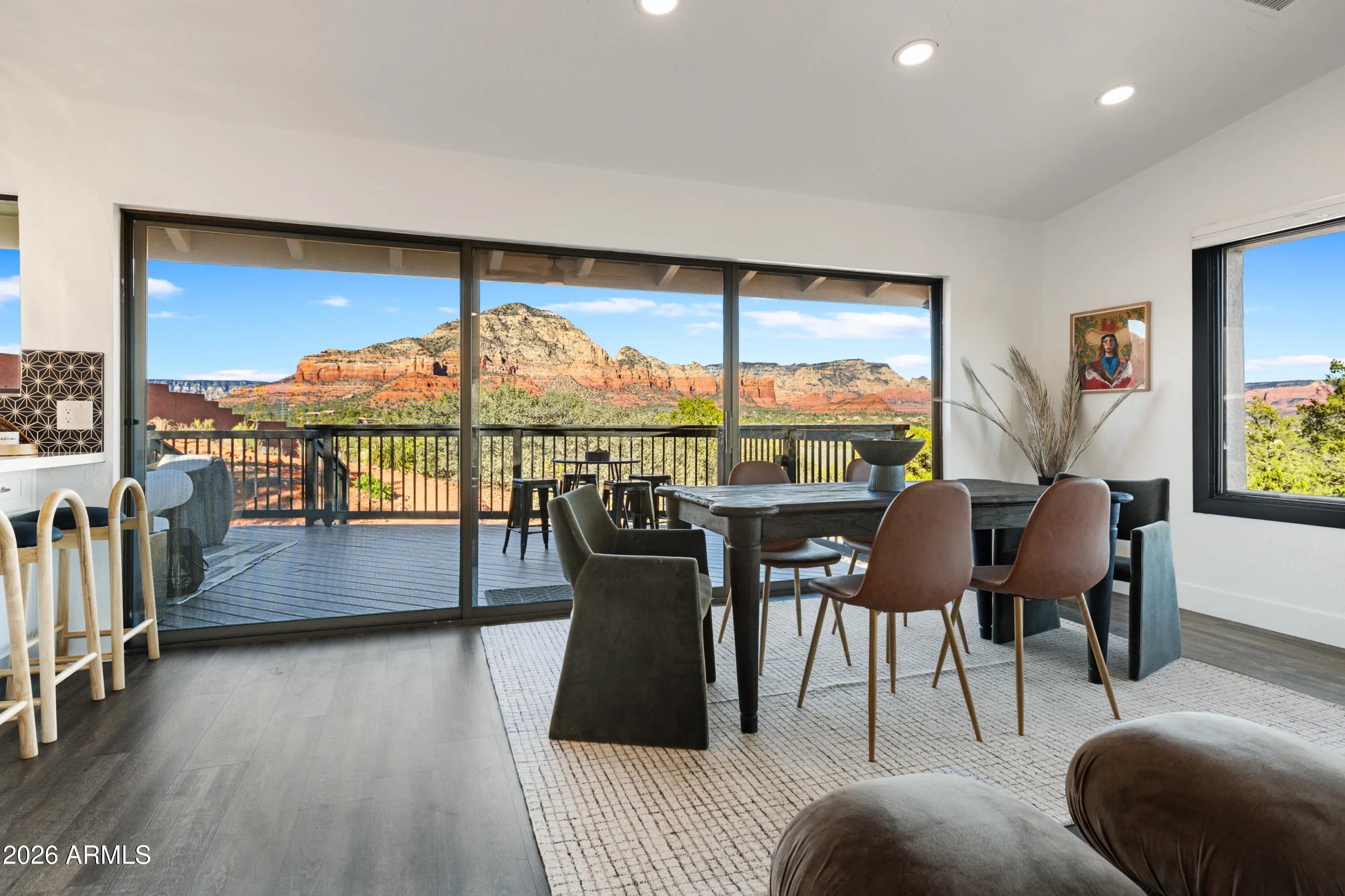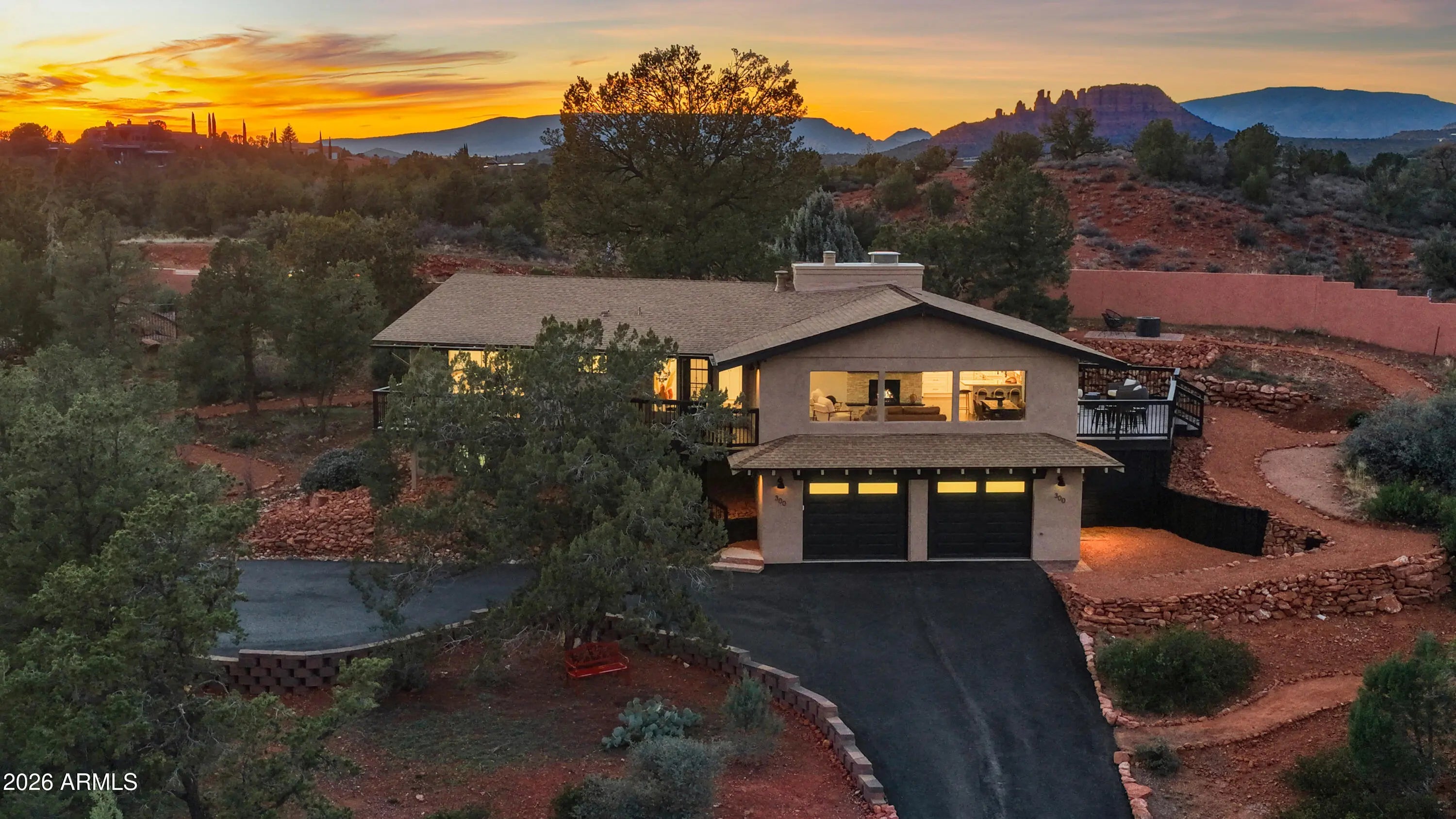 Elevated above the glittering city lights of Sedona with unobstructed 270° red rock vistas, this fully reimagined contemporary home has 3BD/2.5BA + a lower level flex bonus room. It delivers the trifecta of updated design, a gorgeous lot, and transcendent scenery. Picture windows flood the open-concept living space with natural light and ever-changing desert color. Remodeled inside and out, the home features clean lines and expansive open decks, creating effortless indoor-outdoor flow. Price also includes the adjacent .66-acre parcel for a combined 1.15 acres, amplifying privacy and presence. Beautifully staged to highlight its city-meets-nature setting. The owner holds AZ Real Estate Broker License. MORE DETAILS+PHOTO NARRATIVE: -------------- 300 CALLE DEL NORTE HIGHLIGHTS & DETAILS: Originally built in 1986 and intentionally positioned to capture the full sweep of Sedona's majestic red rock skyline, this home has undergone a thoughtful top-to-bottom transformation over the past three years. What once stood as a well-sited property with strong bones in the highly desirable Foothills South neighborhood is now a fully reimagined contemporary retreat -- refined, cohesive, and intentionally modern. Every surface has been reconsidered. Interior and exterior renovations were executed with an emphasis on clean lines, durability, and bright, neutral finishes. The result is far more than cosmetic improvement -- it is a true reinvention, blending modern influence with the warmth, proportion, and scale that Sedona living demands. The surrounding grounds received equal attention. Landscaping was groomed and reshaped to create a cohesive 1.15-acre setting with walking paths (inclusive of the adjacent parcel), increasing usable outdoor space while preserving the natural beauty that frames the panoramic views -- offering a private, park-like environment. A generous horseshoe driveway enhances both arrival presence and functionality, accommodating up to 6 vehicles. Set along West Sedona's main corridor, the property enjoys immediate access to town amenities and thoroughfares, making daily living and entertaining effortless. Elevated above the roadway, the home captures uninterrupted red rock vistas and city lights, pairing convenience with commanding views. With the inclusion of the adjacent parcel, the expanded 1.15-acre footprint opens the door to enhanced outdoor design opportunities. A future owner may choose to incorporate additional privacy landscaping, architectural screening elements, water features, fountains, or even a pool and spa environment -- further enriching the sensory experience of the outdoor spaces. Mature plantings, rustling trees, and thoughtfully designed hardscape features could create an even more immersive and layered landscape setting while preserving the property's panoramic outlook. (Buyer to verify expansion options with the HOA and compliance with all applicable CCRs.) Without exception, this is a property that has been carefully curated -- not flipped or rushed -- but deliberately refined by the seller, who lived in the home and personally served as the general contractor for the remodel. Explore the immersive 3D walkthrough and cinematic video tour to fully experience the layout, elevation, and panoramic view corridors this property offers. Continue to take a closer look at the layout, materials, improvements that define this property. All of the heavy lifting and expense has been taken care of for the new owner. NEW STRUCTURAL & MECHANICAL IMPROVEMENTS (2023-Present) -Composition shingle roof -Exterior Paint - Beige stucco with black trim accents -HVAC system including new ductwork and the addition of central air conditioning -Dual-pane energy-efficient windows and main sliding glass door -Electrical updates throughout with all new interior and exterior lighting NEW EXTERIOR ENHANCEMENTS (2023-Present) -2 new decks with composite plank floors +wood rails & bannisters -New asphalt driveway -Added Retaining walls and expanded hardscaping improvements -Added paver patio off third bedroom with enclosed pet area -Added upper yard paver patio creating additional outdoor space NEW SITE WORK & DRAINAGE (2023 to Present) -Comprehensive landscaping refresh with new decorative rock and gravel -Added groomed walking paths throughout the property -Added drainage channels and French drain systems installed for improved water management GARAGE & STORAGE (2025/26) -Full 2-car garage remodel including fresh paint, epoxy-coated floors, new garage doors, and quiet-open openers + coded entry pad -Expansive crawl space maintenance with groomed earth floor, lighting, w/fully sheathed walls & ceilings for mechanical protection and insulation integrity - TONS OF STORAGE! INTERIOR RENOVATIONS (2023-Present) The interior renovation reflects a cohesive, modern design palette centered on warmth, contrast, and functionality. INTERIOR FINISHES & DESIGN FEATURES FLOORING & PAINT -Whole-home luxury vinyl plank flooring in a dark walnut tone -Five-inch white baseboards throughout -Bright white interior paint with updated wall texturing -Warm, dense oyster-toned carpet in the primary suite & Bedroom 2 LIVING & ENTERTAINING SPACES -Open-concept living and dining areas adjacent to a spacious corner kitchen -Wood-burning fireplace with stone ledger accent wall and a black quartz hearth creating a striking focal point -Flooded with light coming in the large format wood encased picture windows and trimmed out w/black accent paint -Whole-home new doors, hinges, and hardware -Whole-home new lighting including plates, switches, receptacles KITCHEN -White quartz countertops w/gorgeous geometric starburst tile backsplash with metal button accents -Extensive white shaker-panel cabinetry, upper & lower with soft-close doors and drawers -Brushed bronze cabinet hardware -Ceramic apron-front sink w/gooseneck faucet with pull-down sprayer + a dedicated pot filler faucet -Air button disposal -White Matte-finish Café