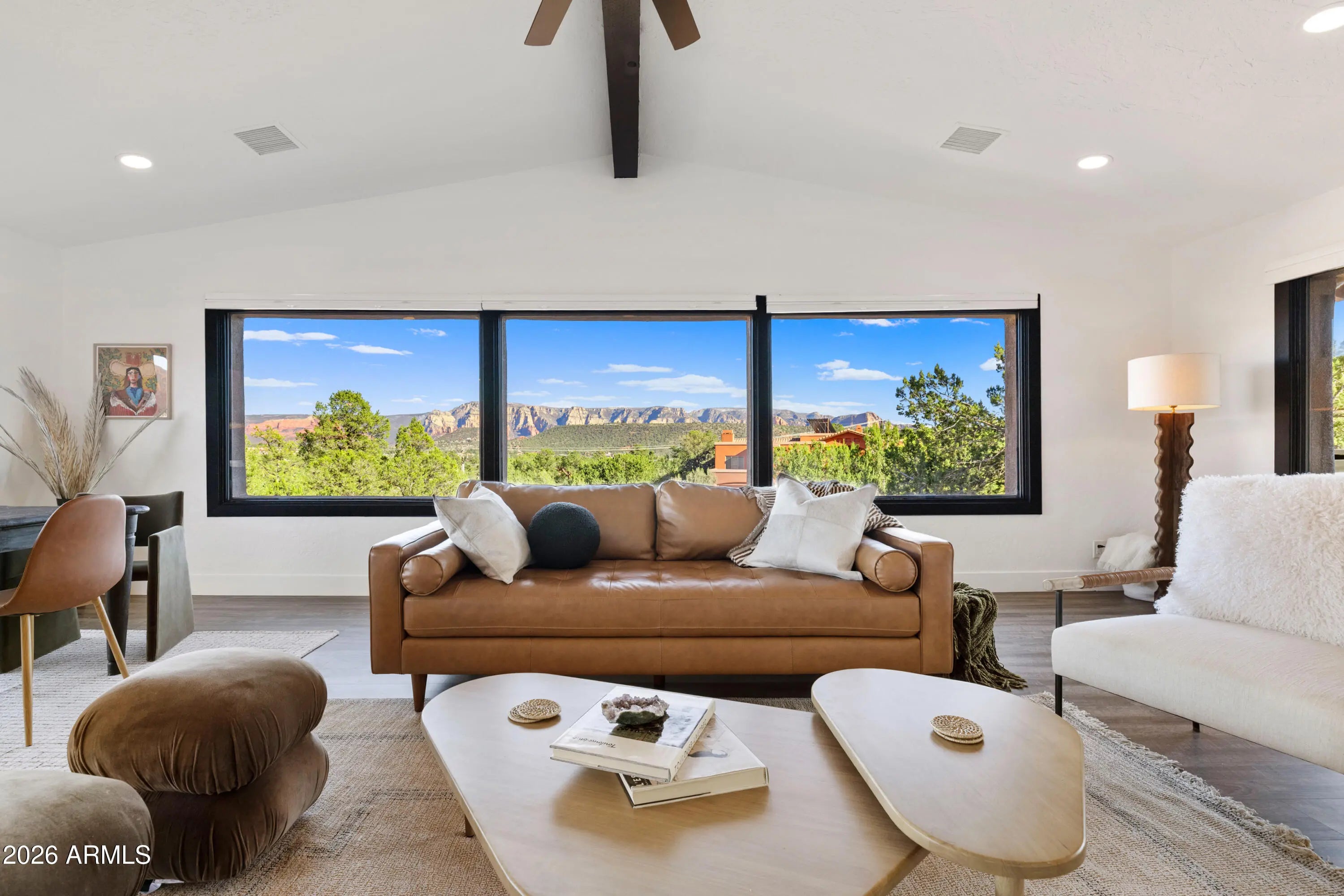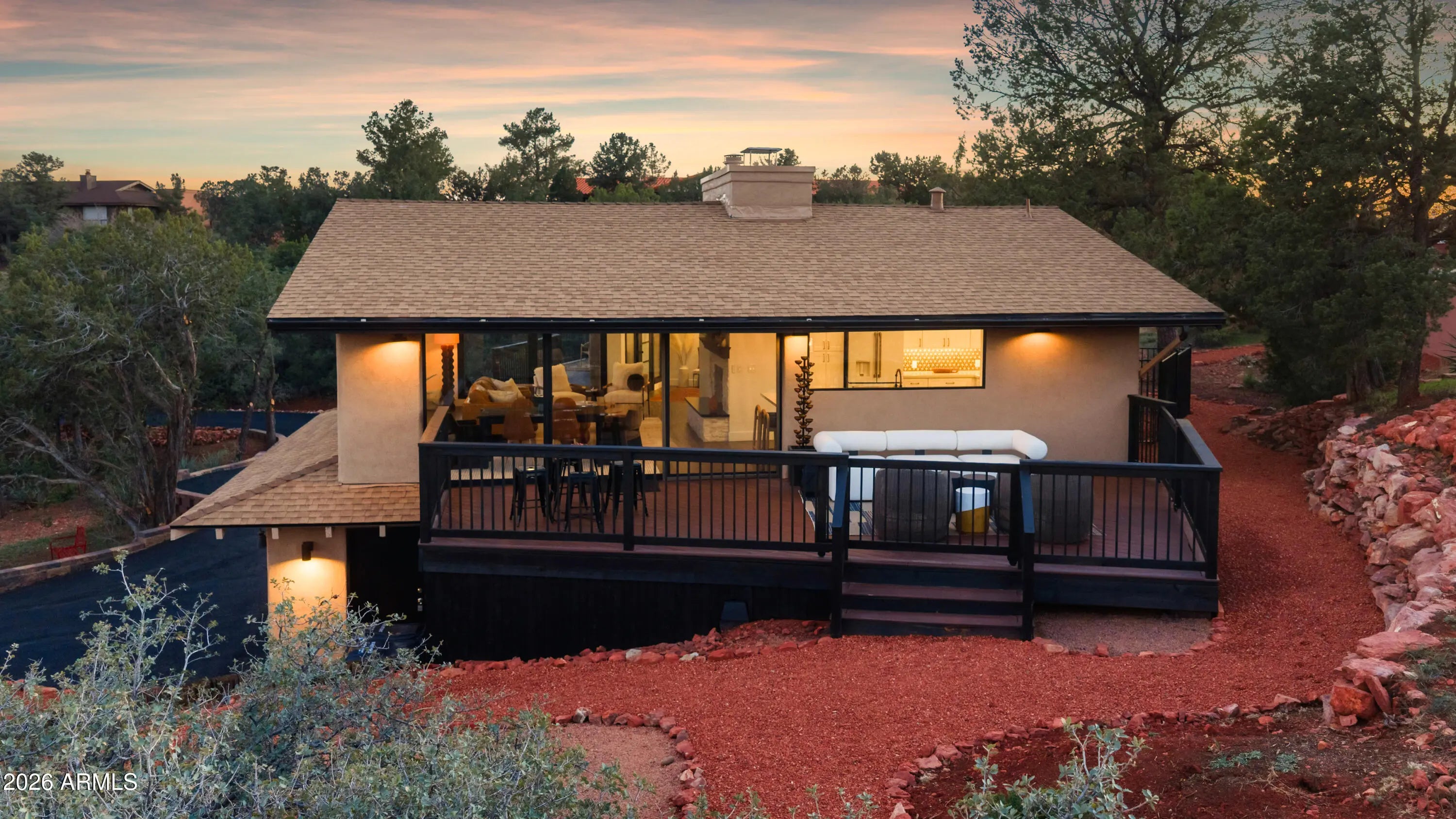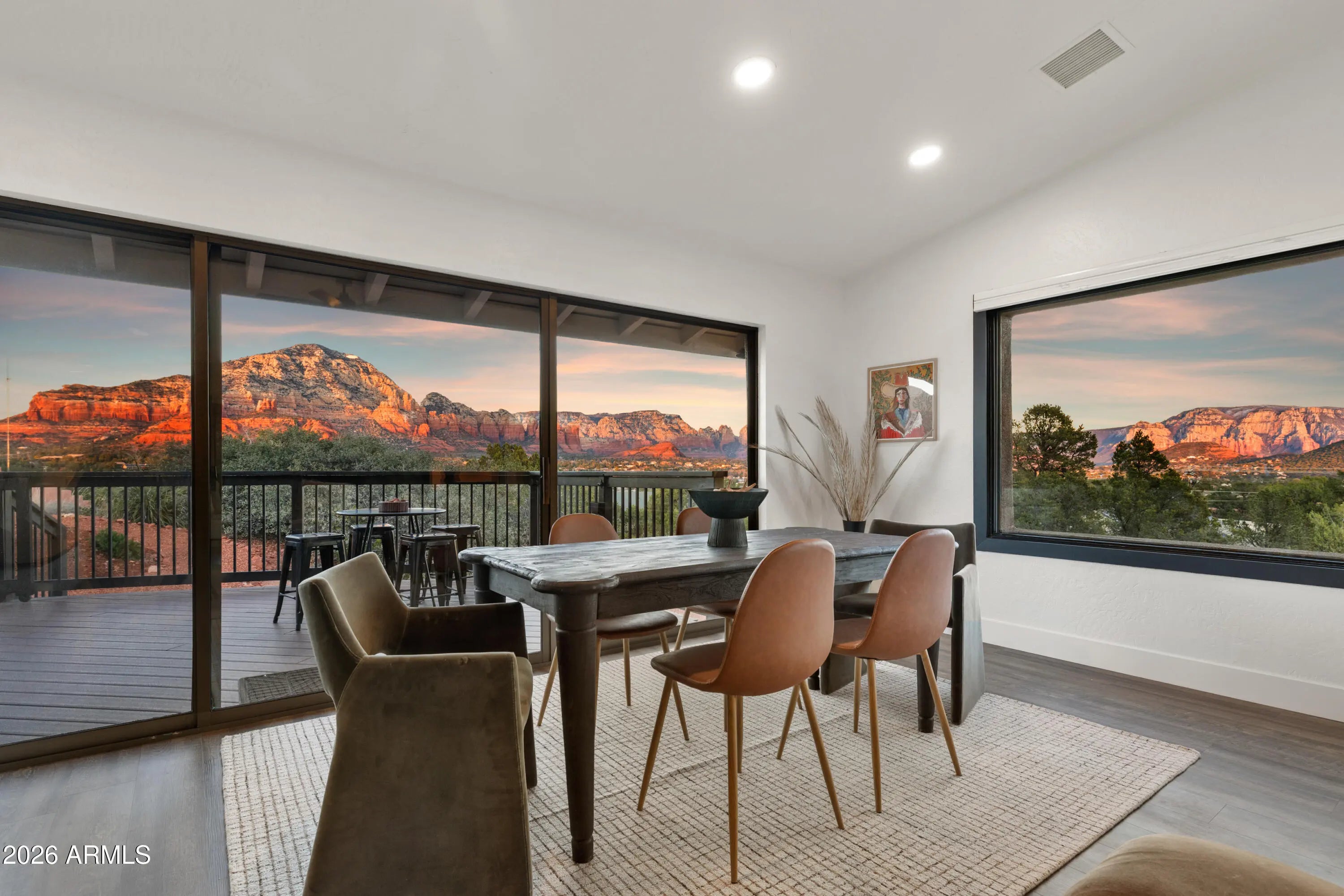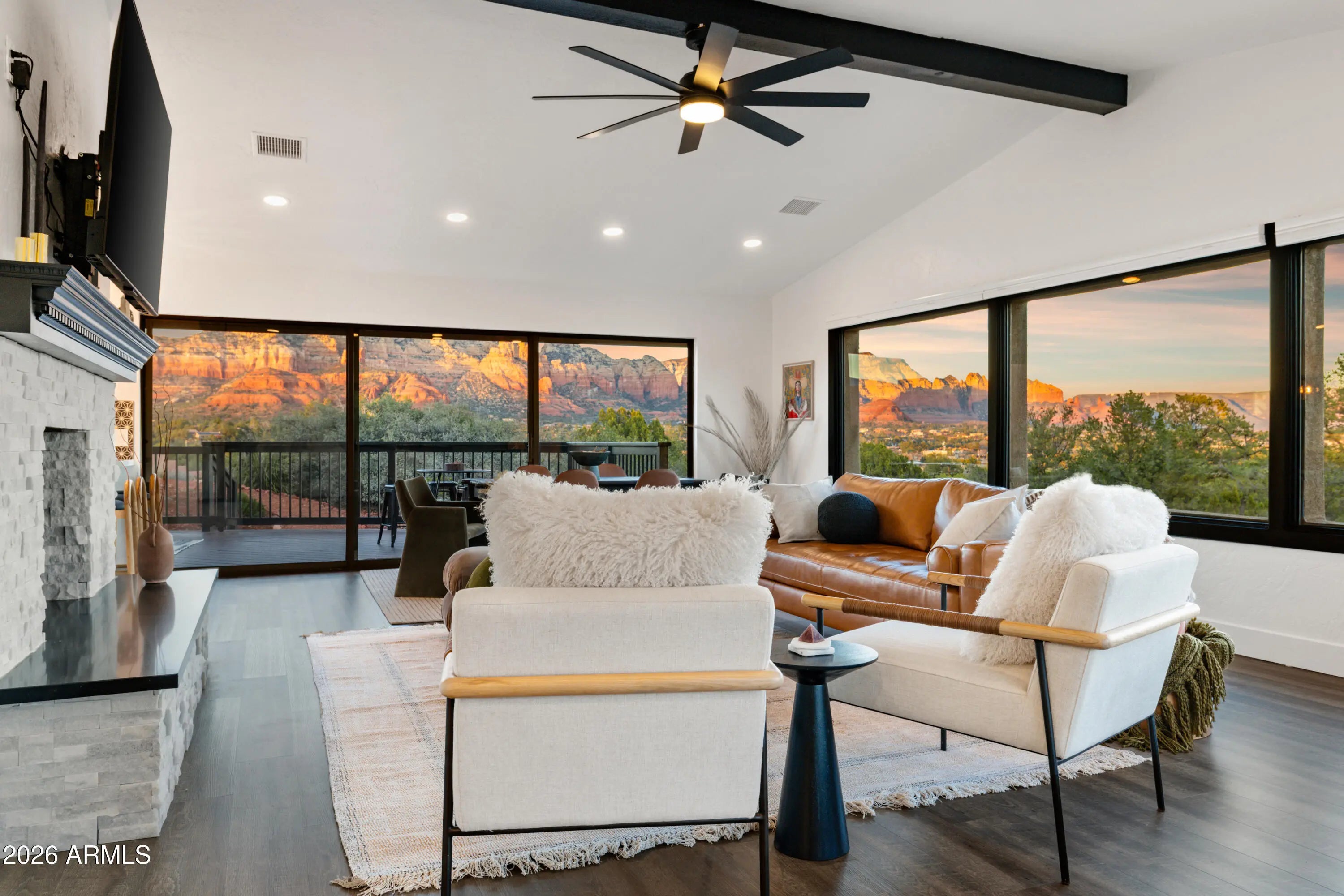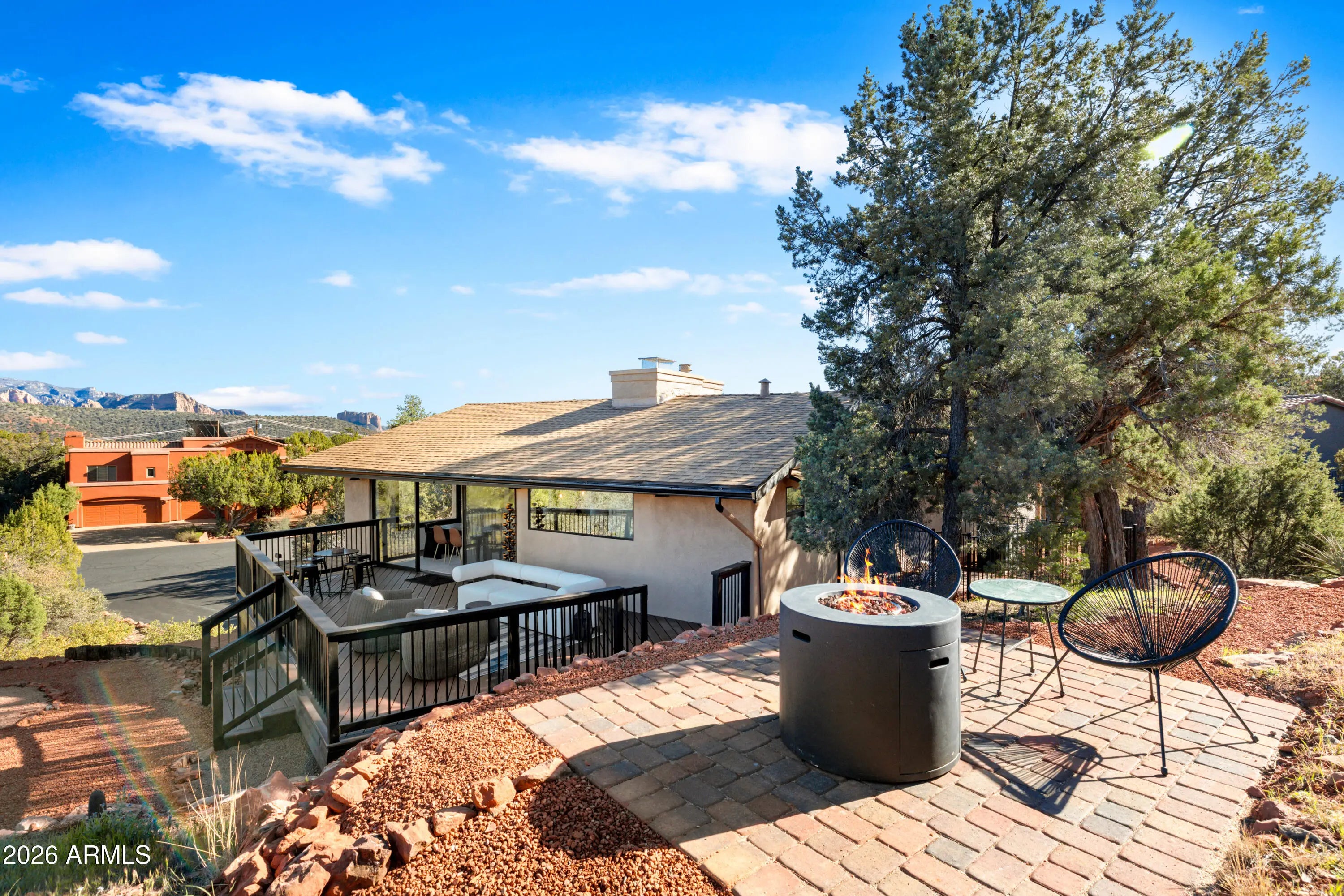 Elevated above the glittering city lights of Sedona with unobstructed 270° red rock vistas, this fully reimagined contemporary home has 3BD/2.5BA + a lower level flex bonus room. It delivers the trifecta of updated design, a gorgeous lot, and transcendent scenery. Picture windows flood the open-concept living space with natural light and ever-changing desert color. Remodeled inside and out, the home features clean lines and expansive open decks, creating effortless indoor-outdoor flow. Price also includes the adjacent .66-acre parcel for a combined 1.15 acres, amplifying privacy and presence. Beautifully staged to highlight its city-meets-nature setting. The owner holds AZ Real Estate Broker License. MORE DETAILS+PHOTO NARRATIVE: -------------- 300 CALLE DEL NORTE HIGHLIGHTS & DETAILS: Originally built in 1986 and intentionally positioned to capture the full sweep of Sedona's majestic red rock skyline, this home has undergone a thoughtful top-to-bottom transformation over the past three years. What once stood as a well-sited property with strong bones in the highly desirable Foothills South neighborhood is now a fully reimagined contemporary retreat -- refined, cohesive, and intentionally modern. Every surface has been reconsidered. Interior and exterior renovations were executed with an emphasis on clean lines, durability, and bright, neutral finishes. The result is far more than cosmetic improvement -- it is a true reinvention, blending modern influence with the warmth, proportion, and scale that Sedona living demands. The surrounding grounds received equal attention. Landscaping was groomed and reshaped to create a cohesive 1.15-acre setting with walking paths (inclusive of the adjacent parcel), increasing usable outdoor space while preserving the natural beauty that frames the panoramic views -- offering a private, park-like environment. A generous horseshoe driveway enhances both arrival presence and functionality, accommodating up to 6 vehicles. Set along West Sedona's main corridor, the property enjoys immediate access to town amenities and thoroughfares, making daily living and entertaining effortless. Elevated above the roadway, the home captures uninterrupted red rock vistas and city lights, pairing convenience with commanding views. With the inclusion of the adjacent parcel, the expanded 1.15-acre footprint opens the door to enhanced outdoor design opportunities. A future owner may choose to incorporate additional privacy landscaping, architectural screening elements, water features, fountains, or even a pool and spa environment -- further enriching the sensory experience of the outdoor spaces. Mature plantings, rustling trees, and thoughtfully designed hardscape features could create an even more immersive and layered landscape setting while preserving the property's panoramic outlook. (Buyer to verify expansion options with the HOA and compliance with all applicable CCRs.) Without exception, this is a property that has been carefully curated -- not flipped or rushed -- but deliberately refined by the seller, who lived in the home and personally served as the general contractor for the remodel. Explore the immersive 3D walkthrough and cinematic video tour to fully experience the layout, elevation, and panoramic view corridors this property offers. Continue to take a closer look at the layout, materials, improvements that define this property. All of the heavy lifting and expense has been taken care of for the new owner. NEW STRUCTURAL & MECHANICAL IMPROVEMENTS (2023-Present) -Composition shingle roof -Exterior Paint - Beige stucco with black trim accents -HVAC system including new ductwork and the addition of central air conditioning -Dual-pane energy-efficient windows and main sliding glass door -Electrical updates throughout with all new interior and exterior lighting NEW EXTERIOR ENHANCEMENTS (2023-Present) -2 new decks with composite plank floors +wood rails & bannisters -New asphalt driveway -Added Retaining walls and expanded hardscaping improvements -Added paver patio off third bedroom with enclosed pet area -Added upper yard paver patio creating additional outdoor space NEW SITE WORK & DRAINAGE (2023 to Present) -Comprehensive landscaping refresh with new decorative rock and gravel -Added groomed walking paths throughout the property -Added drainage channels and French drain systems installed for improved water management GARAGE & STORAGE (2025/26) -Full 2-car garage remodel including fresh paint, epoxy-coated floors, new garage doors, and quiet-open openers + coded entry pad -Expansive crawl space maintenance with groomed earth floor, lighting, w/fully sheathed walls & ceilings for mechanical protection and insulation integrity - TONS OF STORAGE! INTERIOR RENOVATIONS (2023-Present) The interior renovation reflects a cohesive, modern design palette centered on warmth, contrast, and functionality. INTERIOR FINISHES & DESIGN FEATURES FLOORING & PAINT -Whole-home luxury vinyl plank flooring in a dark walnut tone -Five-inch white baseboards throughout -Bright white interior paint with updated wall texturing -Warm, dense oyster-toned carpet in the primary suite & Bedroom 2 LIVING & ENTERTAINING SPACES -Open-concept living and dining areas adjacent to a spacious corner kitchen -Wood-burning fireplace with stone ledger accent wall and a black quartz hearth creating a striking focal point -Flooded with light coming in the large format wood encased picture windows and trimmed out w/black accent paint -Whole-home new doors, hinges, and hardware -Whole-home new lighting including plates, switches, receptacles KITCHEN -White quartz countertops w/gorgeous geometric starburst tile backsplash with metal button accents -Extensive white shaker-panel cabinetry, upper & lower with soft-close doors and drawers -Brushed bronze cabinet hardware -Ceramic apron-front sink w/gooseneck faucet with pull-down sprayer + a dedicated pot filler faucet -Air button disposal -White Matte-finish Café
