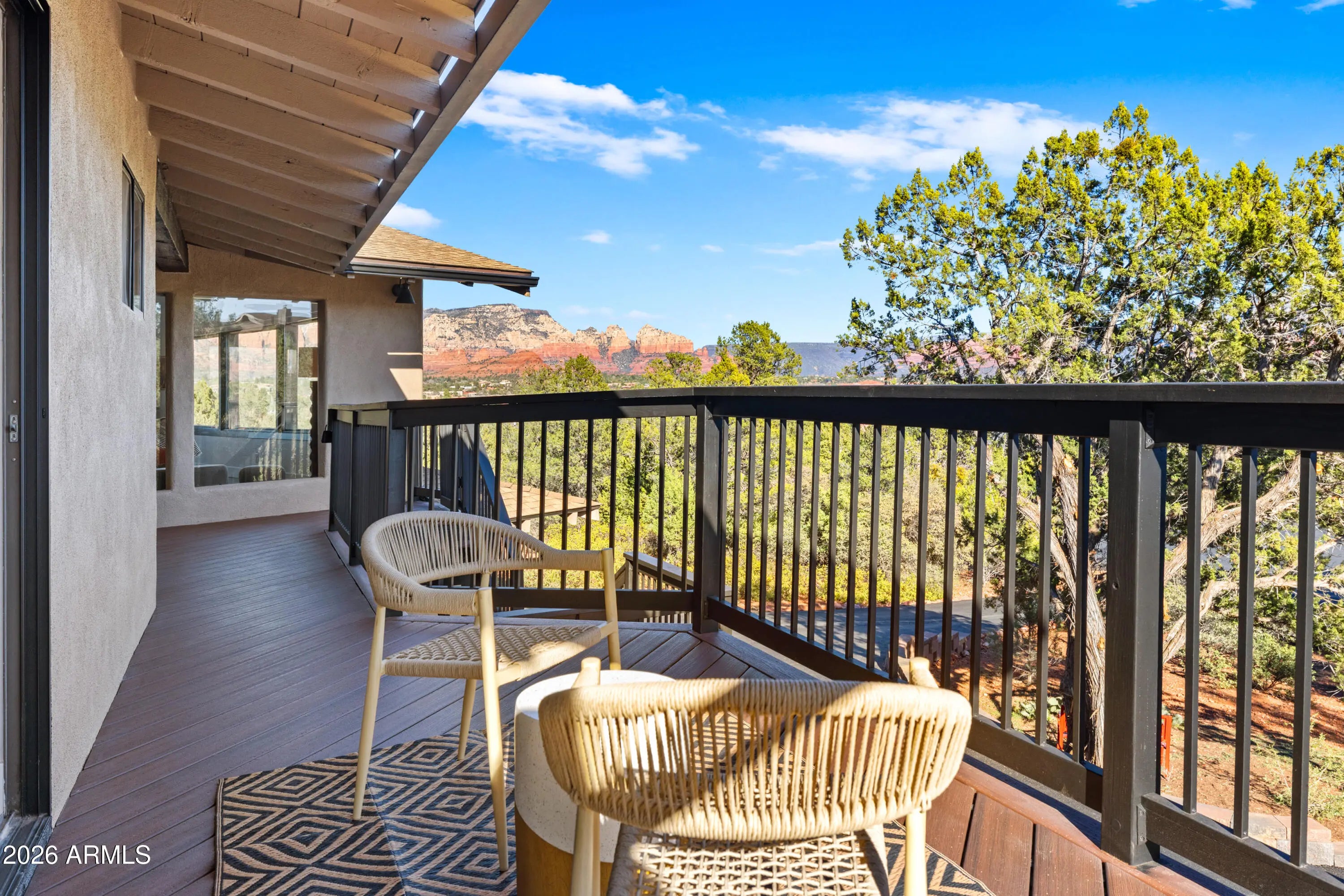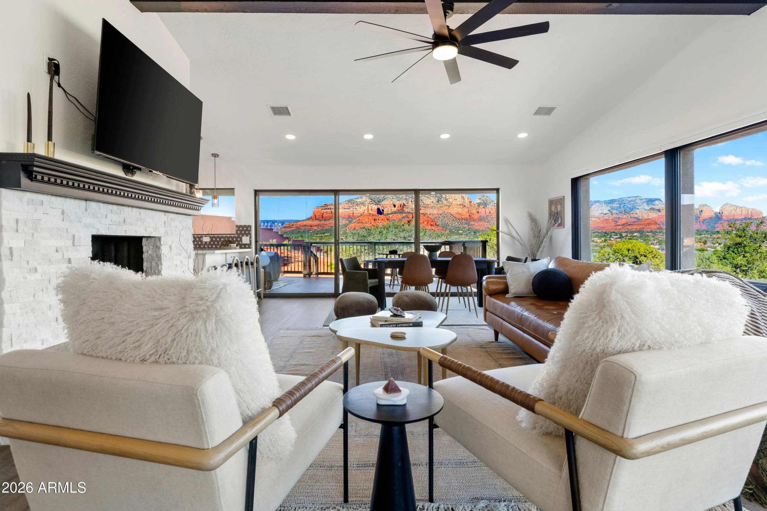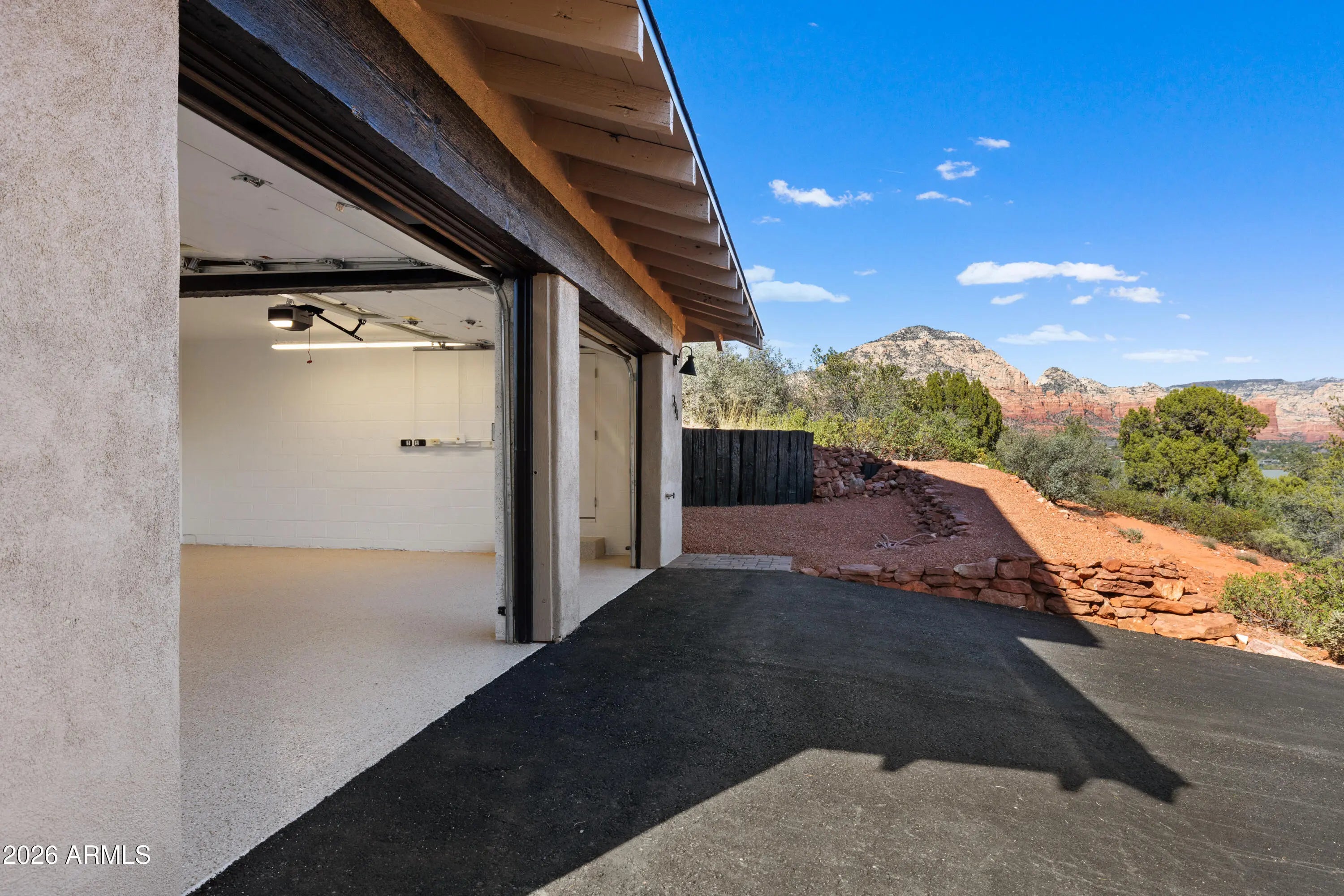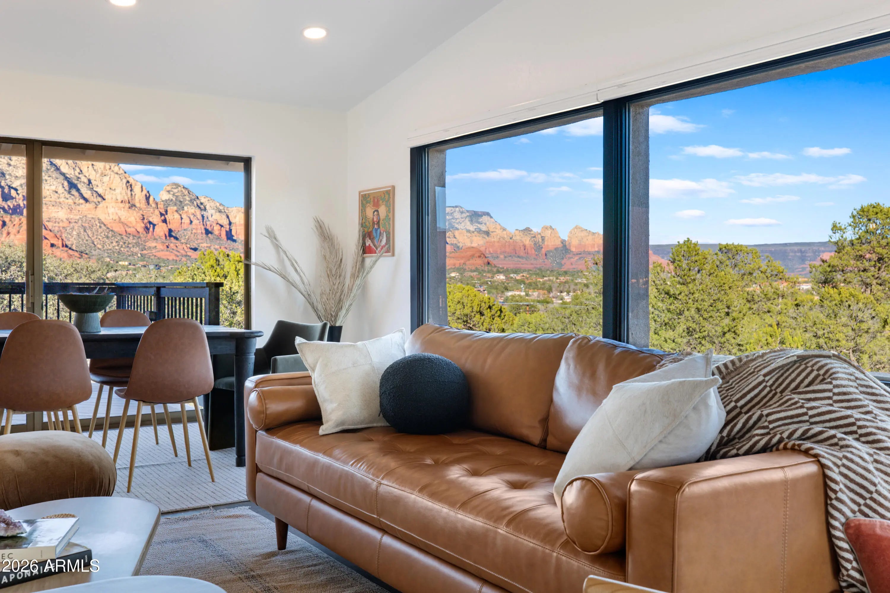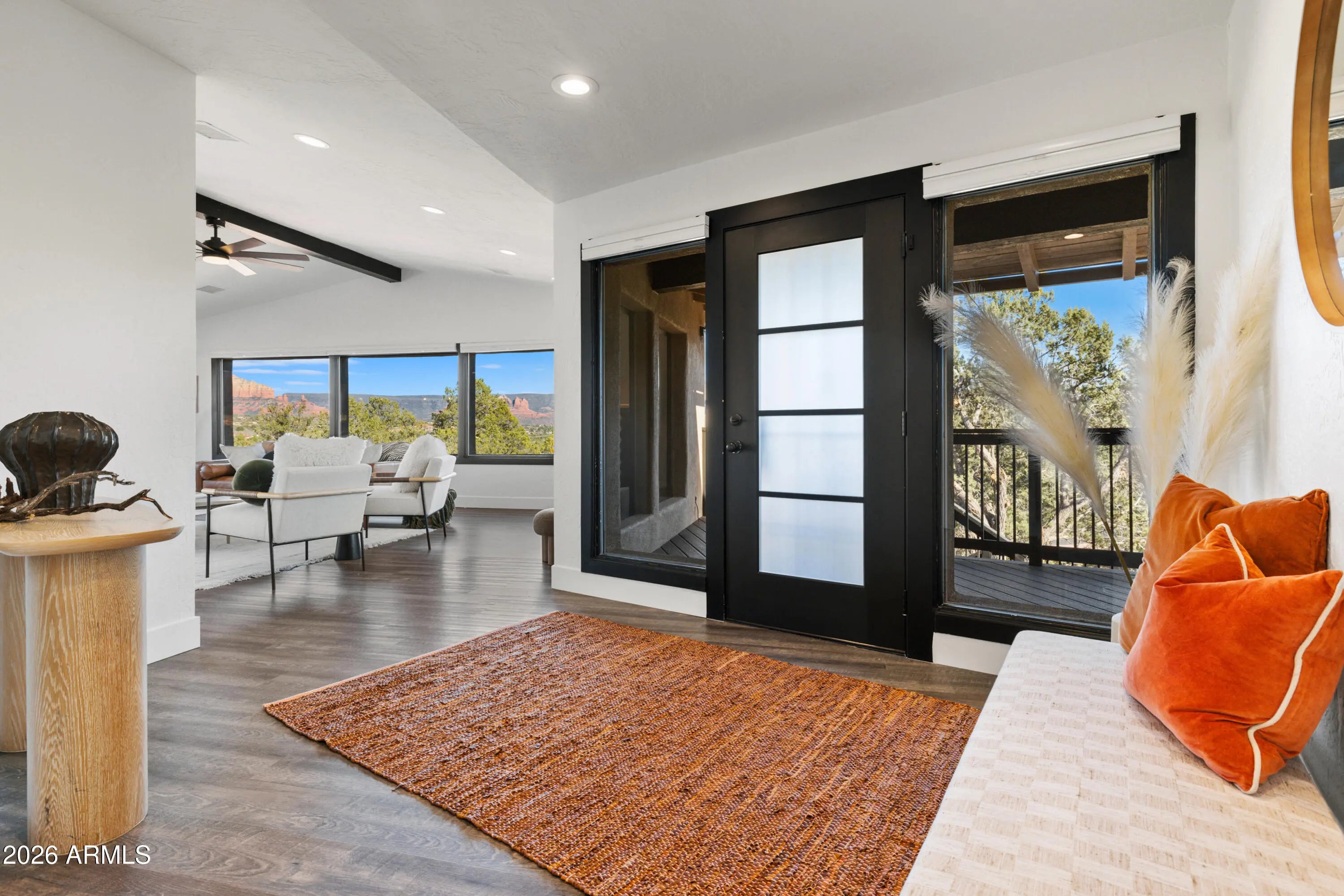 Elevated above the glittering city lights of Sedona with unobstructed 270° red rock vistas, this fully reimagined contemporary home has 3BD/2.5BA + a lower level flex bonus room. It delivers the trifecta of updated design, a gorgeous lot, and transcendent scenery. Picture windows flood the open-concept living space with natural light and ever-changing desert color. Remodeled inside and out, the home features clean lines and expansive open decks, creating effortless indoor-outdoor flow. Price also includes the adjacent .66-acre parcel for a combined 1.15 acres, amplifying privacy and presence. Beautifully staged to highlight its city-meets-nature setting. The owner holds AZ Real Estate Broker License. MORE DETAILS+PHOTO NARRATIVE: -------------- 300 CALLE DEL NORTE HIGHLIGHTS & DETAILS: Originally built in 1986 and intentionally positioned to capture the full sweep of Sedona's majestic red rock skyline, this home has undergone a thoughtful top-to-bottom transformation over the past three years. What once stood as a well-sited property with strong bones in the highly desirable Foothills South neighborhood is now a fully reimagined contemporary retreat -- refined, cohesive, and intentionally modern. Every surface has been reconsidered. Interior and exterior renovations were executed with an emphasis on clean lines, durability, and bright, neutral finishes. The result is far more than cosmetic improvement -- it is a true reinvention, blending modern influence with the warmth, proportion, and scale that Sedona living demands. The surrounding grounds received equal attention. Landscaping was groomed and reshaped to create a cohesive 1.15-acre setting with walking paths (inclusive of the adjacent parcel), increasing usable outdoor space while preserving the natural beauty that frames the panoramic views -- offering a private, park-like environment. A generous horseshoe driveway enhances both arrival presence and functionality, accommodating up to 6 vehicles. Set along West Sedona's main corridor, the property enjoys immediate access to town amenities and thoroughfares, making daily living and entertaining effortless. Elevated above the roadway, the home captures uninterrupted red rock vistas and city lights, pairing convenience with commanding views. With the inclusion of the adjacent parcel, the expanded 1.15-acre footprint opens the door to enhanced outdoor design opportunities. A future owner may choose to incorporate additional privacy landscaping, architectural screening elements, water features, fountains, or even a pool and spa environment -- further enriching the sensory experience of the outdoor spaces. Mature plantings, rustling trees, and thoughtfully designed hardscape features could create an even more immersive and layered landscape setting while preserving the property's panoramic outlook. (Buyer to verify expansion options with the HOA and compliance with all applicable CCRs.) Without exception, this is a property that has been carefully curated -- not flipped or rushed -- but deliberately refined by the seller, who lived in the home and personally served as the general contractor for the remodel. Explore the immersive 3D walkthrough and cinematic video tour to fully experience the layout, elevation, and panoramic view corridors this property offers. Continue to take a closer look at the layout, materials, improvements that define this property. All of the heavy lifting and expense has been taken care of for the new owner. NEW STRUCTURAL & MECHANICAL IMPROVEMENTS (2023-Present) -Composition shingle roof -Exterior Paint - Beige stucco with black trim accents -HVAC system including new ductwork and the addition of central air conditioning -Dual-pane energy-efficient windows and main sliding glass door -Electrical updates throughout with all new interior and exterior lighting NEW EXTERIOR ENHANCEMENTS (2023-Present) -2 new decks with composite plank floors +wood rails & bannisters -New asphalt driveway -Added Retaining walls and expanded hardscaping improvements -Added paver patio off third bedroom with enclosed pet area -Added upper yard paver patio creating additional outdoor space NEW SITE WORK & DRAINAGE (2023 to Present) -Comprehensive landscaping refresh with new decorative rock and gravel -Added groomed walking paths throughout the property -Added drainage channels and French drain systems installed for improved water management GARAGE & STORAGE (2025/26) -Full 2-car garage remodel including fresh paint, epoxy-coated floors, new garage doors, and quiet-open openers + coded entry pad -Expansive crawl space maintenance with groomed earth floor, lighting, w/fully sheathed walls & ceilings for mechanical protection and insulation integrity - TONS OF STORAGE! INTERIOR RENOVATIONS (2023-Present) The interior renovation reflects a cohesive, modern design palette centered on warmth, contrast, and functionality. INTERIOR FINISHES & DESIGN FEATURES FLOORING & PAINT -Whole-home luxury vinyl plank flooring in a dark walnut tone -Five-inch white baseboards throughout -Bright white interior paint with updated wall texturing -Warm, dense oyster-toned carpet in the primary suite & Bedroom 2 LIVING & ENTERTAINING SPACES -Open-concept living and dining areas adjacent to a spacious corner kitchen -Wood-burning fireplace with stone ledger accent wall and a black quartz hearth creating a striking focal point -Flooded with light coming in the large format wood encased picture windows and trimmed out w/black accent paint -Whole-home new doors, hinges, and hardware -Whole-home new lighting including plates, switches, receptacles KITCHEN -White quartz countertops w/gorgeous geometric starburst tile backsplash with metal button accents -Extensive white shaker-panel cabinetry, upper & lower with soft-close doors and drawers -Brushed bronze cabinet hardware -Ceramic apron-front sink w/gooseneck faucet with pull-down sprayer + a dedicated pot filler faucet -Air button disposal -White Matte-finish Café