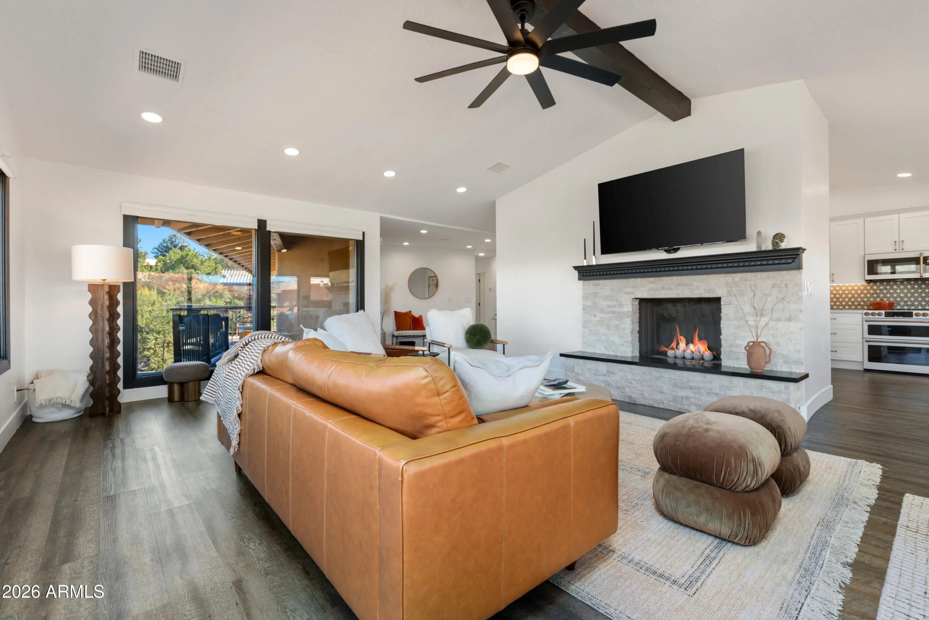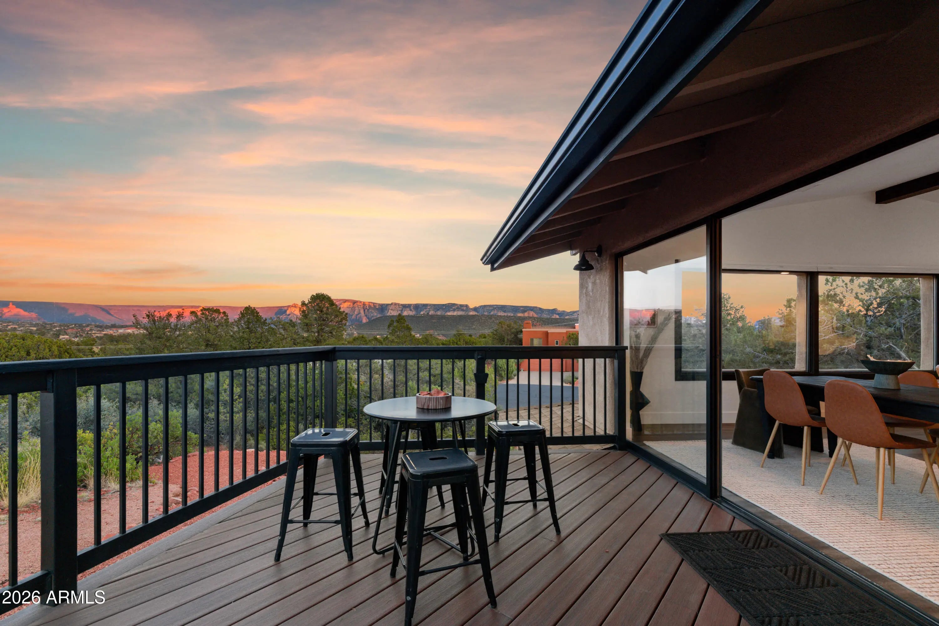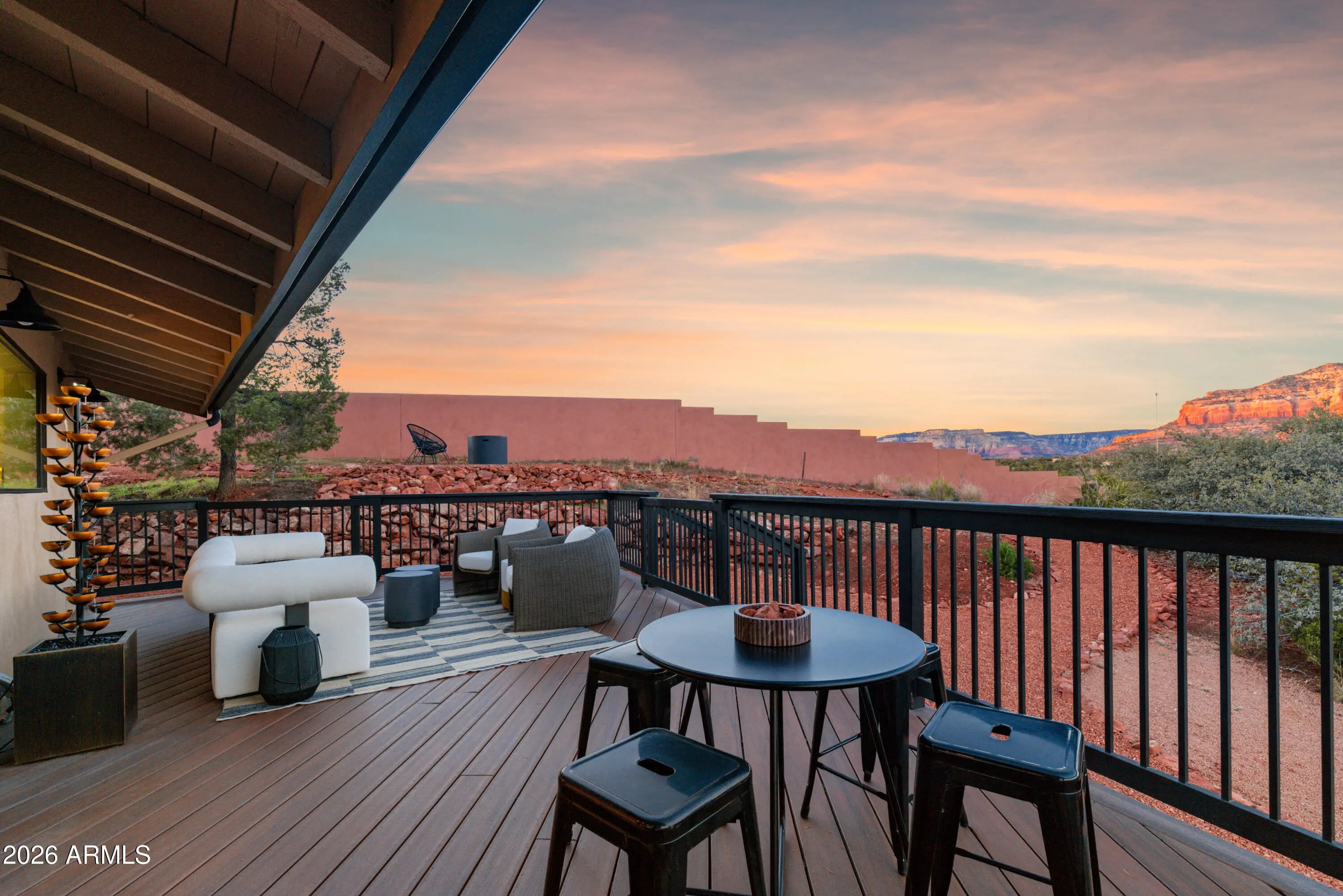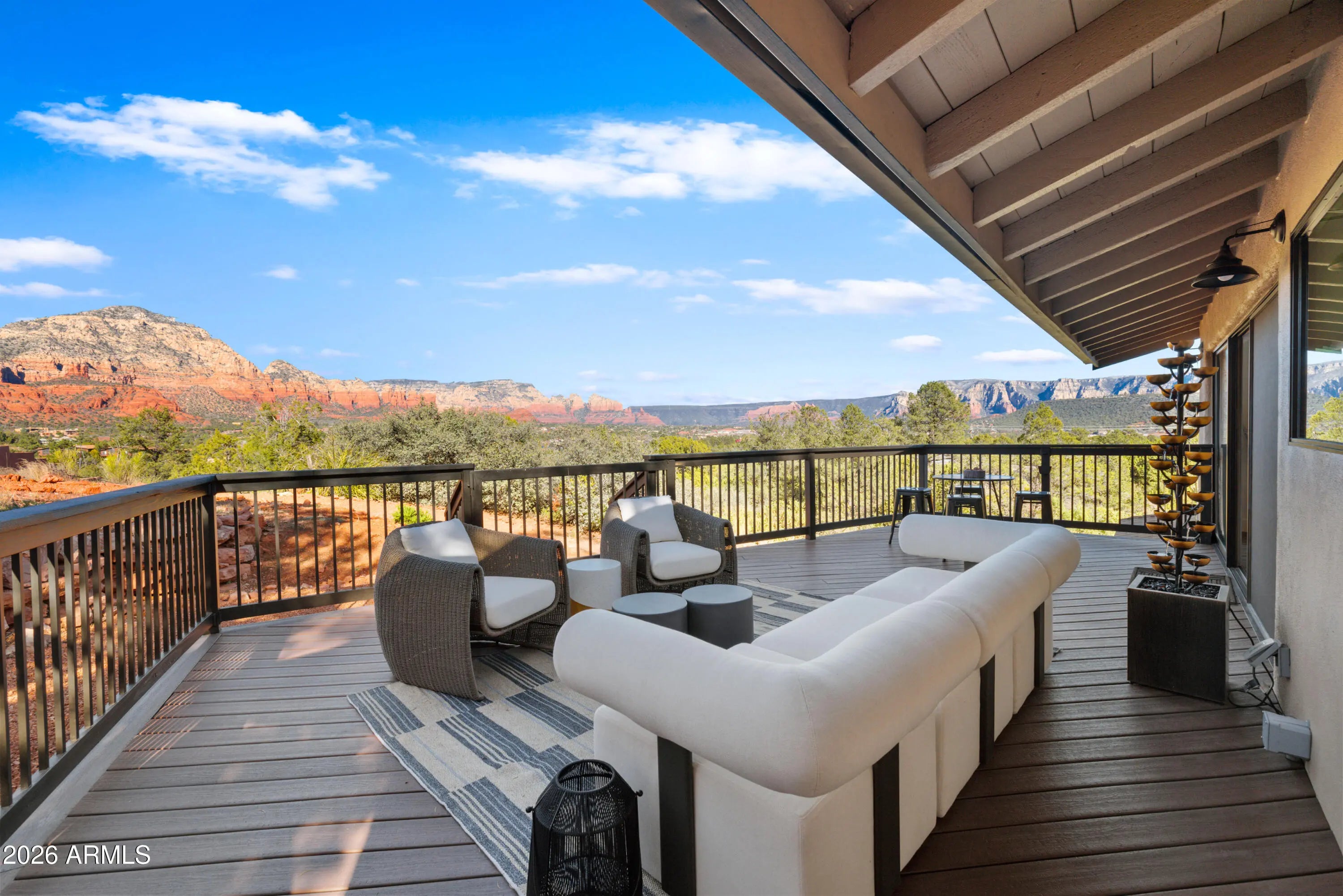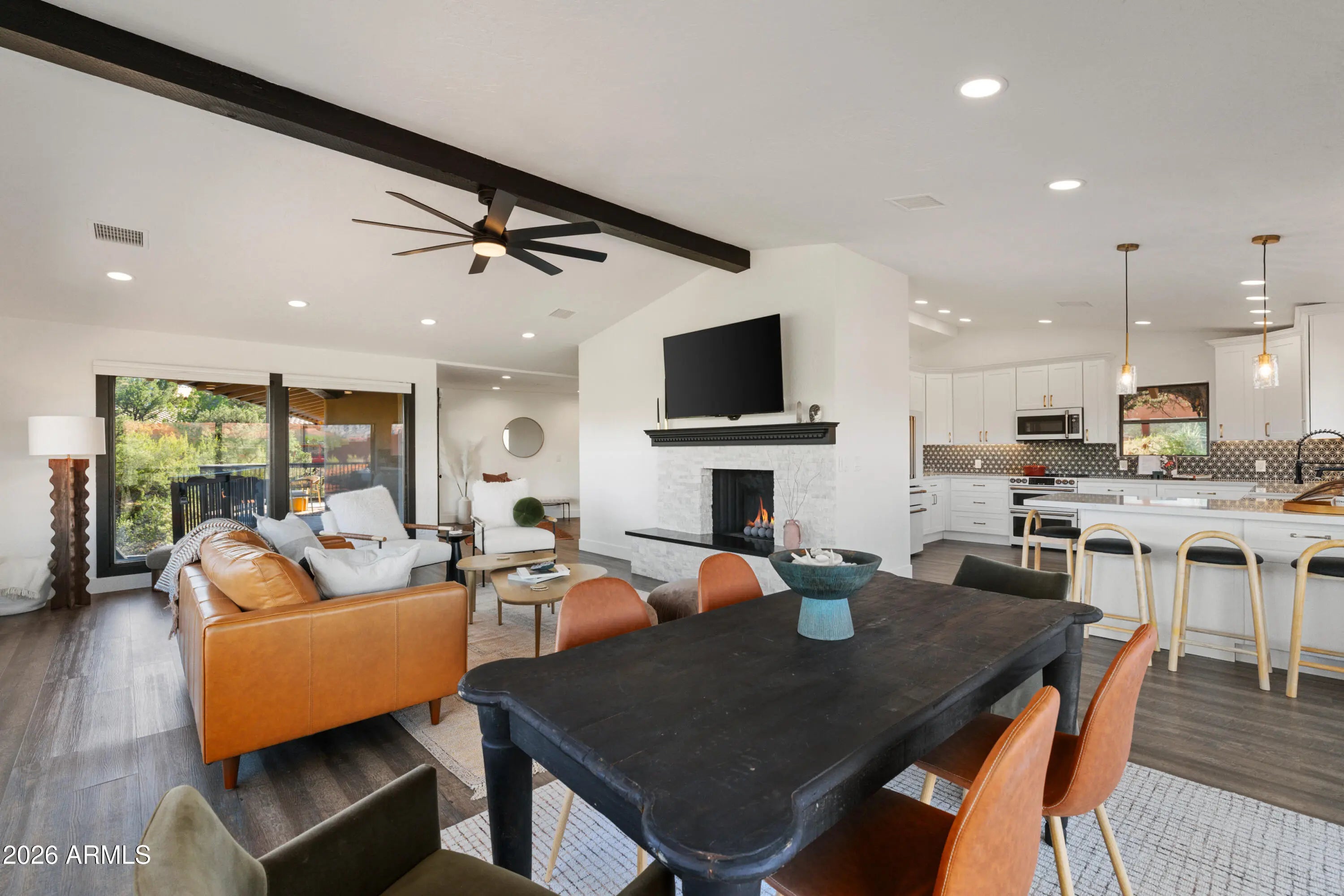 Elevated above the glittering city lights of Sedona with unobstructed 270° red rock vistas, this fully reimagined contemporary home has 3BD/2.5BA + a lower level flex bonus room. It delivers the trifecta of updated design, a gorgeous lot, and transcendent scenery. Picture windows flood the open-concept living space with natural light and ever-changing desert color. Remodeled inside and out, the home features clean lines and expansive open decks, creating effortless indoor-outdoor flow. Price also includes the adjacent .66-acre parcel for a combined 1.15 acres, amplifying privacy and presence. Beautifully staged to highlight its city-meets-nature setting. The owner holds AZ Real Estate Broker License. MORE DETAILS+PHOTO NARRATIVE: -------------- 300 CALLE DEL NORTE HIGHLIGHTS & DETAILS: Originally built in 1986 and intentionally positioned to capture the full sweep of Sedona's majestic red rock skyline, this home has undergone a thoughtful top-to-bottom transformation over the past three years. What once stood as a well-sited property with strong bones in the highly desirable Foothills South neighborhood is now a fully reimagined contemporary retreat -- refined, cohesive, and intentionally modern. Every surface has been reconsidered. Interior and exterior renovations were executed with an emphasis on clean lines, durability, and bright, neutral finishes. The result is far more than cosmetic improvement -- it is a true reinvention, blending modern influence with the warmth, proportion, and scale that Sedona living demands. The surrounding grounds received equal attention. Landscaping was groomed and reshaped to create a cohesive 1.15-acre setting with walking paths (inclusive of the adjacent parcel), increasing usable outdoor space while preserving the natural beauty that frames the panoramic views -- offering a private, park-like environment. A generous horseshoe driveway enhances both arrival presence and functionality, accommodating up to 6 vehicles. Set along West Sedona's main corridor, the property enjoys immediate access to town amenities and thoroughfares, making daily living and entertaining effortless. Elevated above the roadway, the home captures uninterrupted red rock vistas and city lights, pairing convenience with commanding views. With the inclusion of the adjacent parcel, the expanded 1.15-acre footprint opens the door to enhanced outdoor design opportunities. A future owner may choose to incorporate additional privacy landscaping, architectural screening elements, water features, fountains, or even a pool and spa environment -- further enriching the sensory experience of the outdoor spaces. Mature plantings, rustling trees, and thoughtfully designed hardscape features could create an even more immersive and layered landscape setting while preserving the property's panoramic outlook. (Buyer to verify expansion options with the HOA and compliance with all applicable CCRs.) Without exception, this is a property that has been carefully curated -- not flipped or rushed -- but deliberately refined by the seller, who lived in the home and personally served as the general contractor for the remodel. Explore the immersive 3D walkthrough and cinematic video tour to fully experience the layout, elevation, and panoramic view corridors this property offers. Continue to take a closer look at the layout, materials, improvements that define this property. All of the heavy lifting and expense has been taken care of for the new owner. NEW STRUCTURAL & MECHANICAL IMPROVEMENTS (2023-Present) -Composition shingle roof -Exterior Paint - Beige stucco with black trim accents -HVAC system including new ductwork and the addition of central air conditioning -Dual-pane energy-efficient windows and main sliding glass door -Electrical updates throughout with all new interior and exterior lighting NEW EXTERIOR ENHANCEMENTS (2023-Present) -2 new decks with composite plank floors +wood rails & bannisters -New asphalt driveway -Added Retaining walls and expanded hardscaping improvements -Added paver patio off third bedroom with enclosed pet area -Added upper yard paver patio creating additional outdoor space NEW SITE WORK & DRAINAGE (2023 to Present) -Comprehensive landscaping refresh with new decorative rock and gravel -Added groomed walking paths throughout the property -Added drainage channels and French drain systems installed for improved water management GARAGE & STORAGE (2025/26) -Full 2-car garage remodel including fresh paint, epoxy-coated floors, new garage doors, and quiet-open openers + coded entry pad -Expansive crawl space maintenance with groomed earth floor, lighting, w/fully sheathed walls & ceilings for mechanical protection and insulation integrity - TONS OF STORAGE! INTERIOR RENOVATIONS (2023-Present) The interior renovation reflects a cohesive, modern design palette centered on warmth, contrast, and functionality. INTERIOR FINISHES & DESIGN FEATURES FLOORING & PAINT -Whole-home luxury vinyl plank flooring in a dark walnut tone -Five-inch white baseboards throughout -Bright white interior paint with updated wall texturing -Warm, dense oyster-toned carpet in the primary suite & Bedroom 2 LIVING & ENTERTAINING SPACES -Open-concept living and dining areas adjacent to a spacious corner kitchen -Wood-burning fireplace with stone ledger accent wall and a black quartz hearth creating a striking focal point -Flooded with light coming in the large format wood encased picture windows and trimmed out w/black accent paint -Whole-home new doors, hinges, and hardware -Whole-home new lighting including plates, switches, receptacles KITCHEN -White quartz countertops w/gorgeous geometric starburst tile backsplash with metal button accents -Extensive white shaker-panel cabinetry, upper & lower with soft-close doors and drawers -Brushed bronze cabinet hardware -Ceramic apron-front sink w/gooseneck faucet with pull-down sprayer + a dedicated pot filler faucet -Air button disposal -White Matte-finish Café