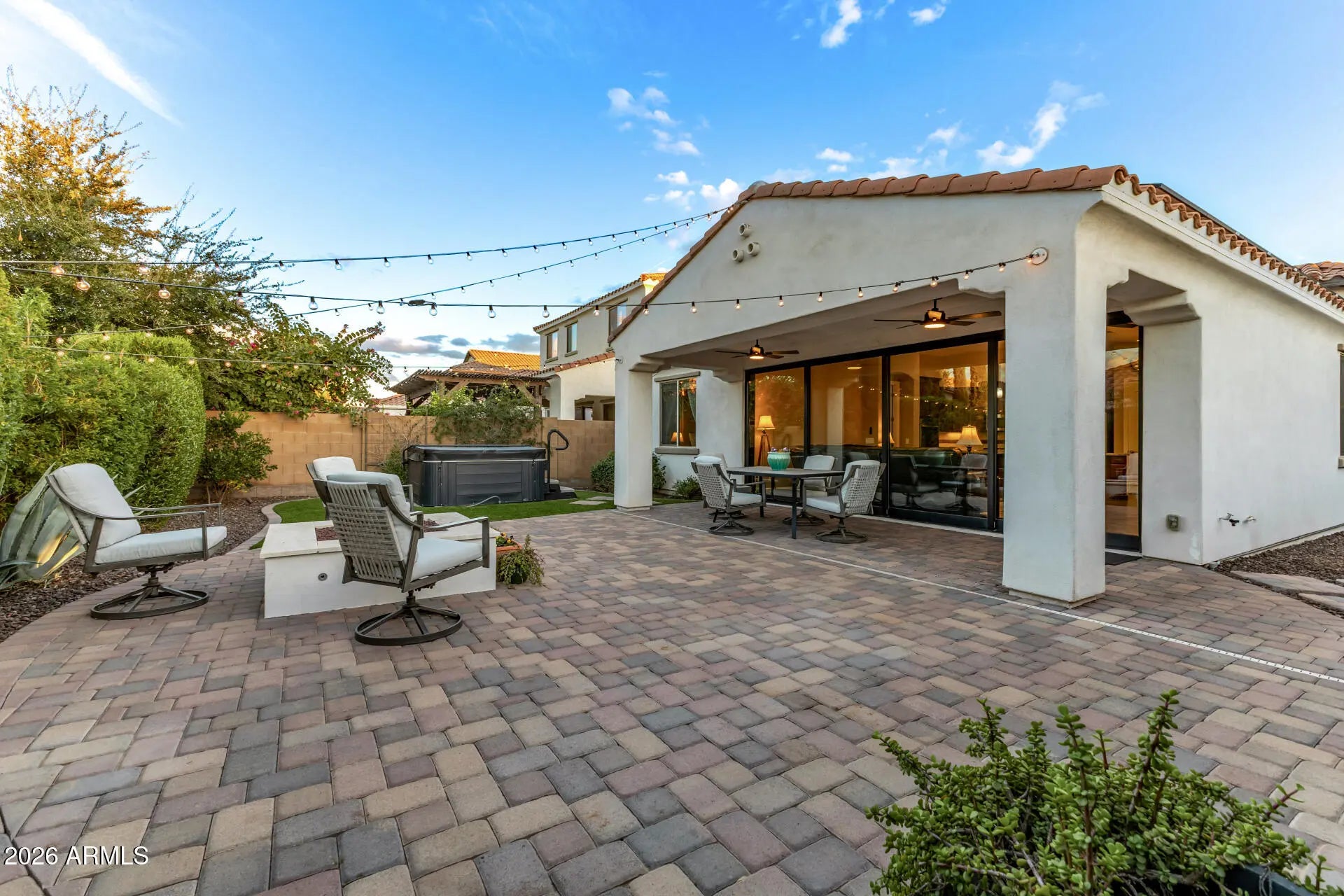Paid-off solar at close of escrow! Welcome to the award-winning community of Eastmark, where this highly upgraded 3-bedroom, 2-bath home offers exceptional style, efficiency, and comfort. From the inviting front yard patio to the elegant French double doors opening into a private office, every detail has been thoughtfully designed. Inside, you'll find vaulted ceilings, upgraded tile flooring, and designer finishes throughout. The chef's kitchen is a true showstopper, featuring a gas cooktop, double ovens, granite countertops, and a stylish tile backsplash -- perfect for everyday living and entertaining. A stunning 20' x 8' multi-sliding glass door spans the living room, creating seamless indoor-outdoor living and filling the home with natural light. Unwind in the upgraded primary suite, where the spa-inspired shower showcases beautiful tile work and modern finishes. Step into the fully upgraded backyard oasis, complete with artificial turf, pavers, and a cozy gas firepit -- ideal for relaxing Arizona evenings. Additional features include roller shades creating spaces for energy-efficient living. Don't miss out on enjoying the premier amenities, parks, and location!