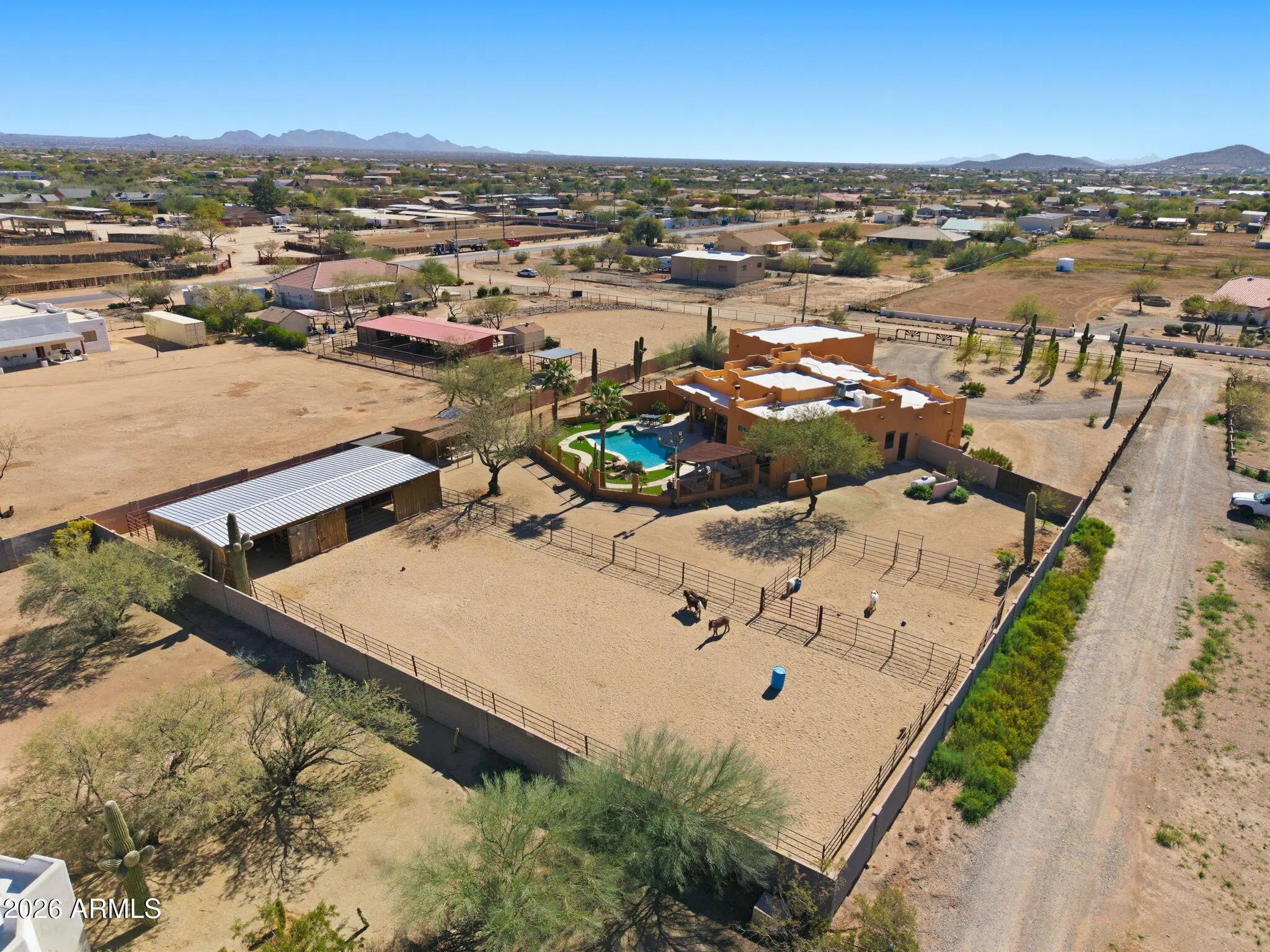 Luxury horse property on over an acre with sweeping panoramic mountain views and elevated equestrian living. The expansive grounds are thoughtfully designed with a horse corral, divisible stall, and generous space to ride, train, or expand equestrian amenities. Blending refined country living with functionality, the estate features a, pool, 5-car garage, two RV garages, and an RV gate ideal for trailers and equipment. Inside, light-filled interiors showcase soaring vaulted ceilings, plantation shutters, and elegant French doors opening to the patio. The spacious family room features a tiled fireplace and seamless indoor-outdoor flow. The chef's kitchen offers a granite center island and ample prep space, complemented by a versatile den/office. A resort-style backyard with built-in BBQ.