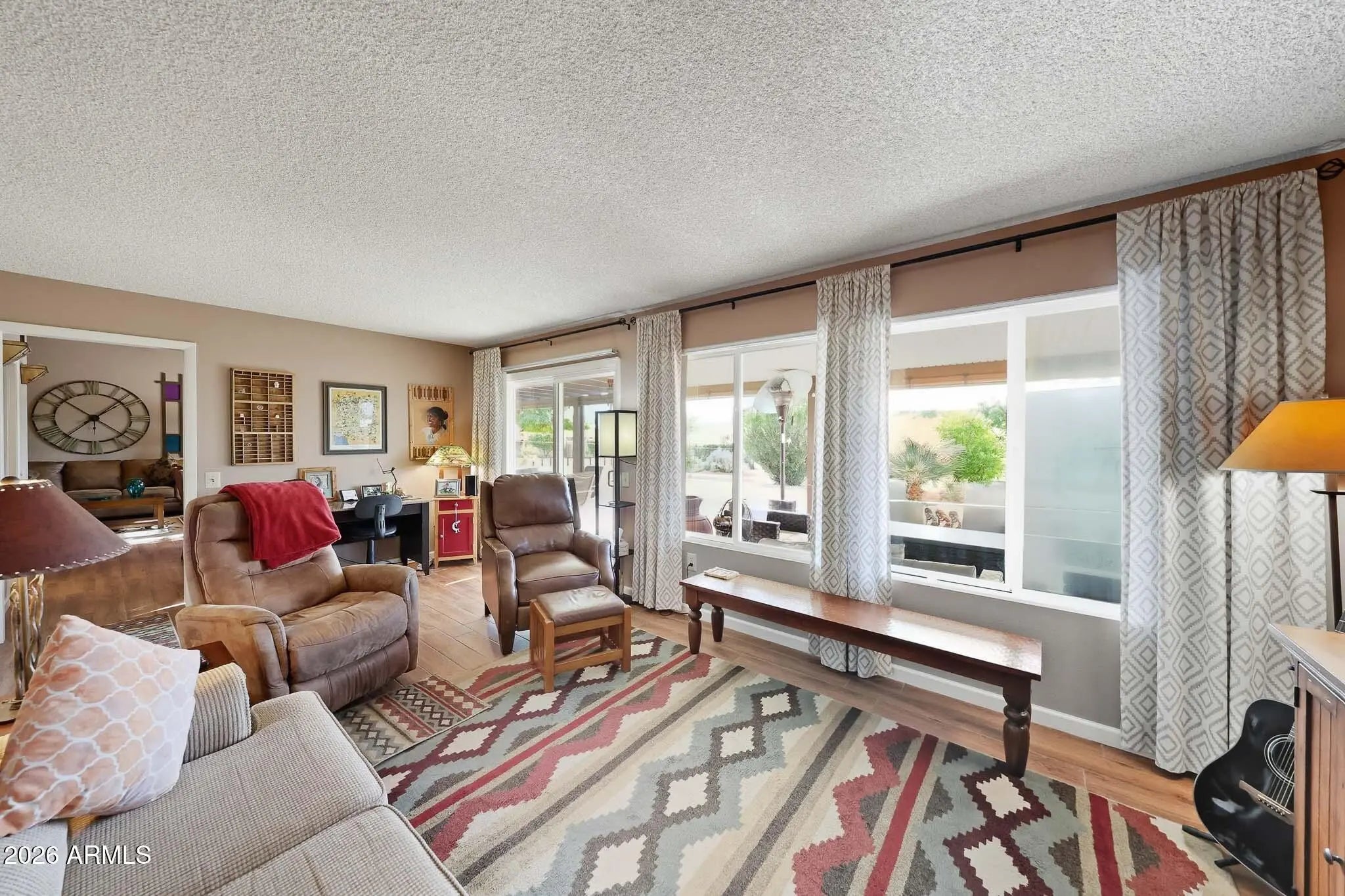Be Sure To See This Wonderful Georgetown Model Home In Sun City! From The Moment You Step Inside, You're Welcomed By A Spacious Living Room With Soaring Ceilings, Creating An Open And Airy Feel. Just Around The Corner, You'll Find A Functional Galley Kitchen That Flows Into Both The Breakfast Area And Dining Space, Offering Great Versatility For Everyday Living And Entertaining. An Arizona Room, Originally Designed And Built By Del Webb, Adds Valuable Bonus Space Perfect For Relaxing, Hobbies, Or Gatherings. The Home's Split Layout Places The Primary Bedroom And En-Suite Bath On One Side, While The Guest Bedroom And Guest Bath Are Nearby, Providing Comfort And Privacy For Visitors. Additional Updates Include Vinyl Dual-Pane Windows, Durable Ceramic Tile Flooring, Refaced Kitchen Cabinets And Updated Bathroom Vanities, Giving The Home A Well-Maintained And Move-In Ready Feel. Step Outside To The Covered Back Patio, Where You Can Enjoy Views Of Mature Fruit Trees. A Peaceful Setting For Morning Coffee Or Evening Relaxation. The Solar Lease Is Just $82 Per Month, Helping With Energy Efficiency, And The Water Softener Conveys With The Home. This Home Combines Charm, Functionality, And Smart Upgrades. Be Sure To Add It To Your Must-See List!