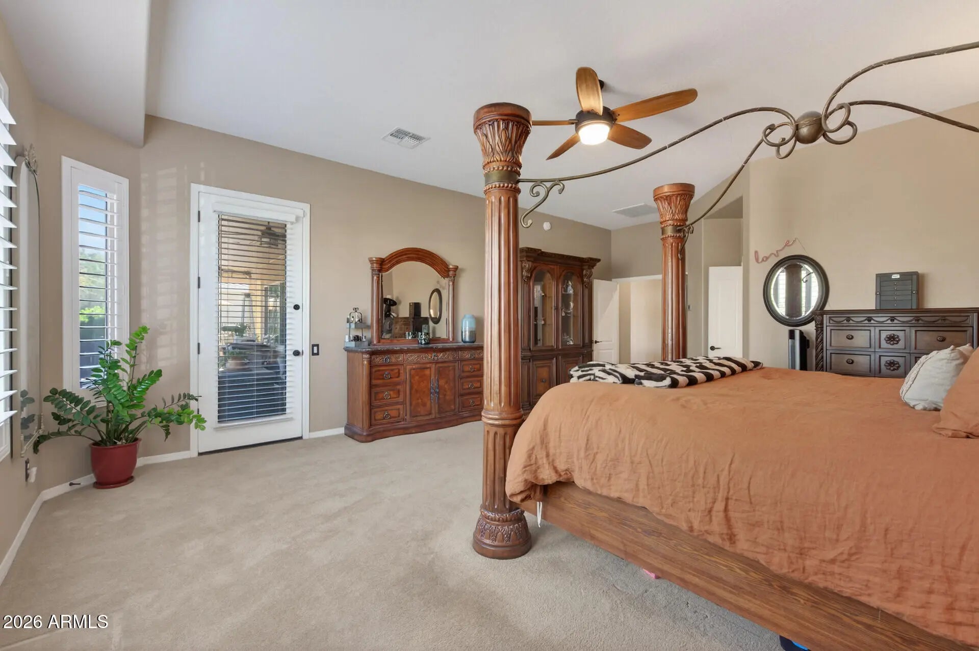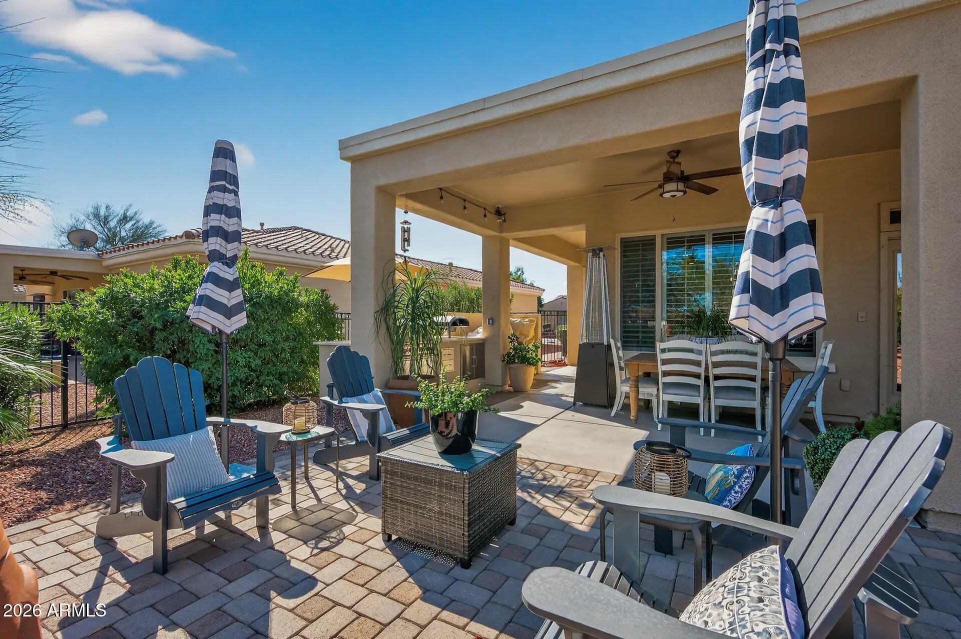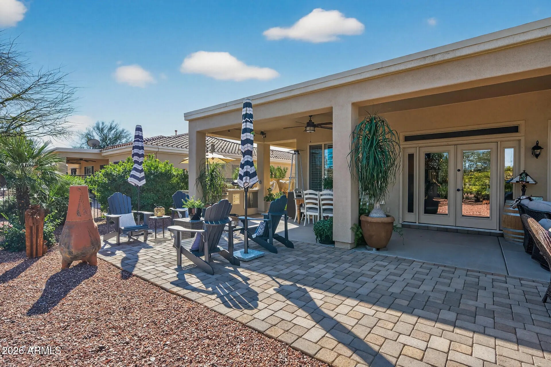 Corte Bella Corner Retreat. Elegant Mirada PLUS Casita floorplan offering 3 bedrooms, 4 bathrooms, including a full private casita, perfectly positioned on a premium corner lot. This 2,840 sq ft residence features a spacious open layout with a wet bar and sit-at counter, ideal for refined entertaining. Recently painted inside and out with tasteful upgrades including French doors, modern lighting, new ceiling fans, plantation shutters, comfort-height toilets, and updated bath flooring. Enjoy a private front courtyard, fenced backyard, and a new extended paver patio with outdoor kitchen. Additional highlights include a new HVAC in the casita and custom garage cabinetry. A perfect blend of comfort, sophistication, and low-maintenance luxury in this serene, gated community.