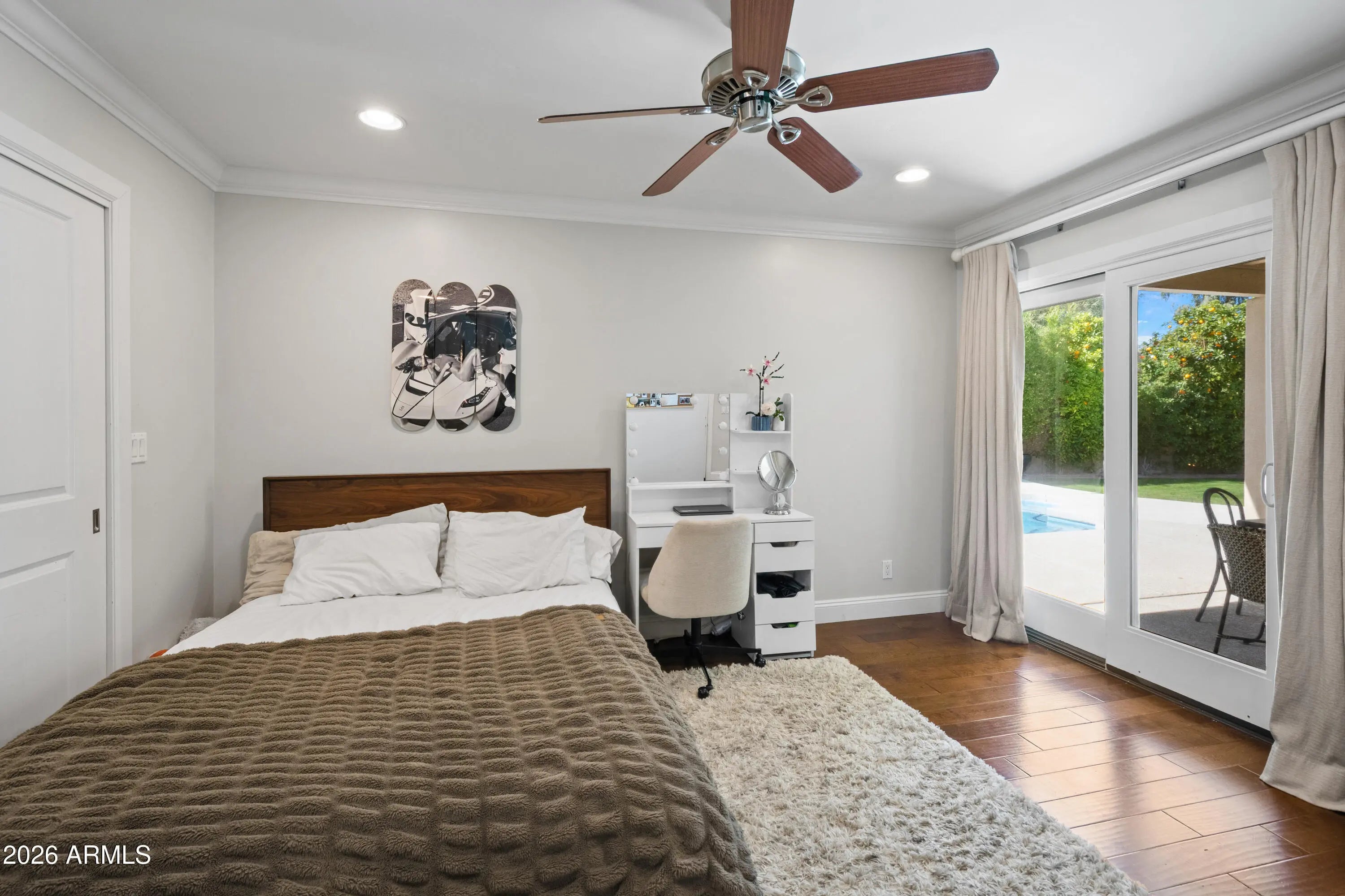 Idyllic ''The Dels'' home at the end of a culdesac on a 14,747 sq ft lot adjacent to Rotary Park in the coveted ''3C's'' school district. Great curb appeal, open concept with extra large kitchen & family room area. Home features several key, hard-to-find features such as a private ensuite secondary bedroom, a 300 sq ft climate-controlled pool house, new roof coating, & your own private gate to the path to Rotary Park. Home was carefully remodeled & offers gas range, dual ovens, SubZero built-in refrigerator in the wide, bright kitchen, wood floors throughout, custom wardrobe cabinetry in the primary closet, & crown molding. French doors take you to both front & rear patios. Rear yard features two grassy areas, outdoor FP, pool, BBQ, privacy landscaping, & plenty of deck space to entertain.