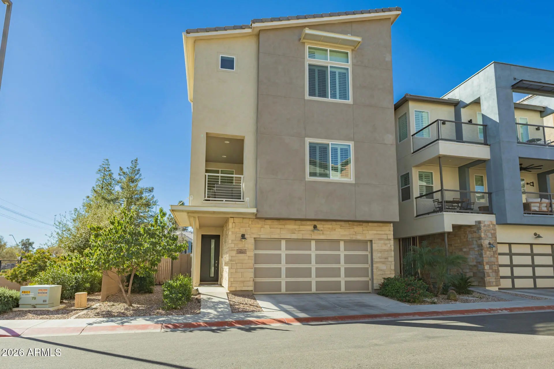 Rhythm community luxury contemporary 3-bedroom 4 bath home on a corner lot adjacent to community common area! Enter the game room/family room with a full bathroom then up to level 2 for the spacious open concept living, dining, gourmet kitchen with upgraded granite counters, generous island/breakfast bar,custom cabinetry with crown molding, chic pendant lighting, stainless steel appliances, a walk-in pantry, with recessed lighting, attractive wood-look flooring, balcony and office nook. The 3rd floor primary bedroom showcases soft carpeting, an ensuite with dual sinks, and a walk-in closet. Plantation Shutters throughout and automatic blinds on sliders. Lovely backyard, complete with an open patio, a built-in BBQ and pristine artificial turf. New 2025 A/C with split level temp control.