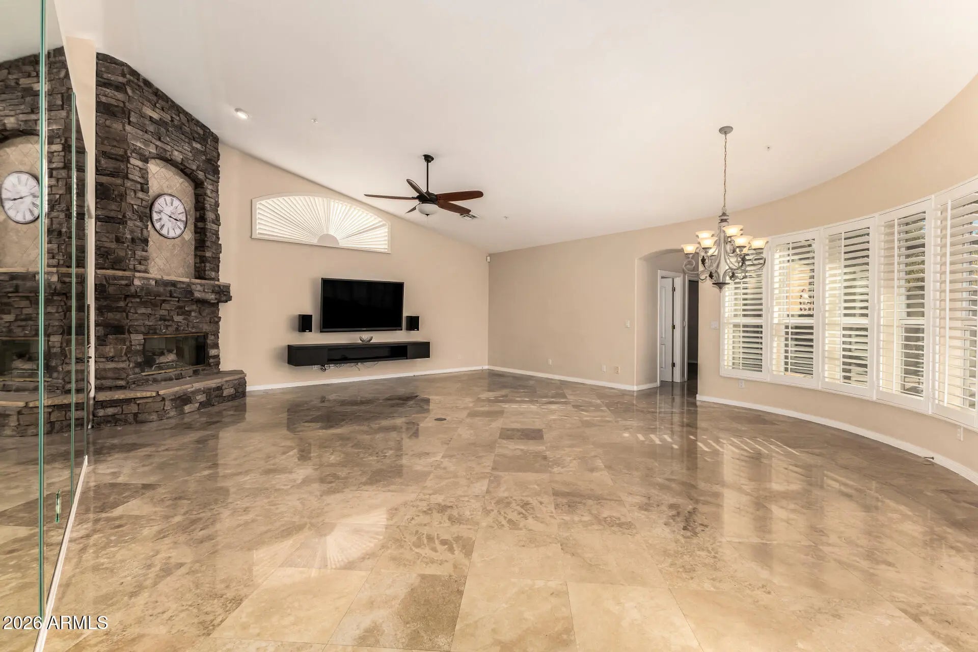 This beautifully appointed single-level residence blends timeless design with thoughtful modern improvements and exceptional indoor-outdoor living. Upon entry, soaring vaulted ceilings, elegant travertine flooring, and plantation shutters throughout create a warm yet refined ambiance filled with natural light. The custom front door--enhanced with decorative metal panels that open for airflow--adds both architectural character and everyday functionality. The kitchen cabinetry was thoughtfully remodeled in an enduring, classic style. A gas cooktop anchors the spacious island, while abundant cabinetry provides exceptional storage. The adjoining family room features a wet bar and a striking stone-faced gas fireplace, creating an inviting setting for both everyday living and entertaining. The primary suite offers a true retreat, complete with its own fireplace for added warmth and ambiance. The fully remodeled bathroom showcases a complete shower renovation, a freestanding soaking tub, dual sinks, and generous cabinet storage. An oversized walk-in closet includes a built-in safe for added security. Large secondary bedrooms provide comfort and flexibility, and the private guest quarters can easily be converted into a casita--ideal for extended guests, multigenerational living, or a dedicated home office. Additional highlights include a dedicated laundry room with cabinetry and sink, central vacuum system, water softener, and a spacious 3-car garage complete with built-in storage cabinets and a separate storage closet. The desirable south-facing backyard is designed for year-round enjoyment, featuring a sparkling pool with a dramatic boulder water feature, screened-in patio, and a pavered ramada with a gas line for BBQ--perfect for entertaining and enjoying Arizona's winter sun. A rare blend of thoughtful upgrades, functional luxury, and resort-style amenities--this home offers both comfort and elevated living.
