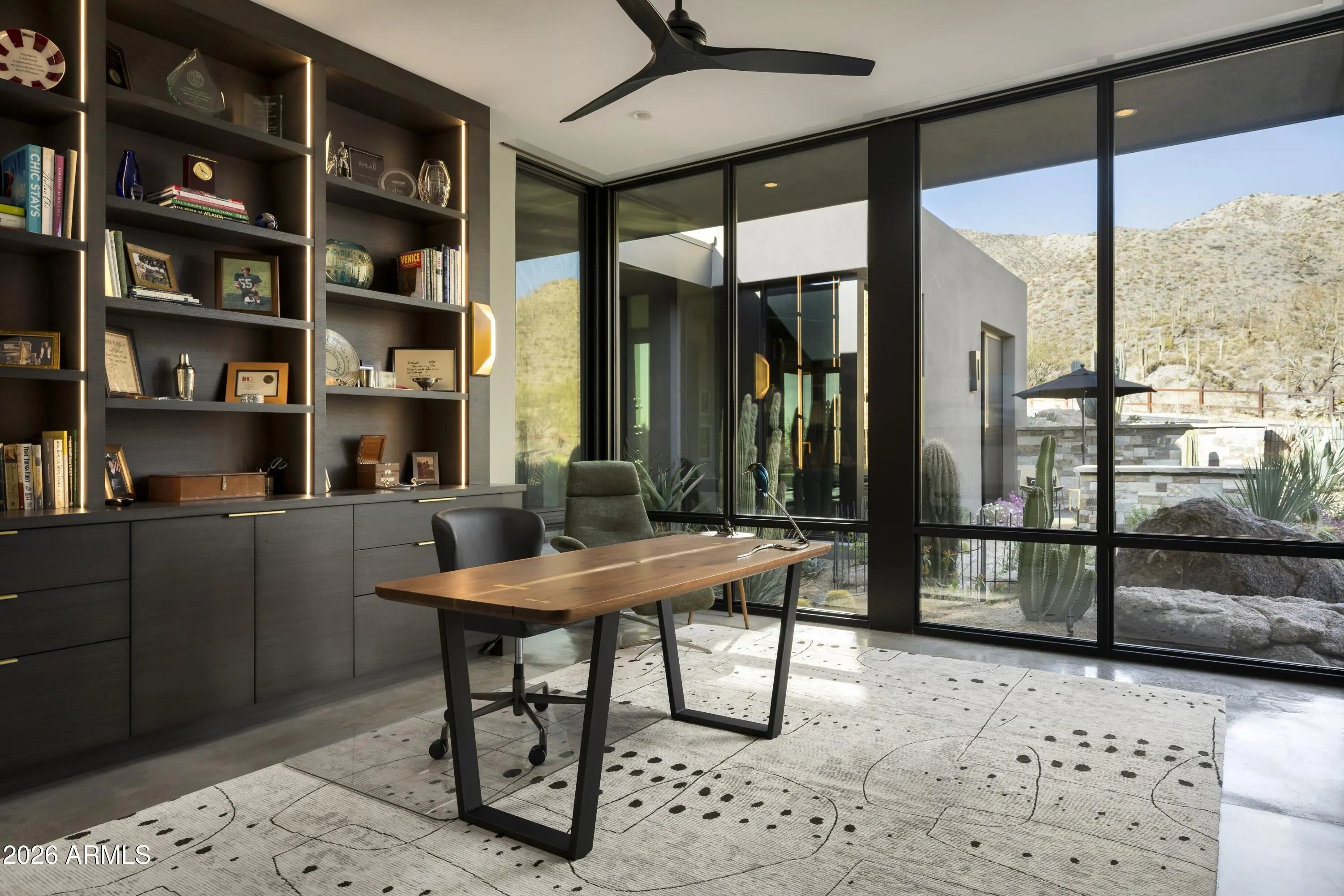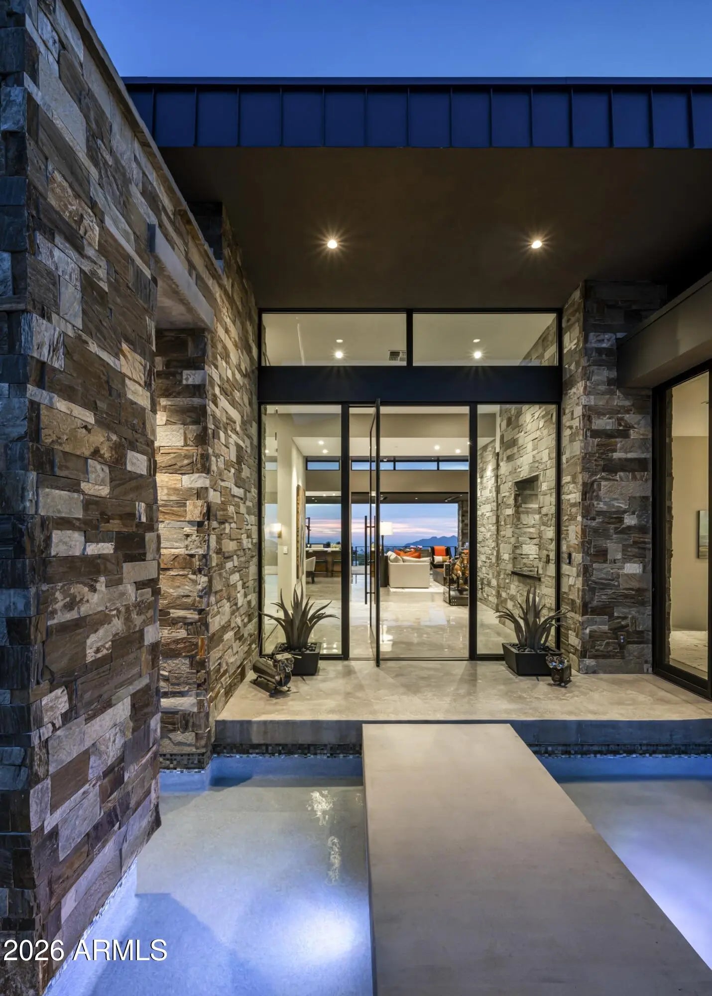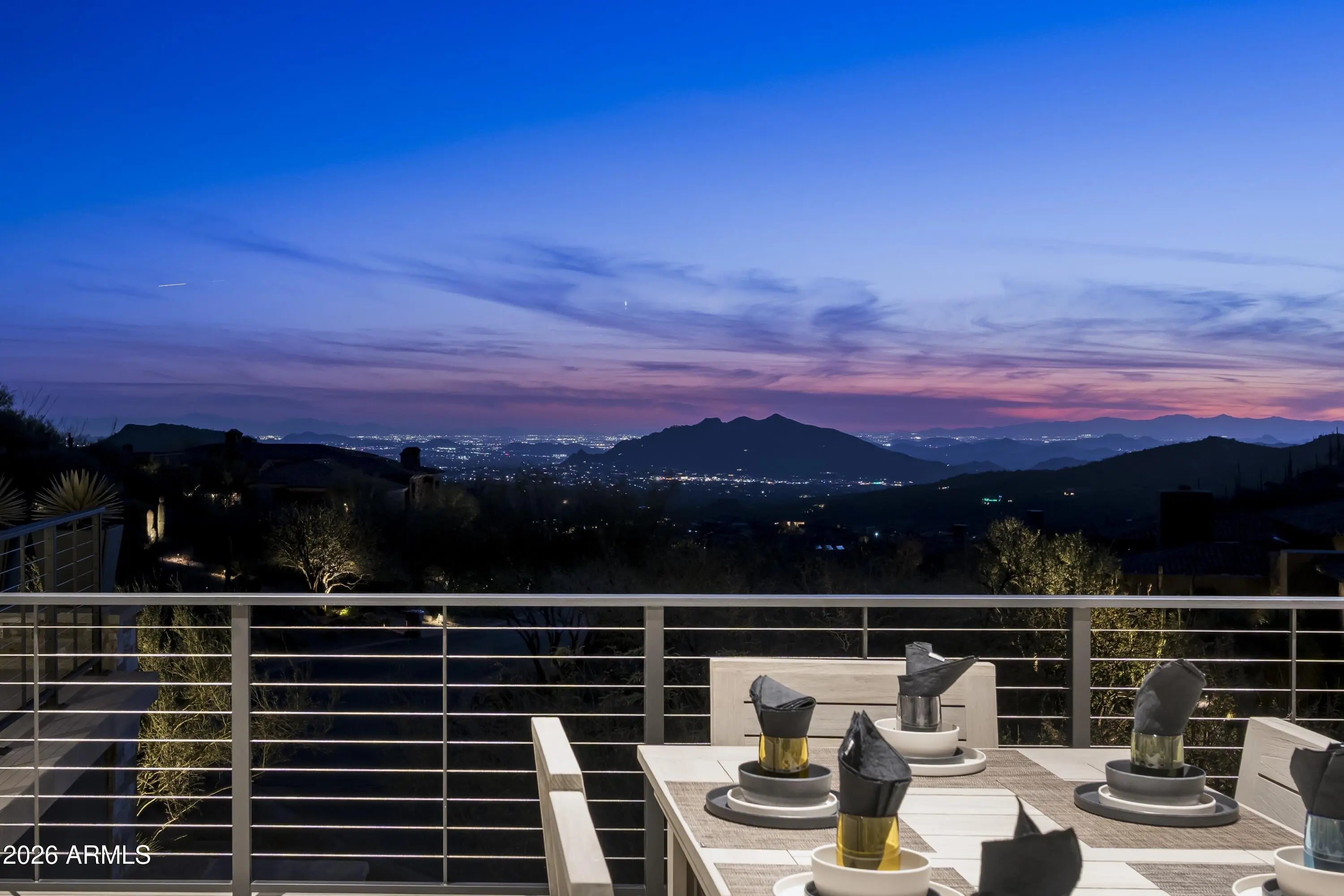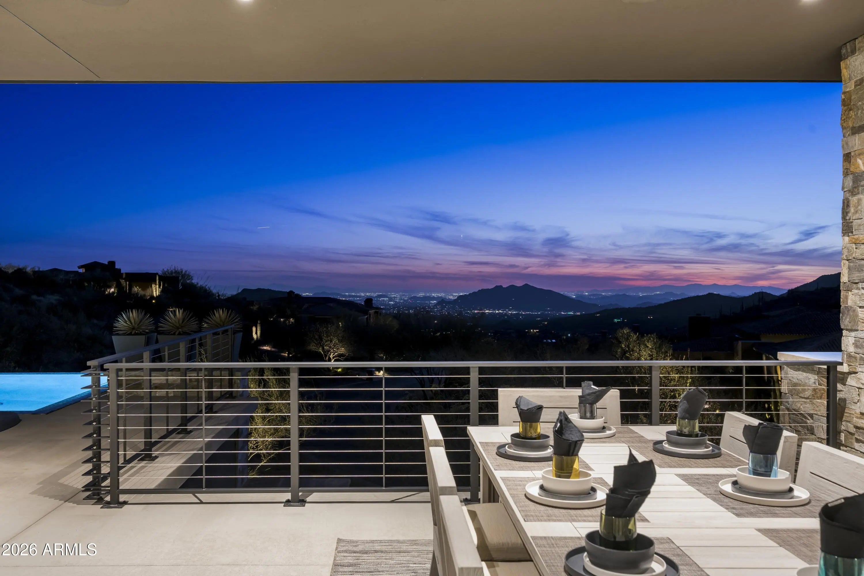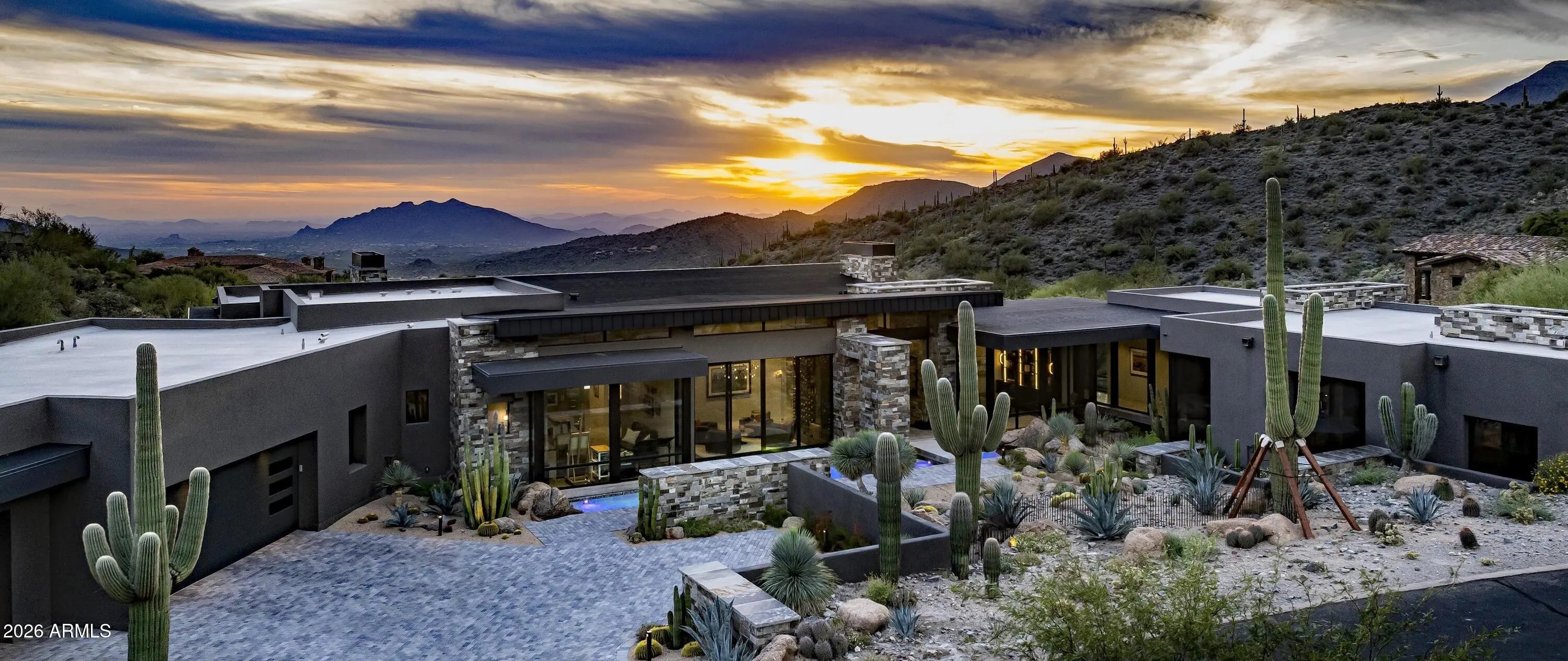 Extraordinary custom home situated on one of the highest elevation points in Desert Mountain delivers the epitome of luxury living, showcasing prime, highly sought-after views with unparalleled privacy. Sleek and sophisticated architectural design, 15-foot soaring ceilings, and plentiful windows blended with a natural palette of stone, glass, and water creates an inviting environment, bringing to the forefront the sheer splendor of the surrounding panorama. This ultimate retreat offers tranquility and open space on an 8+acre hillside lot, nestled within the guard-gated luxury Village of Saguaro Forest in the private upper canyon in Desert Mountain. Incomparable engineering with innovative techniques brings the scenic desert terrain into living spaces with seamless indoor and outdoor transitions, defining the premier Arizona lifestyle. A transparent floor-to-ceiling wine cellar adorns the bespoke cocktail lounge, where a sleek linear water feature traces the window's edge, framing dramatic mountain silhouettes and ensuring every gathering is a spectacular departure from the ordinary. The bright and airy chef's kitchen is an ideal blend of both design and functionality, clad with premium finishes and fixtures, stone counter surfaces along an expansive social island for entertaining guests. Visitors are sure to enjoy the coffee bar alcove along with an interior glass-walled bridge to access the attached guest wing. Generous ensuite guest quarters with private patios and a lounge are just a few of the amenities. Alluring courtyard entry with linear water feature, pivot door and walls of glass bring forth the majestic ridgeline mountain views from the front of the home, while the grand patio along the back offers sweeping city lights, mountain, and sunset views. Fire and water feature accents set the scene for making memories while dining alfresco and overlooking the valley below. 2025 Winner of Merit - Best One-of-A-Kind Golden Nugget Award and one of only five elite finalists for the prestigious Golden Nugget Grand Award. **Skip the waitlist - a Desert Mountain Golf Club Membership is available with this property.** ****HOME HIGHLIGHTS**** Completed: December 2024 Home: 6,917sqft Covered Outdoor: 2,594sqft Hillside View Lot: 8.45 acres Single-Level Home 5 Bedrooms | 5.5 Baths Gourmet Kitchen Expansive Pantry w/ Wine Dispenser Executive Office Creative Studio/Flex Room Zen Yoga Sanctuary Full Service Indoor & Outdoor Bar Telescoping Walls of Glass Linear Waterway Entry 2nd Washer & Dryer in Primary Dressing Room 3rd Washer & Dryer in Guest Suite (4th Bedroom) 5-Car A/C Garage + EV Charger Spacious Motor Court South/Southwest Facing Grand Pool Patio Builder: Platinum Companies Desert Mountain Golf Club Membership Available
