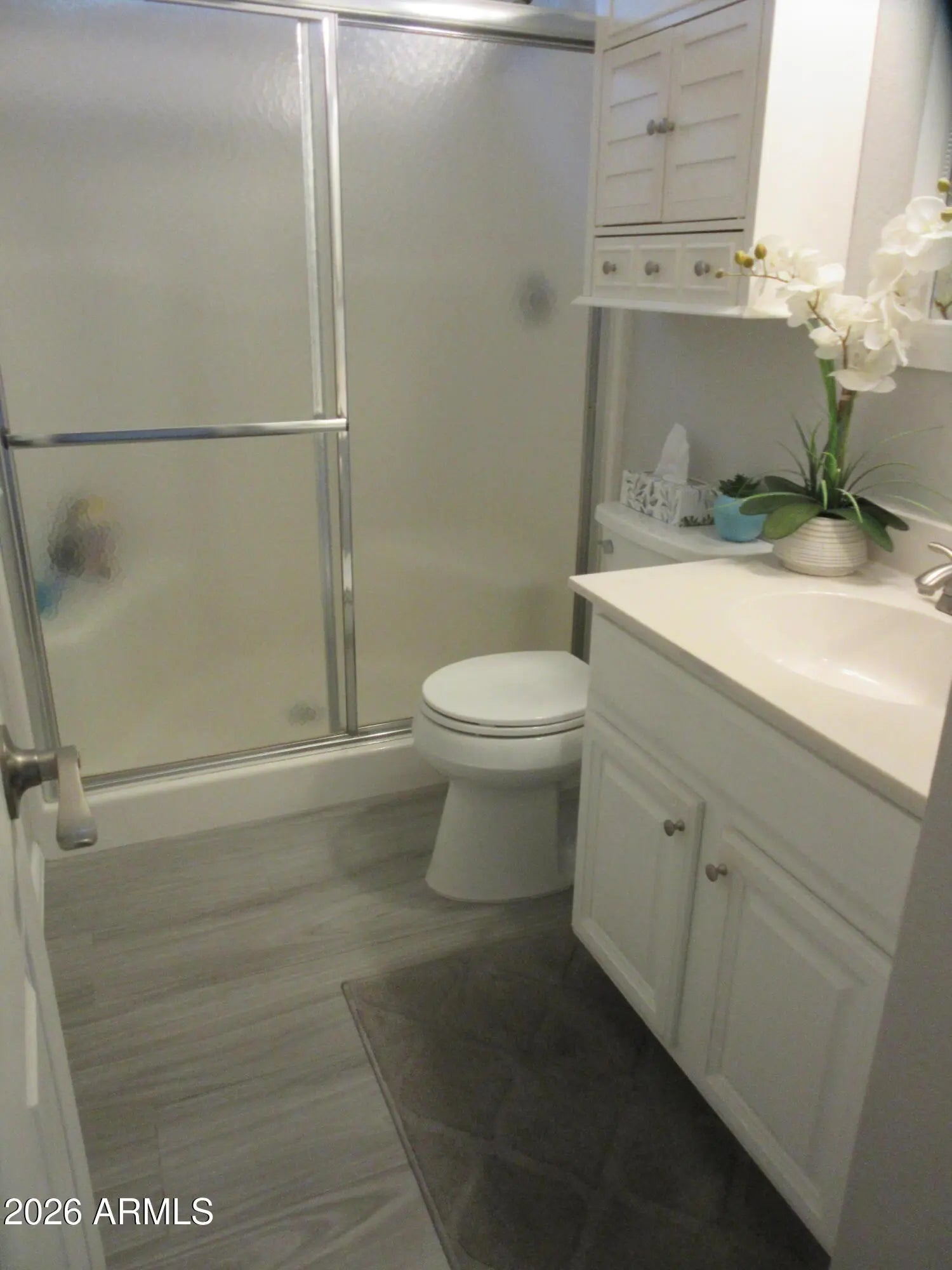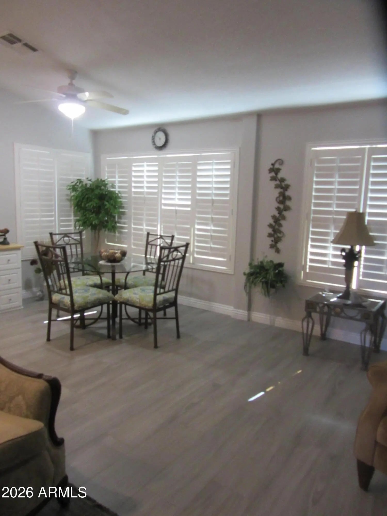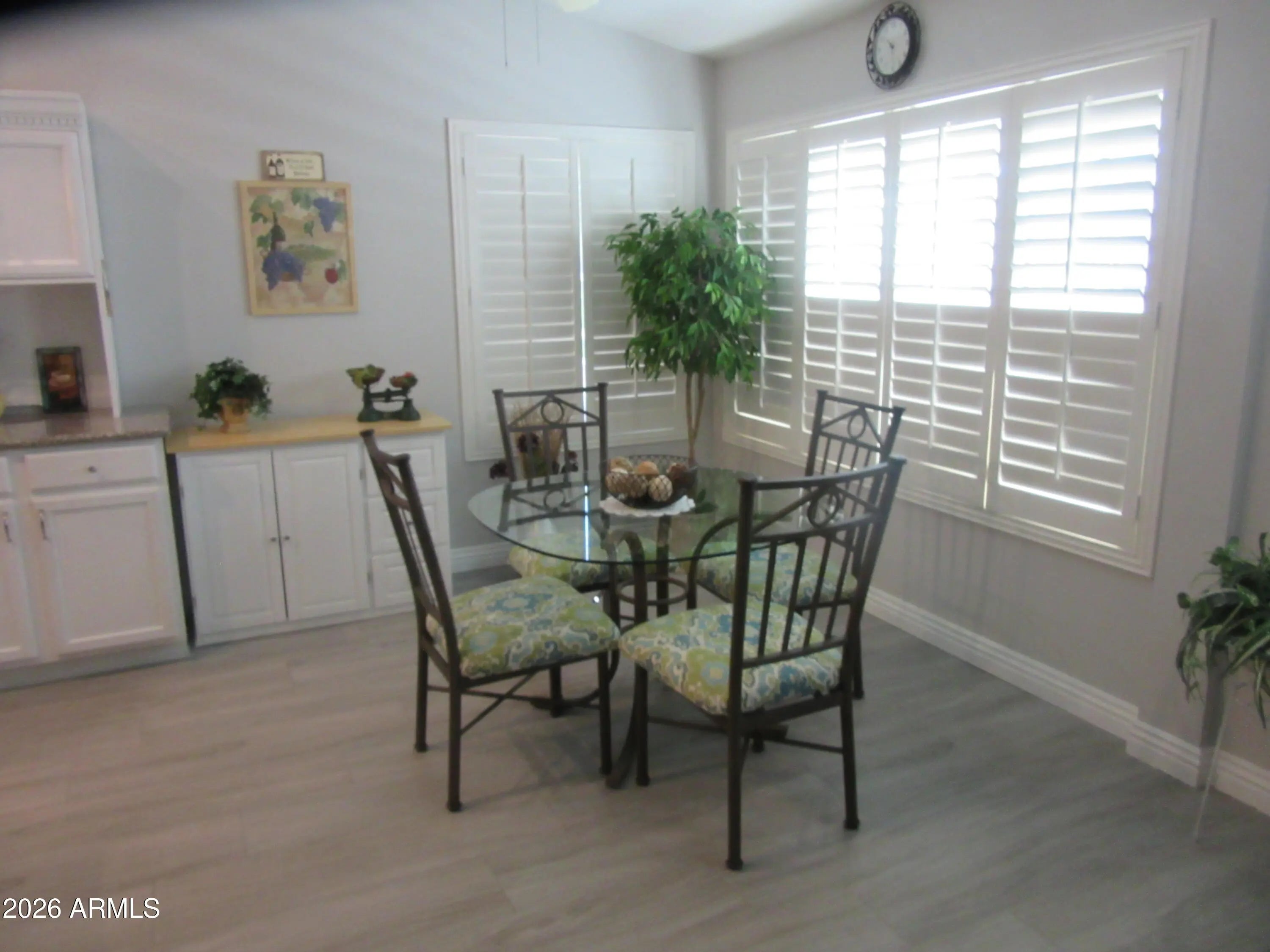 Updated and extended beautiful Popular Carmel Model. New Floor Tile that looks like wood planks, in all rooms. No popcorn ceiling, Kitchen cupboard are white and there is Granite counter tops. Additional cupboard in Kitchen area. recessed Ceiling lights in kitchen. White Plantation shutters in Living Room and Master Bedroom. Walk-in master closet. Private back area with gate that leads to walking path in the back of home. Front Patio. Dual Pane Windows. Newer A/C only couple of years old. Ceiling Fans Storage Cabinets in Garage.