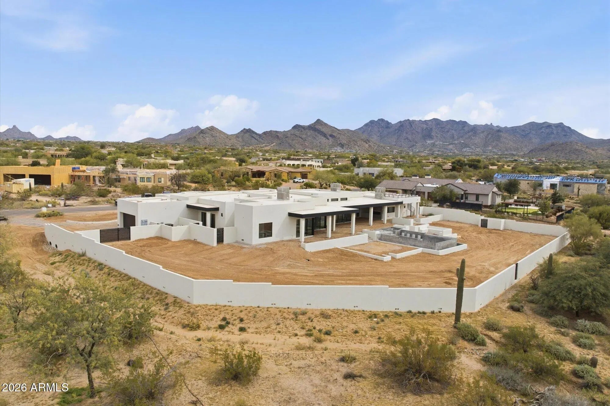 Commanding breathtaking mountain views across nearly 1.567 acres in the prestigious Pima Acres enclave, this newly constructed architectural estate embodies the pinnacle of modern desert luxury. Encompassing 6,792 square feet, the residence features five private bedroom suites, five full baths, two powder rooms, and a versatile flex space thoughtfully designed for elevated living. A welcoming front patio with a statement fireplace sets the tone, offering an intimate vantage point to enjoy sweeping mountain vistas and seamless indoor-outdoor living. Inside, a grand great room anchored by a dramatic stone fireplace flows effortlessly into the chef's kitchen and an elegant dining area highlighted by a striking wine wall--crafted for refined entertaining. The primary suite serves as a true private retreat, complete with a spa-inspired bath, soaking tub, expansive walk-in closet, and a dedicated lounge or wellness space. Throughout the home, curated designer finishes, custom cabinetry, and meticulous craftsmanship reflect an uncompromising attention to detail, complemented by an oversized four-car garage. Outdoors, a resort-caliber setting awaits with an expansive covered patio, outdoor kitchen, cascading pool with swim-up bar, thoughtfully positioned fireplace seating, and a secluded spa--all set against sweeping desert vistas. Ideally located in Scottsdale, this exceptional estate offers a rare fusion of architectural sophistication, privacy, and resort-style living. Developed by Sheshadri Estate Properties, it reflects the brand's signature approach to bespoke luxury--where refined architecture meets intentional, wellness-focused design.