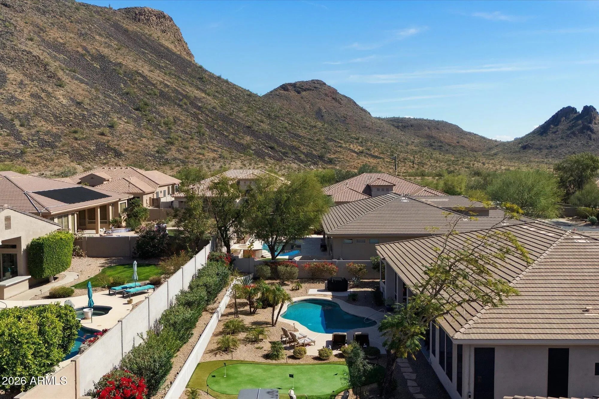 Welcome to 13526 E Del Timbre Drive, a meticulously maintained single-level residence, with no interior stairs, tucked within the quiet, gated enclave of Carino Canyon in Scottsdale. Bordering protected land, this community offers lasting privacy and peace of mind allowing you to enjoy a serene residential setting surrounded by undisturbed natural beauty. Lovingly cared for by long-time owners, this home is truly move-in ready, with years of thoughtful upgrades and ongoing maintenance that are immediately evident the moment you step inside. Offering 3,292 sq. ft., this well-designed layout features a split floor plan with 5 bedrooms, 3.5 bathrooms, and a 3-car garage. Every square foot is purposefully allocated, with no obsolete spaces, creating a layout that aligns with modern living. An extensive remodel completed in 2014 transformed the home with quality and thoughtful upgrades that continue to stand the test of time and make this property stand apart from other homes built around the same time. Inside the home, the improvements included a full remodel of the kitchen, primary bathroom, and secondary bathrooms, complemented by additional upgrades like Italian porcelain tile flooring throughout most of the home, LED lighting, remodeled laundry room, and updated baseboards. Outdoors the improvements included the addition of gas to support a pool heater and designated barbecue area, a standalone Bullfrog spa, and a private putting green, all of which enhance the outdoor lifestyle. Maintenance and improvements continued well beyond the remodel, reflecting pride of ownership throughout. A new irrigation system was installed in 2015 with a wireless controller added in 2025, HVAC units were replaced in 2016, partial window replacements were completed in 2024, backyard lighting was added in 2025, and the pool was resurfaced with Pebble Tec in 2021 along with the addition of new border tile, and the pool motor was replaced in 2024. Now let's get into the details of the floor plan. When you step inside you're welcomed into the great room with abundant natural light and centered around views of the backyard and patio, creating a bright and welcoming atmosphere. The kitchen is a true centerpiece of the home, designed for both function and style, with abundant counter space, storage, and a natural flow for your home chef. An oversized island with gas cooktop anchors the space, surrounded by alder wood cabinets, quartz countertops, a wine cooler, drink refrigerator, and a striking granite sink. The kitchen's seamless connection to the family room enhances ease of living and entertaining. The family room itself features an oversized window to showcase the majestic mountain view which also features an automated shade for when it's time to dim the lights and watch your favorite movie. The spacious primary suite is privately positioned away from the remaining bedrooms and offers ample room to create a personal retreat, complete with beautiful mountain views to enjoy each morning and evening. The primary bathroom features a jetted Jason tub for a spa-like retreat at home, a separate shower that meets accessibility standards, dual sinks with granite countertops, and a generous walk-in closet. The four additional bedrooms are located on the opposite wing of the home, providing flexibility for a variety of uses such as home offices, workout space, hobby rooms, or guest accommodations. The additional bathrooms were thoughtfully updated with quartz countertops, alder wood cabinetry, and carefully selected hardware that ties everything together. Mountain views can be enjoyed from the family room, great room, primary bedroom, and the backyard patio and pool area, creating a strong connection to the surrounding desert landscape without having to leave your home. The backyard is beautifully designed with multiple usable spaces, including a sprawling covered patio ideal for outdoor dining and relaxation. A BBQ pad has been installed with a gas line, for convenient BBQ hookup, or making future built-in BBQ additions simple and convenient. Seating areas and a private putting green add both fun and functionality to this inviting outdoor retreat. As an added bonus, that perhaps you didn't realize mattered until you saw it, is that the home also benefits from abundant street parking with no driveways across the street, making it ideal for entertaining and hosting guests. This home offers the rare combination of privacy, thoughtful upgrades, mountain views, and a prime Scottsdale location within a gated community that borders protected land. 13526 E Del Timbre Drive is a residence where care, quality, and lifestyle come together seamlessly, ready for its next chapter.