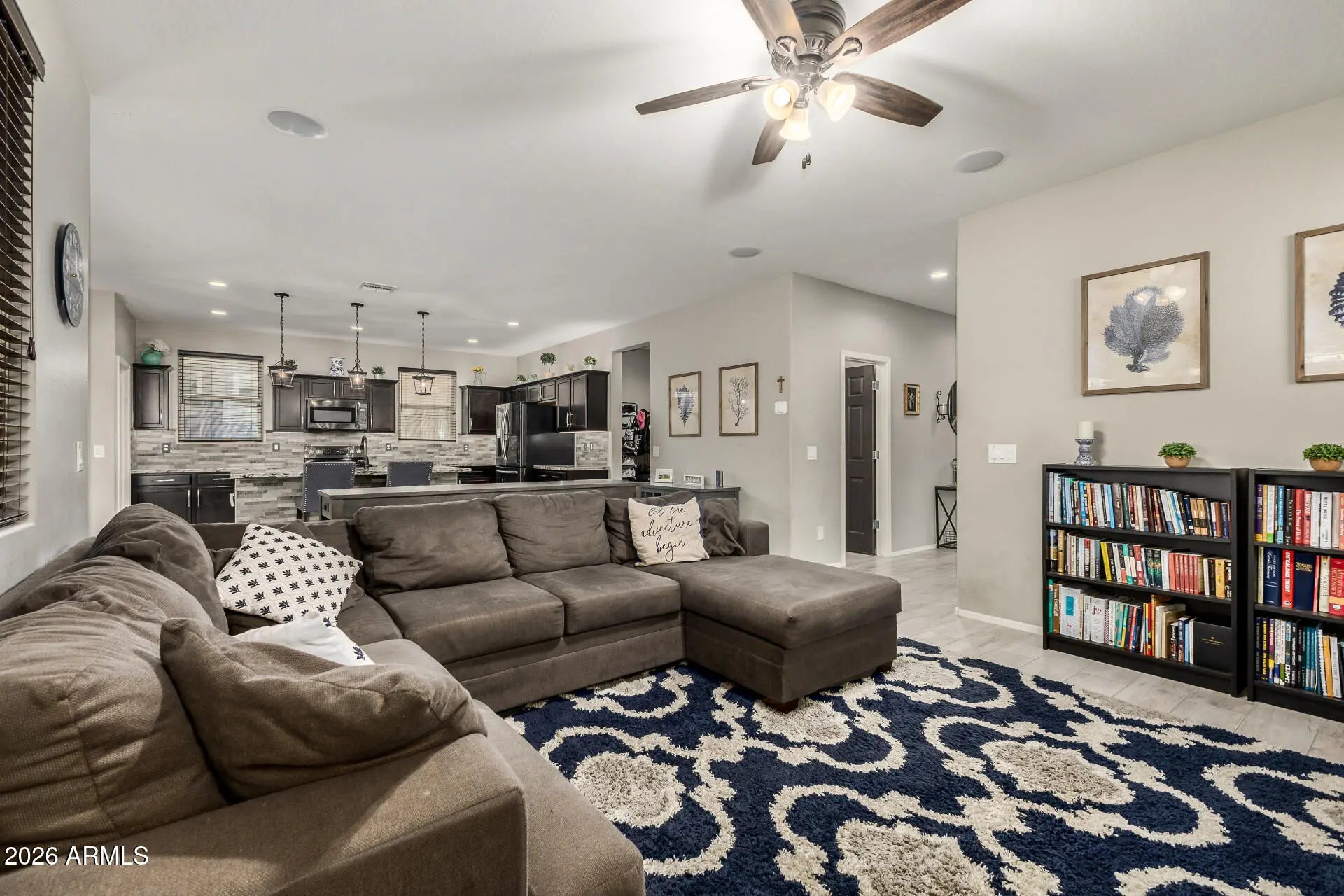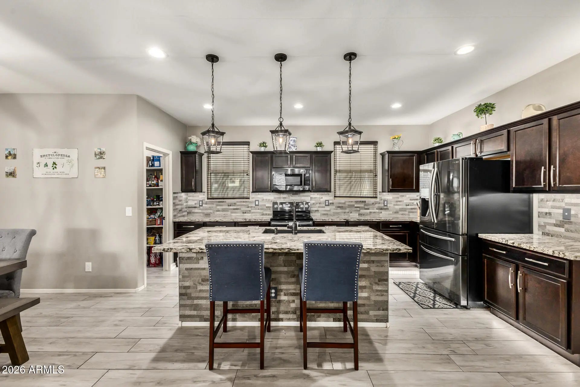 Welcome to this stunning 4-bedroom home in The Meadows! Featuring soaring vaulted ceilings and a spacious open floor plan, this home is designed for comfortable living and easy entertaining. The oversized kitchen shines with granite countertops, stainless steel appliances, prep island with breakfast bar, tile backsplash, pendant lighting, and a walk-in pantry all flowing seamlessly into the large family room with pre-wired surround sound. Enjoy energy savings with solar panels, plus flexible space with a den and loft. The expansive primary suite offers dual sinks, a makeup vanity, and a large walk-in closet. The backyard is built for Arizona living with a covered patio, built-in BBQ, fire pit, and ample seating. Community amenities include parks, pool, and walking trails.