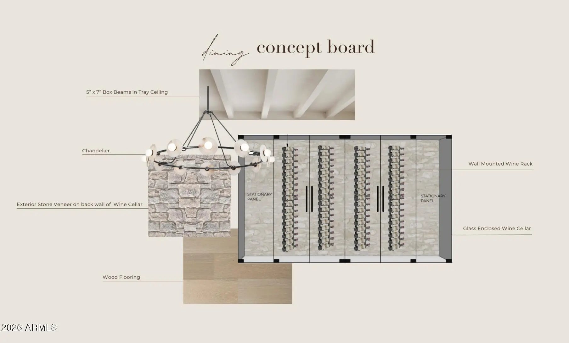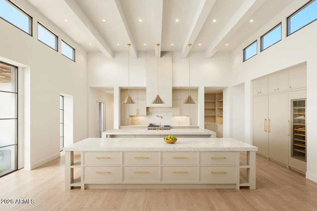 Tucked into the heart of the highly sought-after Cactus Corridor, this brand new build captures the best of modern farmhouse design paired with organic desert living. Designed by The Lifestyled Co., with architecture by Grady Olsen Design and landscape architecture by Shearon Design Co., this 6 bedroom, 6.5 bathroom home was thoughtfully brought together with both style and livability in mind. Inside, soaring ceilings with exposed beams and curated modern lighting set the tone, while oversized wood built-ins and gas fireplaces with custom limestone surrounds anchor the main living spaces. The layout feels open yet intentional, centered around a chef's kitchen featuring double islands, panel ready Sub-Zero and Wolf appliances, a 24'' panel ready wine tower, custom cabinetry, and a ... full butler's pantry. A striking glass enclosed wine display in the dining room adds a true statement moment, while a custom wet bar with granite countertops enhances the home's entertaining capabilities. Oversized pocket sliding doors create an effortless transition to the outdoors, filling the home with natural light. The primary suite offers a private retreat with a spa inspired bath, complete with a steam shower and a custom vanity featuring hanging double sided mirrors. Throughout the home, thoughtfully selected tile flooring in custom patterns, along with a moody and elevated office design, add depth and character to each space. The property also includes an approximately 800 SF detached pool house, offering flexible space for guests, a private office, or a wellness retreat. Out back, the yard is designed for true Arizona living with a resort style pool and spa, sport court, and beautifully integrated outdoor spaces that complement the surrounding desert landscape. Additional features include a 4 car garage, smart home technology, and prewiring for automated shades. Located in one of Scottsdale's most desirable neighborhoods, this home offers a seamless blend of design, function, and location. Estimated completion December 2026. Semi customizable design options are available for buyers who secure the home under contract within the next 60 days.