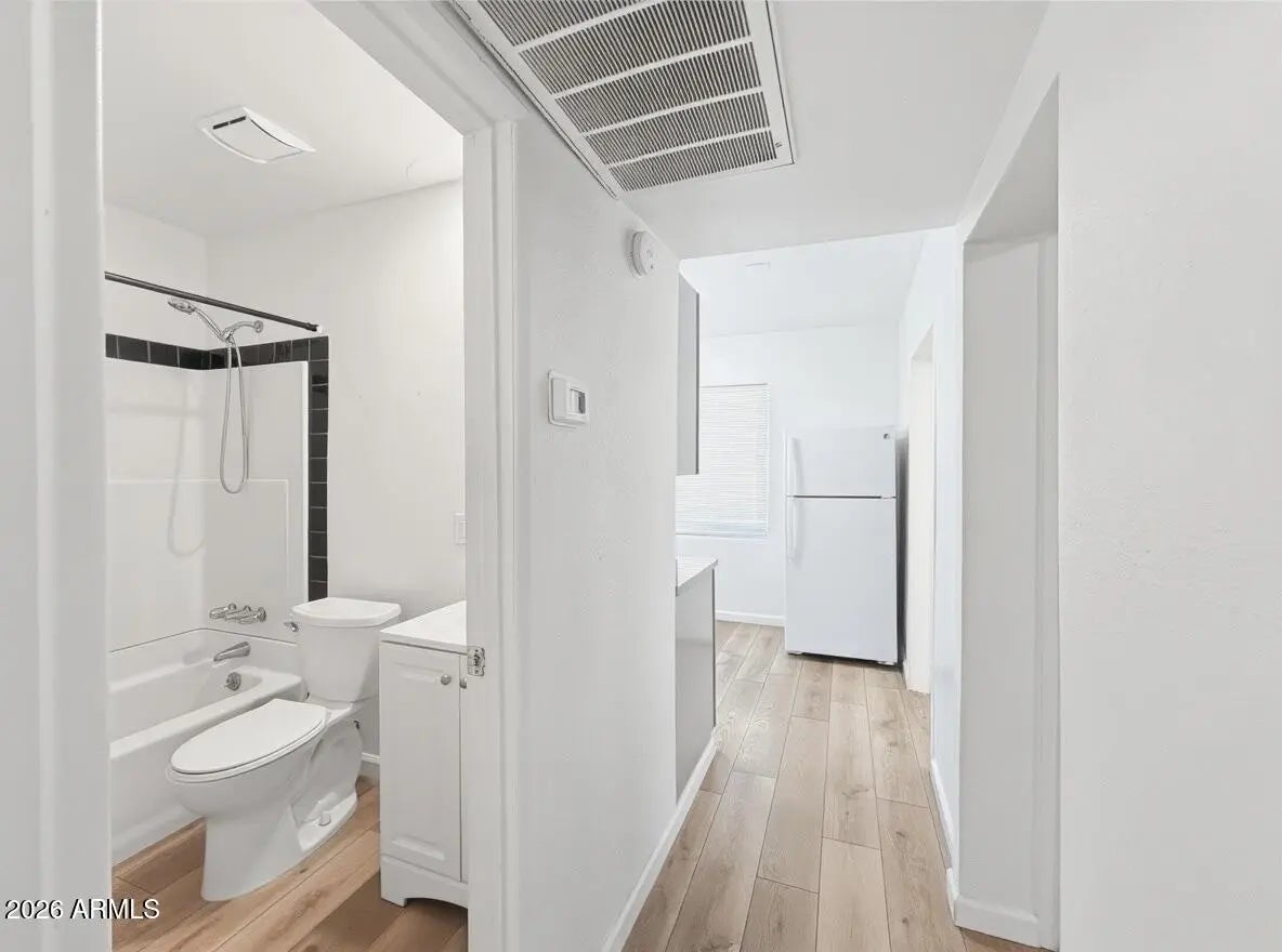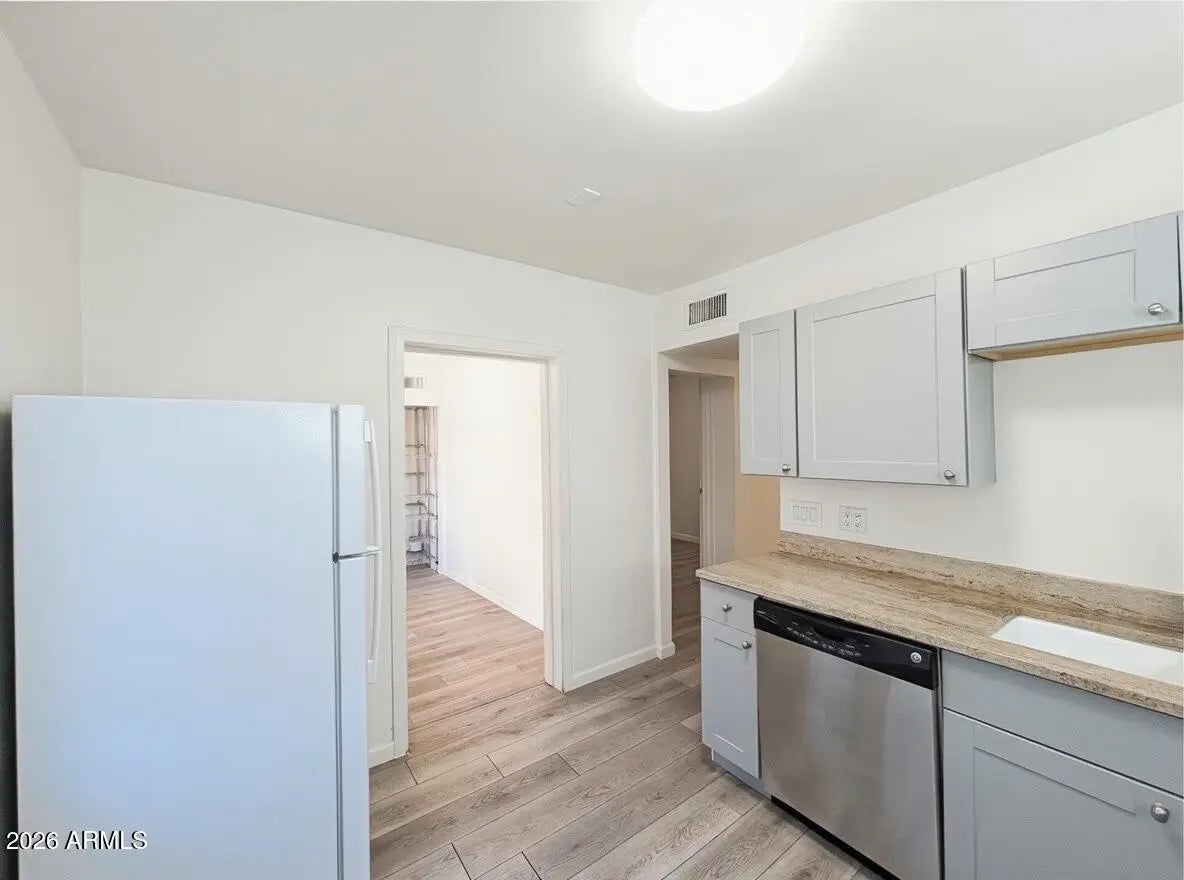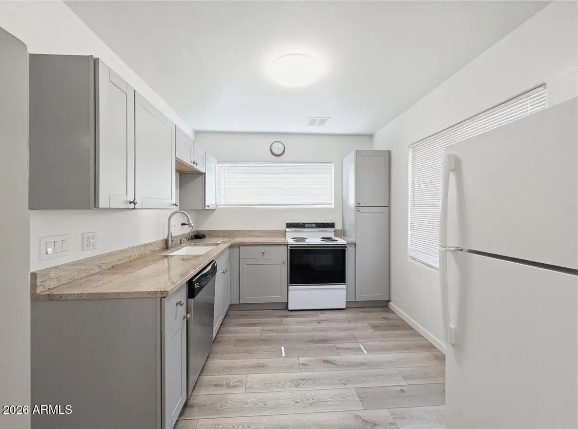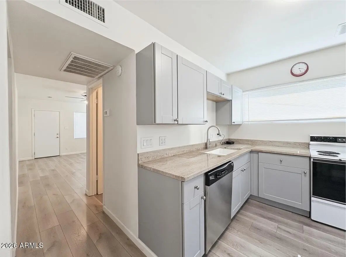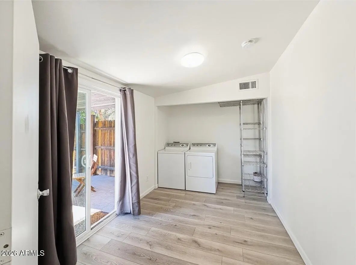 1bed 1 bath with HUGE private backyard and HUGE laundry room! This home's interior features wood-like laminate vinyl flooring, two-tone paint, and ceiling fans. The kitchen comes complete with a range oven, refrigerator dishwasher, and plenty of cabinet space! The bedroom includes a standalone closet and easy access to the bathroom which includes a shower/tub combo. QUIET, open entry, private off-street parking, and your own back yard. 10mins to downtown, end of the lane (no thru traffic!), Central location, Quiet neighborhood. Cozy and Private; we're right off the Camelback; Biltmore corridor for shopping, eating, etc.