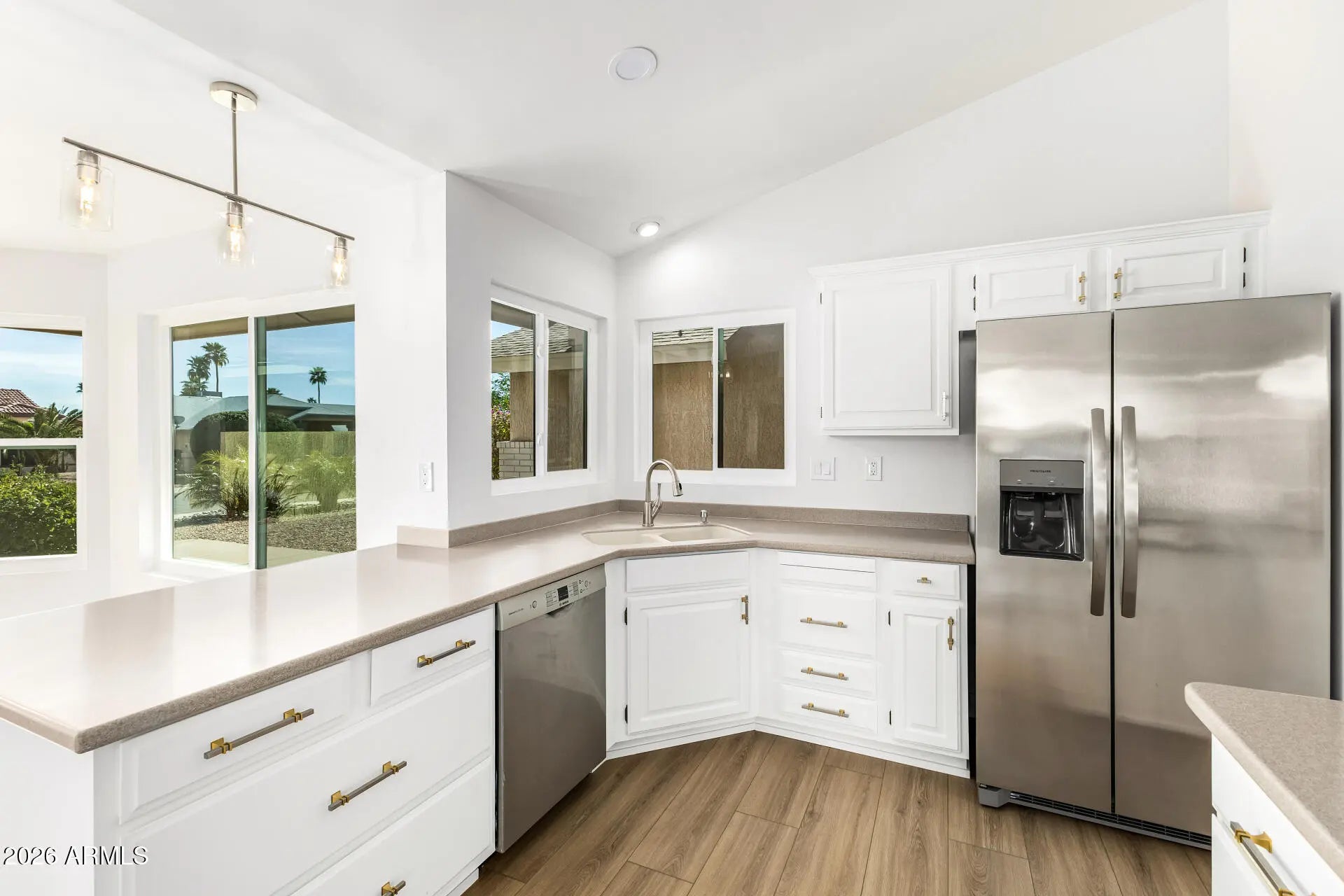 Seize the chance to own this beautifully upgraded 2-bedroom home in Sun City West! Major upgrades include a brand-new Carrier 4-ton rooftop AC, owned solar with warranty through 2032, The home features Simonton Daylight dual-pane windows and patio doors with Low-E 366 Cardinal glass, argon gas insulation, sound-reducing package, and a lifetime window warranty. All-electric home--no gas service.Enjoy a bright living room with vaulted ceilings, fresh paint, and LVP flooring. Updated kitchen with new Frigidaire refrigerator, hardware, and faucet.Electrical updates include new fans, fixtures, outlets, and switches. Both bathrooms include updated faucets, elongated toilets, and new recessed lighting in the primary bath..Relax on the covered patio with drop-down shades and citrus trees.