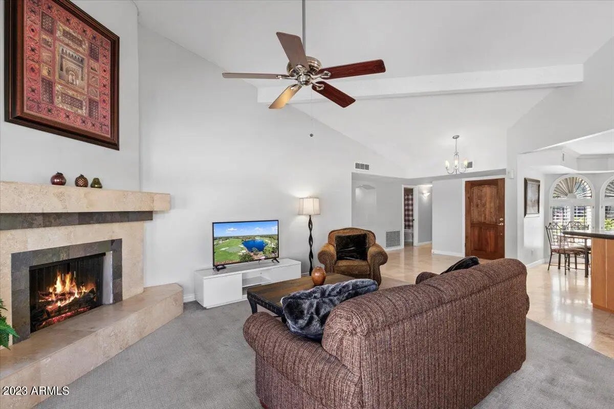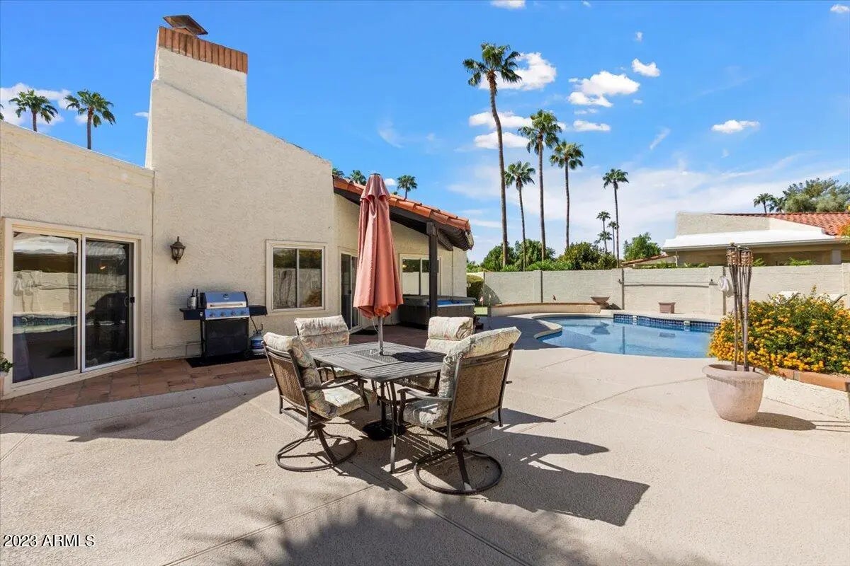 Single Level Patio Home in the prestigious El Paseo community of McCormick Ranch. This quiet desired community of 143 homes borders the Indian Bend Greenbelt with bike and hiking paths and views of Camelback Mountain and Lake Margarite. Conveniently located between Old Town and Kierland there are a plethora of restaurants and activates. Minutes from Honor Health Hospital and The Mayo Clinic ensures access to medical services. The open floor plan with cathedral and beamed callings, fireplace and an open kitchen gives it a spacious and airy feeling. Primary bedroom has large master bath, closet, and walkout patio. The backyard includes a custom pool, putting green and hot tub with covered patio. The property offers a desirable combination of tranquil and precious community.