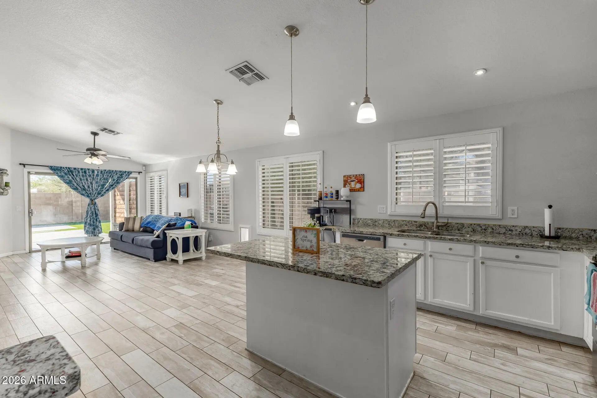 Stunning 4-bedroom, 2-bath home on a premium corner lot, beautifully updated inside & out. Fresh curb appeal welcomes you with low-maintenance artificial turf in both the front & backyard, creating a clean, vibrant look year-round. Step inside to soaring vaulted ceilings, stylish architectural details, and plank ceramic flooring that flows throughout the main living areas. The open-concept layout makes entertaining effortless. The kitchen overlooks the spacious family room and features granite countertops, stainless steel appliances, & an island with a breakfast bar. The primary suite offers its own vaulted ceilings and a spa-inspired bathroom with dual sinks, designer finishes, and a separate soaking tub. Sliding doors lead to a private backyard retreat complete with artificial turf and an upgraded brick paver patio -- perfect for relaxing or hosting gatherings. With easy-care landscaping and thoughtful updates, this home is truly move-in ready. Located just minutes from shopping, dining, and parks, this property blends comfort, convenience, and style.