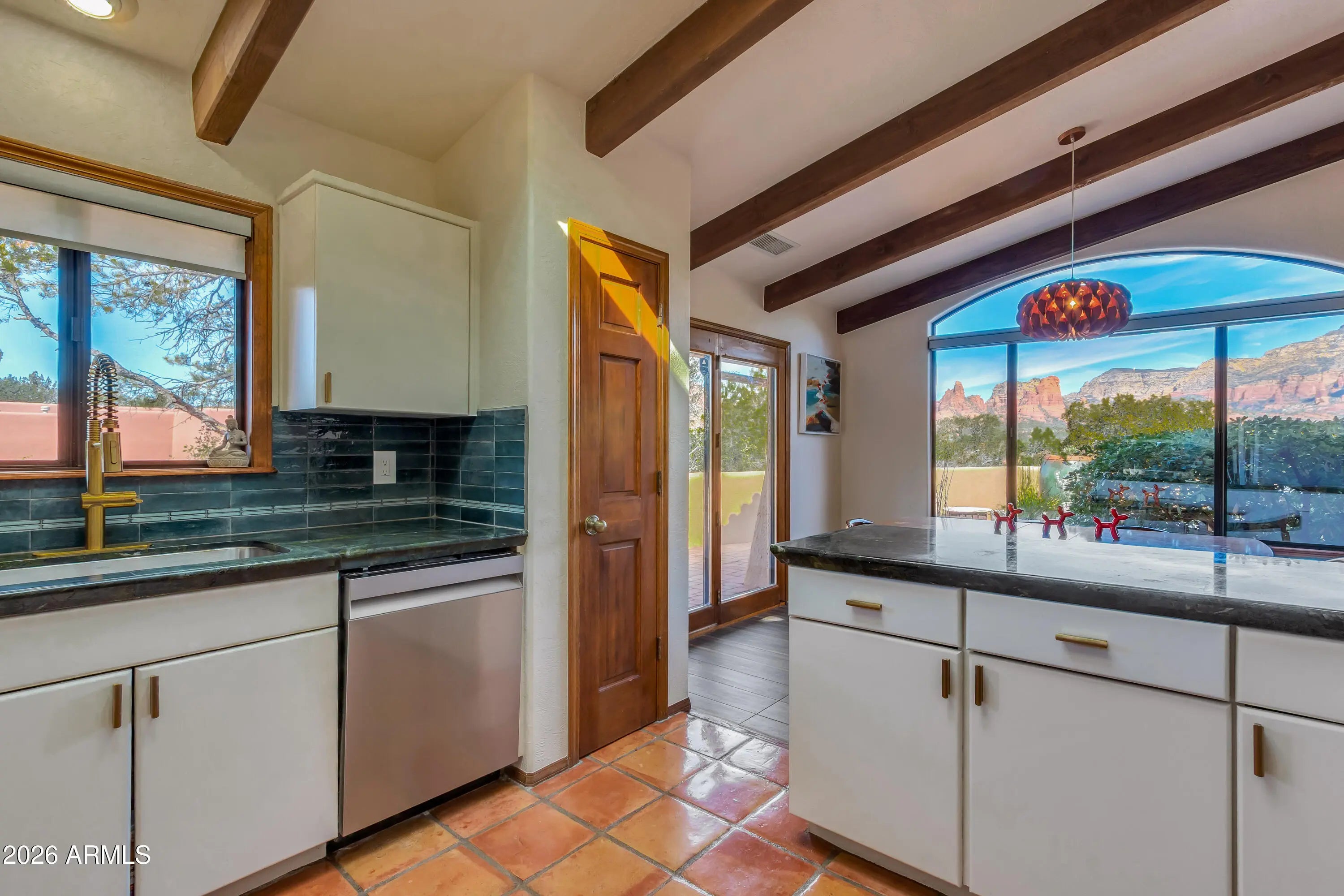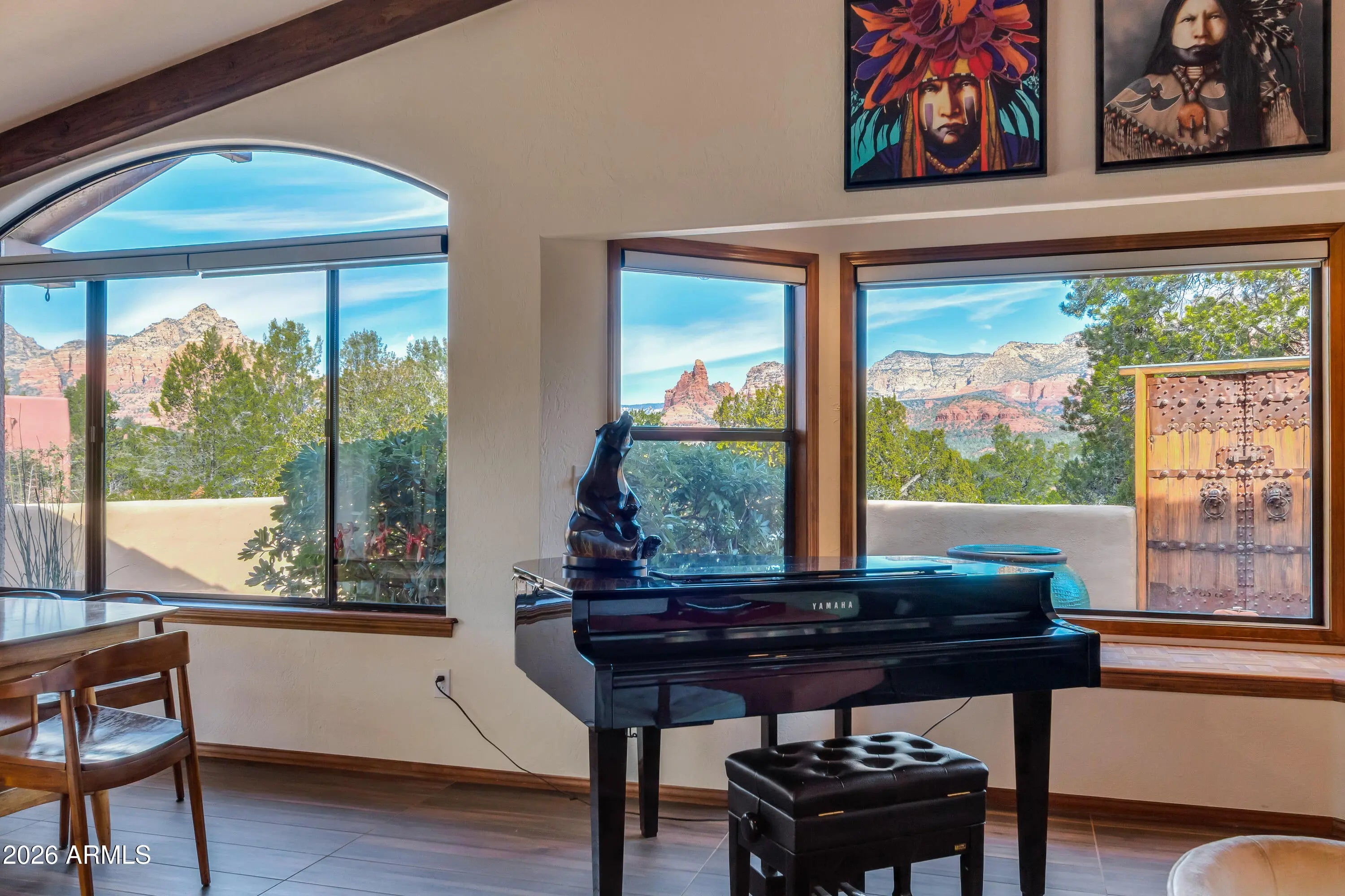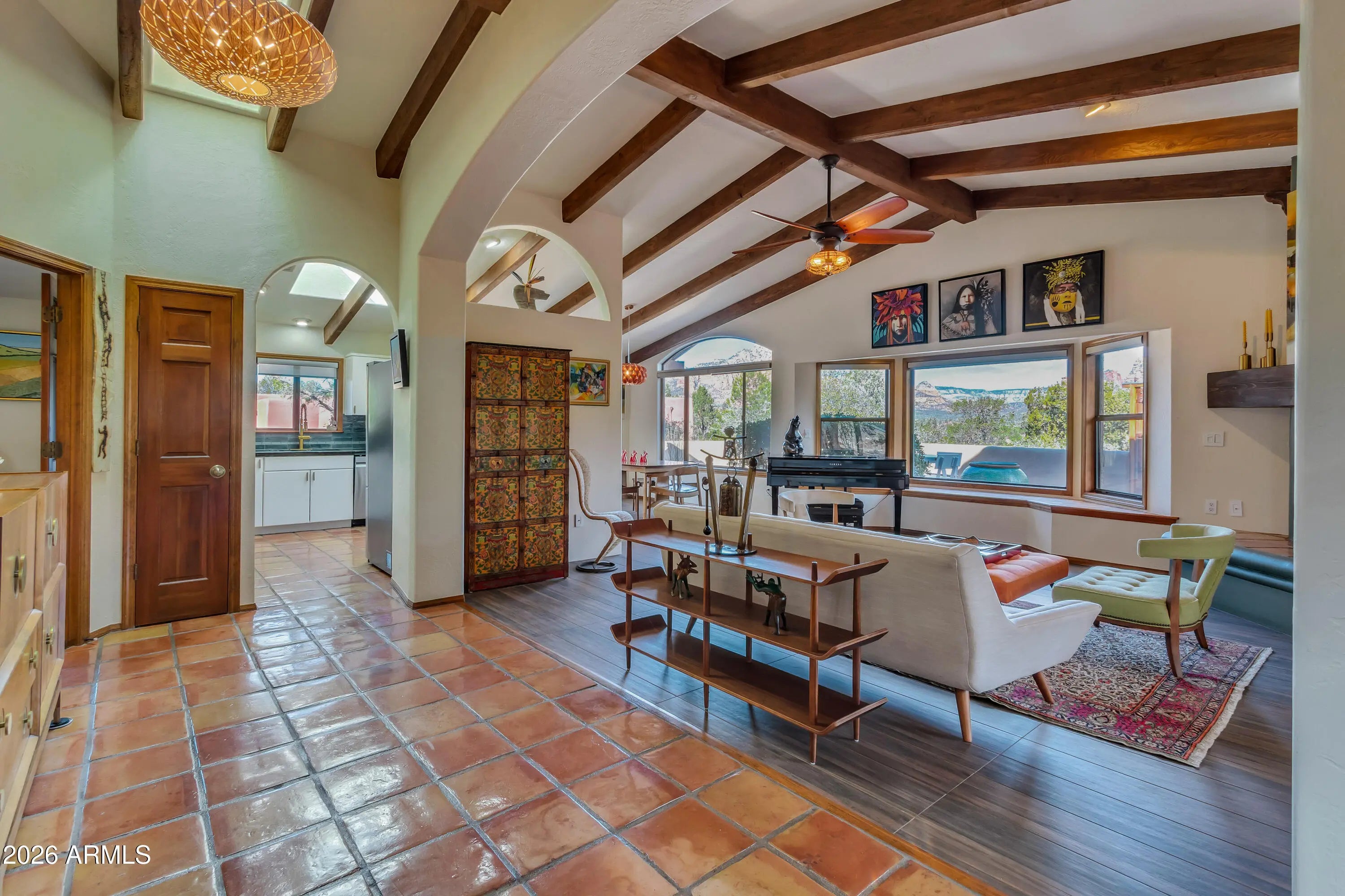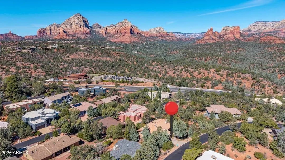Located in Sedona's coveted Rolling Hills Estates, 45 Kashmir Rd. offers a lifestyle defined by sweeping Red Rock views, privacy, and authentic Southwest character. From its elevated position among the rolling terrain for which the neighborhood is named, the home captures panoramic vistas of Sedona's iconic monolithic landscape--creating a daily backdrop that is both inspiring and serene. Arrival sets an immediate sense of welcome. A covered front portico invites peaceful mornings with coffee and relaxed evenings cooled by gentle desert breezes, while the home's distinctive entry--showcasing exotic wood doors crafted from thick planks and bound with hand-forged iron--reflects exceptional craftsmanship and enduring style. Inside, the residence opens with warmth and architectural character, highlighted by soaring ceilings with exposed wood beams and beautifully tiled floors that create a rich, timeless blend of Contemporary Southwest ambiance. Natural light streams through an abundance of wood-cased windows and skylights, each thoughtfully oriented to frame the remarkable red rock formations of West Sedona. Throughout the home, sunlight and scenery become part of the interior experience, creating a seamless connection between indoors and the surrounding landscape. The living and dining spaces are designed for effortless flow and enjoyment, opening naturally to a wrap-around terrace that extend the home's living areas outdoors. Whether entertaining guests beneath Sedona's dramatic sunsets or enjoying a quiet evening under the stars, the indoor/outdoor design allows for year-round enjoyment of Northern Arizona's exceptional climate. Every outdoor space offers a unique vantage point and sense of privacy, making the home equally suited for lively gatherings or peaceful retreat. The primary suite provides a tranquil haven, complete with a cathedral ceiling, generous natural light, and a spacious bath designed for comfort and relaxation. Guest accommodations are equally welcoming, ensuring that family and visitors can enjoy the same sense of calm and connection to the surrounding landscape. Careful stewardship over the years has preserved the home's character while enhancing comfort and efficiency, resulting in a residence that feels both refined and move-in ready. The setting itself elevates the experience: mature plantings, refreshed landscaping and carefully maintained grounds complement the architecture and frame the surrounding views. This spectacular home has been loving cared for and meticulously maintained. Living in Rolling Hills offers the best of Sedona--privacy, scenic beauty, and a sense of established community--while remaining close to the area's renowned hiking trails, dining, and cultural amenities. From sunrise illuminating the red rocks to twilight settling over the hills, 45 Kashmir Rd. offers a lifestyle rooted in beauty, tranquility, and timeless Sedona design. This is more than a home--it is a vantage point from which to experience Sedona at its most captivating.