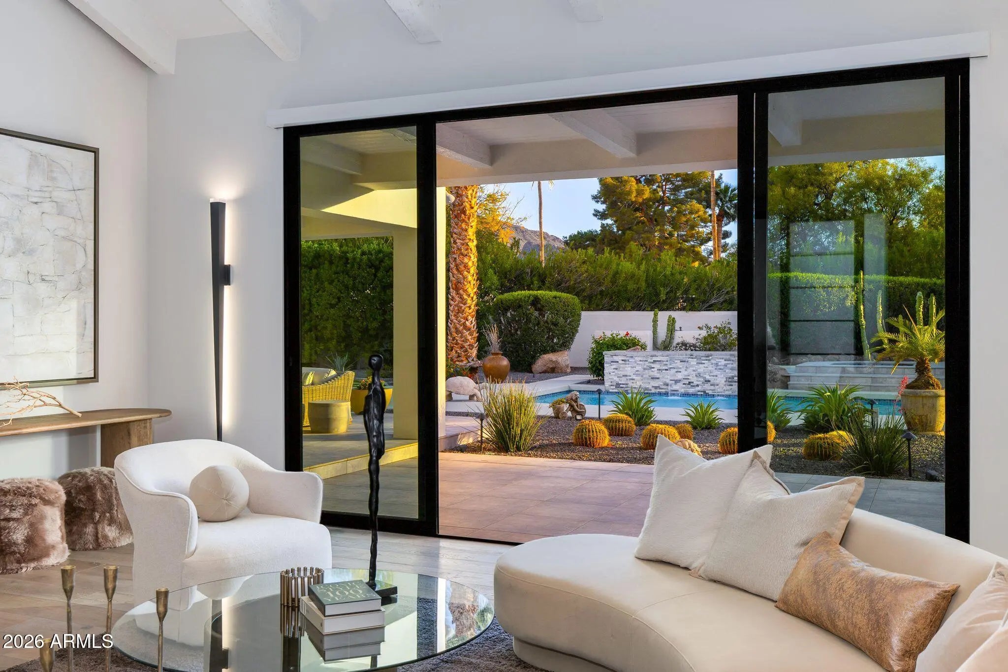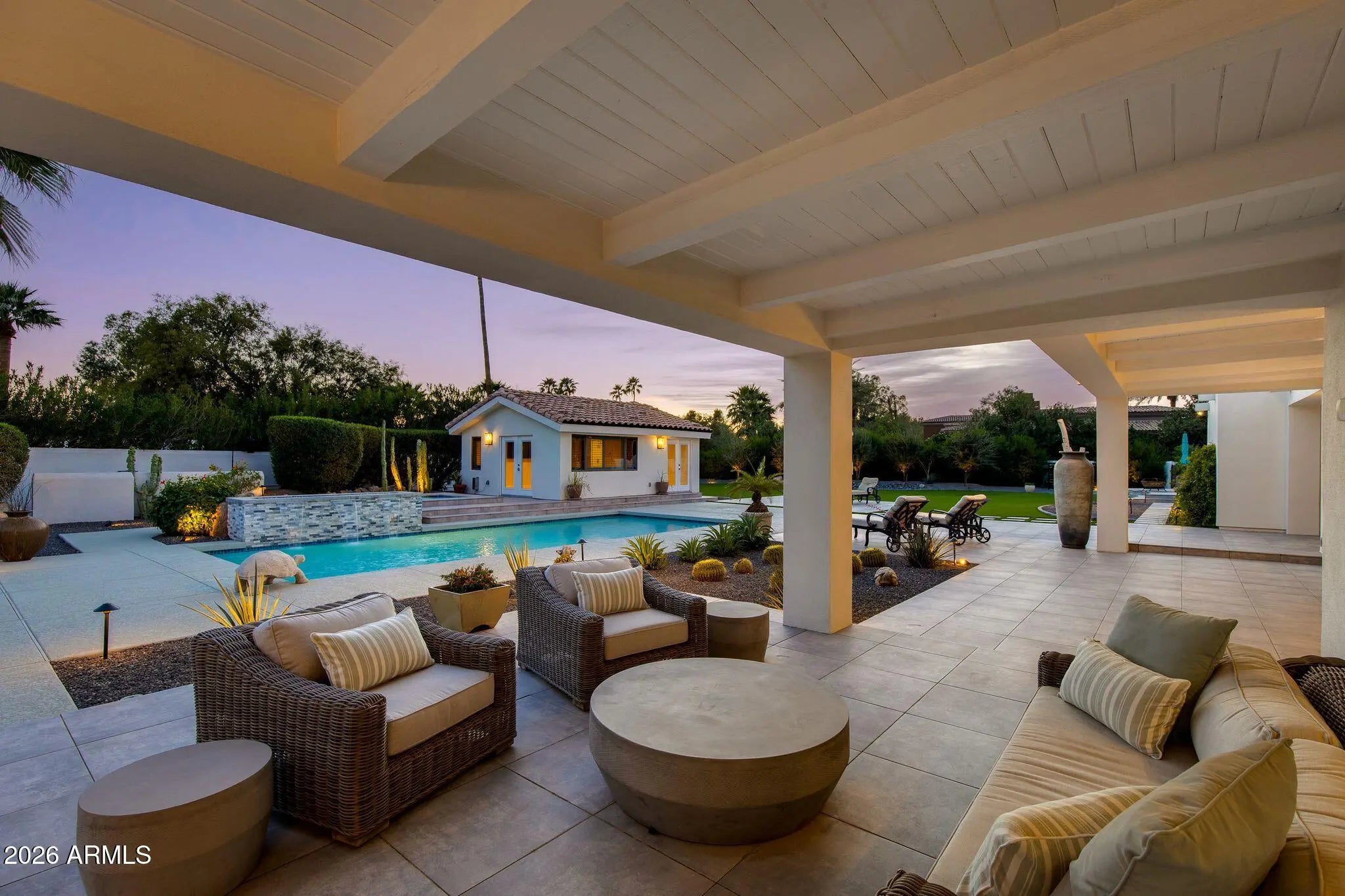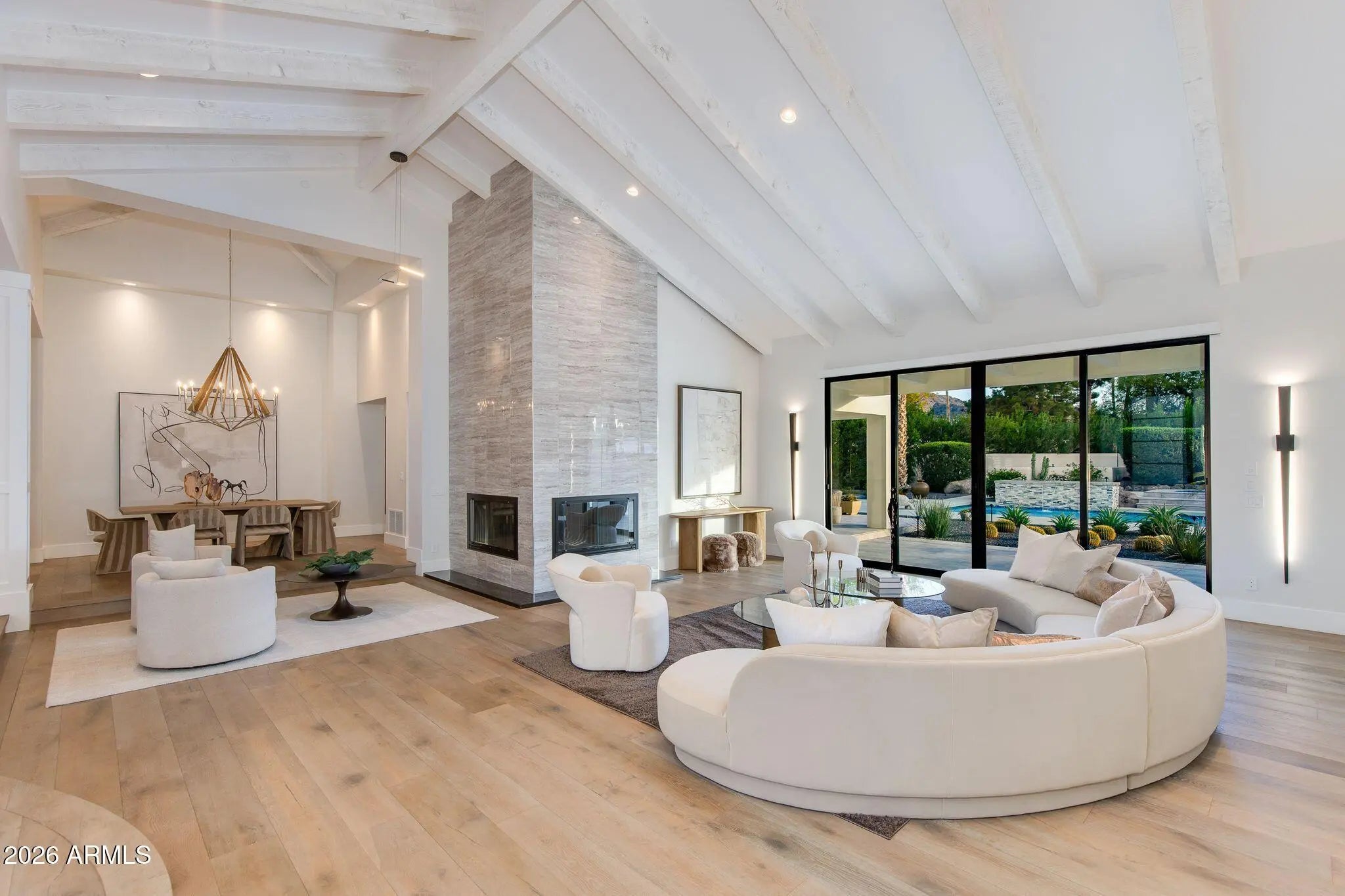 Located on a quiet and charming street, this move-in-ready residence blends exceptional quality and thoughtful design with Arizona's signature indoor-outdoor lifestyle. Originally reimagined in a comprehensive 2018 remodel, the home has been further elevated with quality upgrades, reflecting a meticulous attention to detail throughout. Just beyond the entry, a grand living room with soaring ceilings and a dramatic double-sided fireplace opens seamlessly to the outdoors, creating the perfect setting for both intimate evenings and entertaining. The beautifully appointed kitchen features quality custom cabinetry and a center island with seating, serving as both a functional workspace and natural gathering point. The primary wing offers a bedroom or flex space in addition to the luxurious primary suite. The primary bathroom is a timeless sanctuary featuring marble countertops, a freestanding tub, and two oversized walk-in closets. In the secondary wing, two well-appointed bedrooms and a beautifully designed powder room provide comfort for family or guests. Beyond the main house, a versatile detached casita with its own bathroom provides the ideal footprint for a private guest retreat, executive home office, fitness studio or creative space. The lush backyard is a destination in itself, centered around an oversized pool and spa complemented by an accent fireplace. Whether you are enjoying a quite evening or hosting a sunset soirée, this home offers a desired lifestyle curated for comfort and effortless desert living.