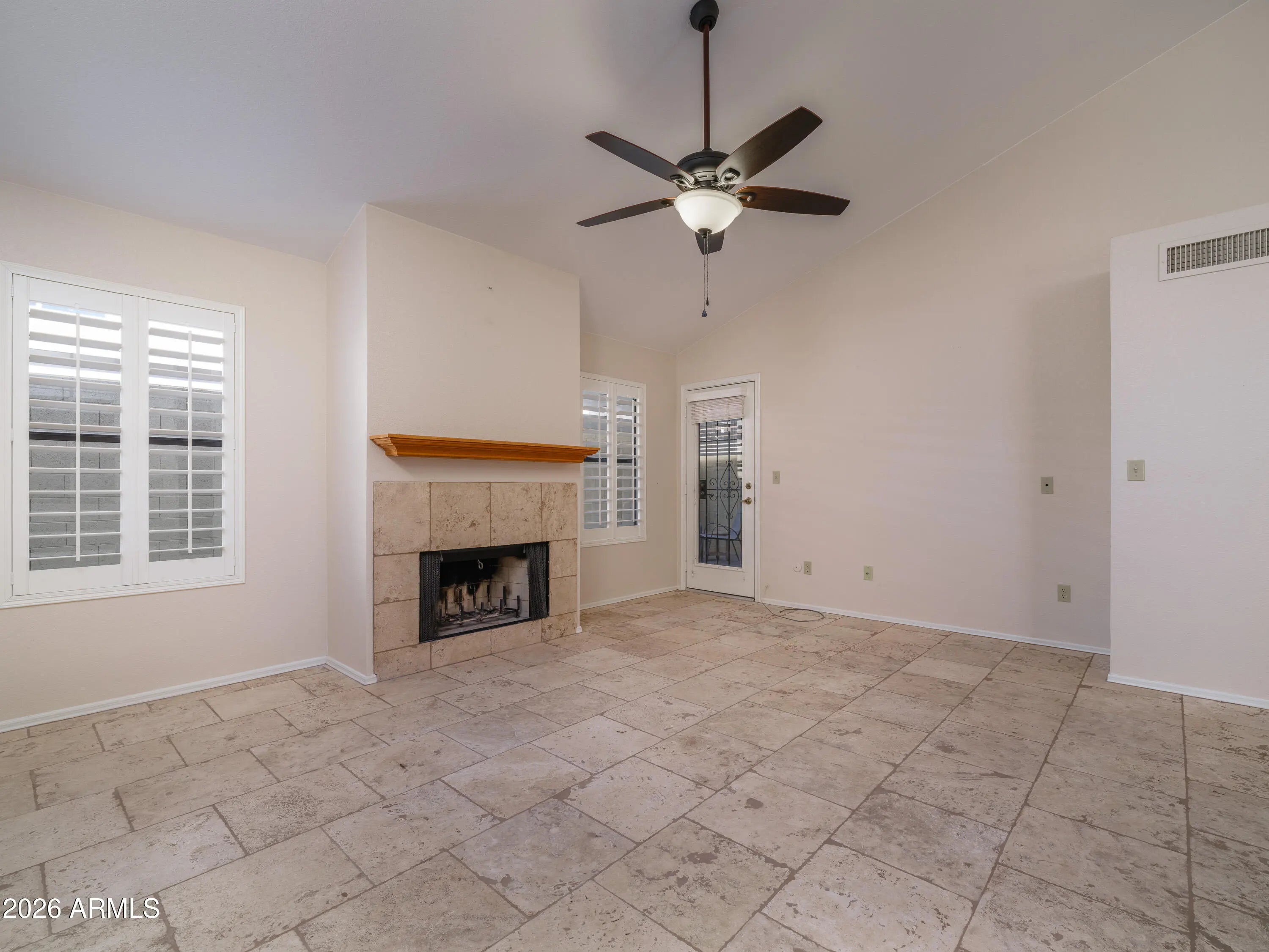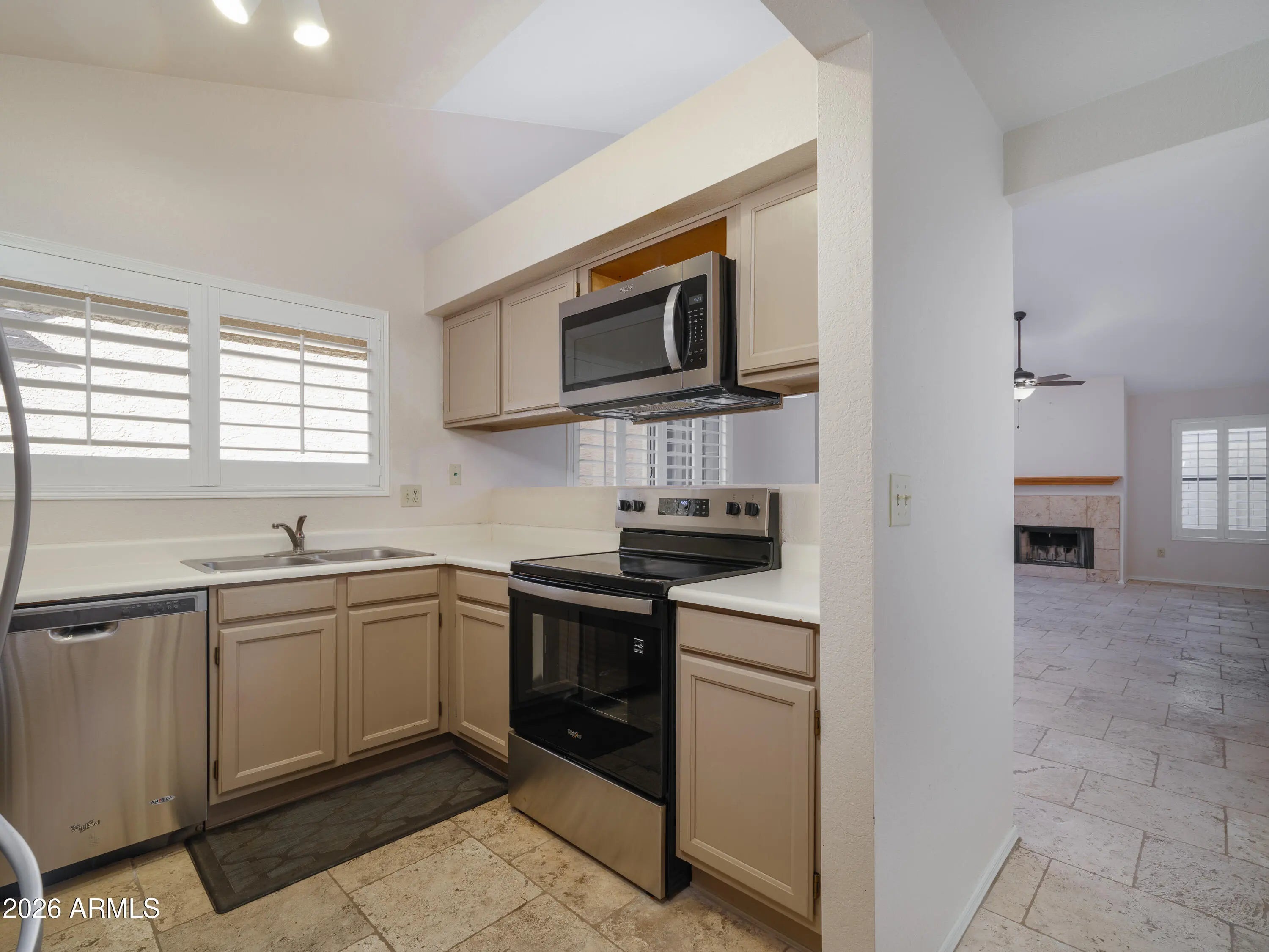 Own this lock and leave or year-round patio home in the beautiful Stapley Greens neighborhood! This 2BD/2BA home features custom travertine stone flooring, a fireplace, vaulted ceilings with a new finish, plantation shutters, updated backyard with new turf and pergola and a two-car garage. Beautiful natural light pours in through the clerestory north-facing windows in the living room and dining area. A stainless-steel fridge and brand-new stove are included. Nestled in a well-kept neighborhood, you're just minutes from the 202 freeway and the heart of Mesa. Community pool, heated spa, and meticulous front yard landscaping provided by the HOA. Whether you're looking for a winter retreat or a low-maintenance year-round home, this charming patio home checks all the boxes!
