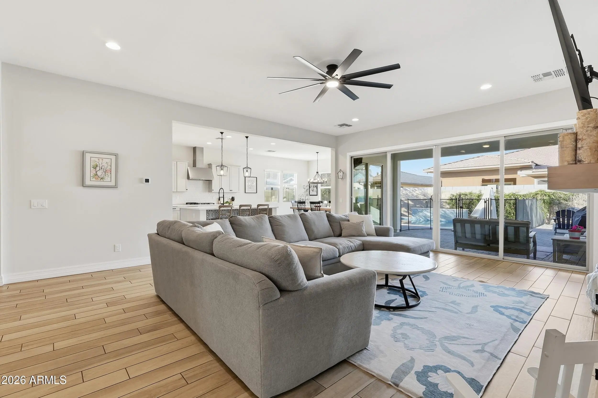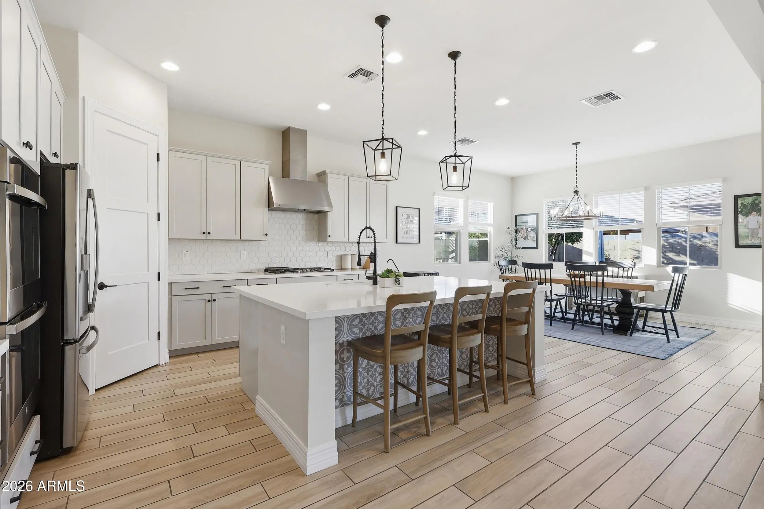 Built in 2020 and located in the Highly Desirable Lakeview Trails at Morrison Ranch, this beautifully upgraded Modern Farmhouse offers 4 Bedrooms, 3 Full baths, an enclosed Den, a Game Room and Soaring 10-foot Ceilings. Thoughtful upgrades include 90-degree Drywall Corners, Upgraded Interior Doors, Wood like Tile flooring throughout, Recessed Lighting in every room, Shaker Cabinetry, Quartz Kitchen Countertops, Designer Backsplash, Upgraded Gas Cooktop, Double Ovens, Matte Black Fixtures, Square Sinks, and Raised Vanities in secondary baths. The Enclosed Dining Room with French Doors makes an ideal home office. The Open-Concept Great Room features an Electric Fireplace with Pop-Out Accent Wall and a Dramatic Double Glass Slider, leading to a Resort-Style Backyard complete with a Pool, Pavers, Turf, Gas Fire Pit, Gas BBQ Line, Citrus Trees, Dog Run, and Double Gate side yard access. Additional highlights include shutters/blinds throughout, fans in all bedrooms and game room, cabinetry in the playroom and laundry (plumbed for sink), soft water, reverse osmosis, instant hot water, and Tesla Charging Plug. Living in Morrison Ranch means more than just a beautiful home. Residents enjoy tree-lined streets, multiple parks and lakes, sand volleyball, tennis and pickleball courts--all designed to create a true neighborhood feel.