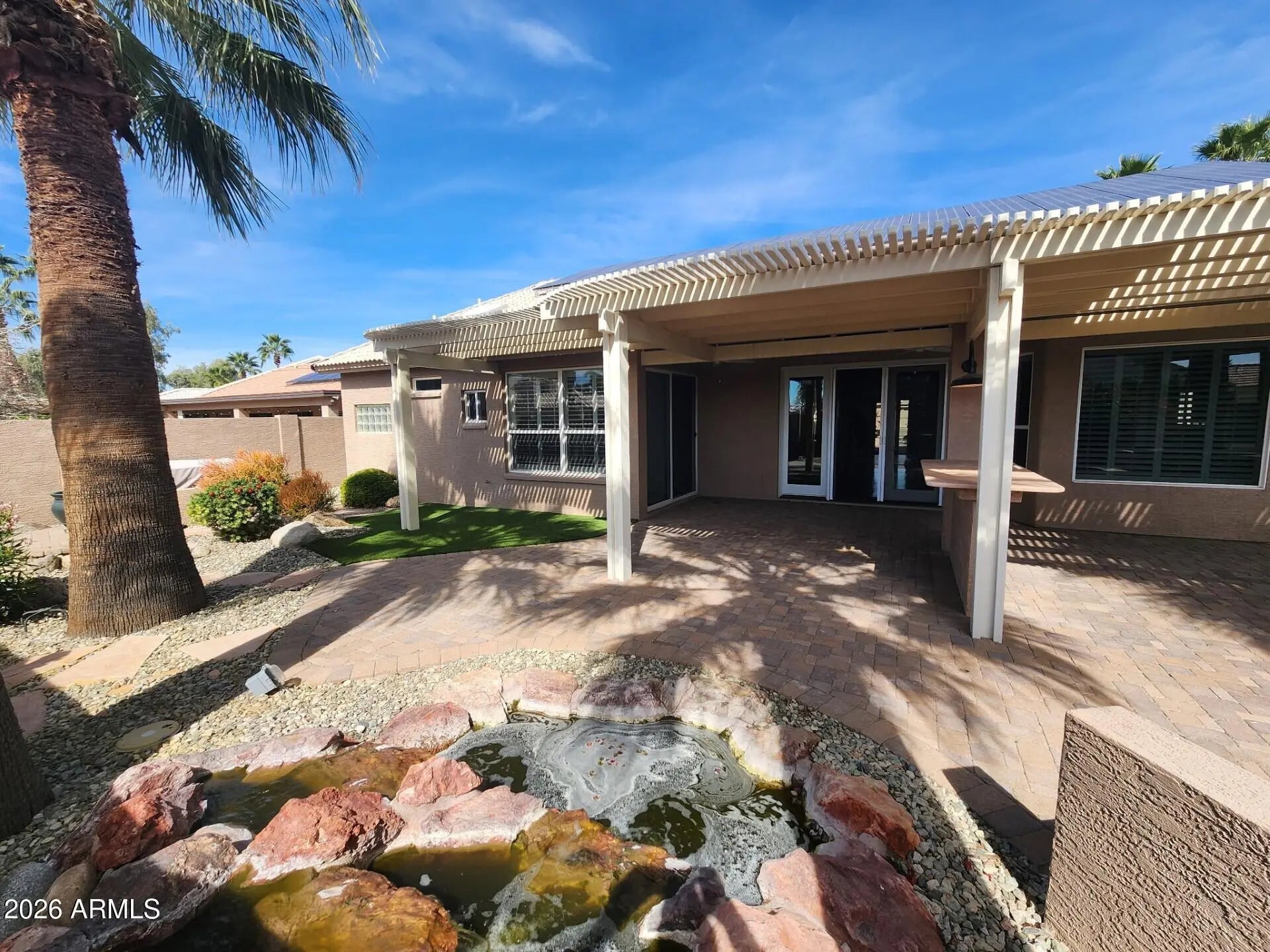 Custom home in the 55+ Cambria at Pebble Creek luxury resort community. This upgraded 3-bed, 3-bath home with den/office welcomes you with a gated front courtyard and elegant marble-floor entry. Inside, refined stone accents, abundant natural light, and a sunken wet bar create an inviting atmosphere. The remodeled kitchen features a spacious island, granite counters, and generous cabinetry--ideal for entertaining. Enjoy a true resort-style backyard with an outdoor gas fireplace, built-in seating, private spa, and a beautiful stone water feature. Landlord covers electricity, landscaping, pest control, and spa/water-feature servicing, offering exceptional value and convenience. Experience vibrant social and recreational amenities in this premier active-adult community. Your dream home