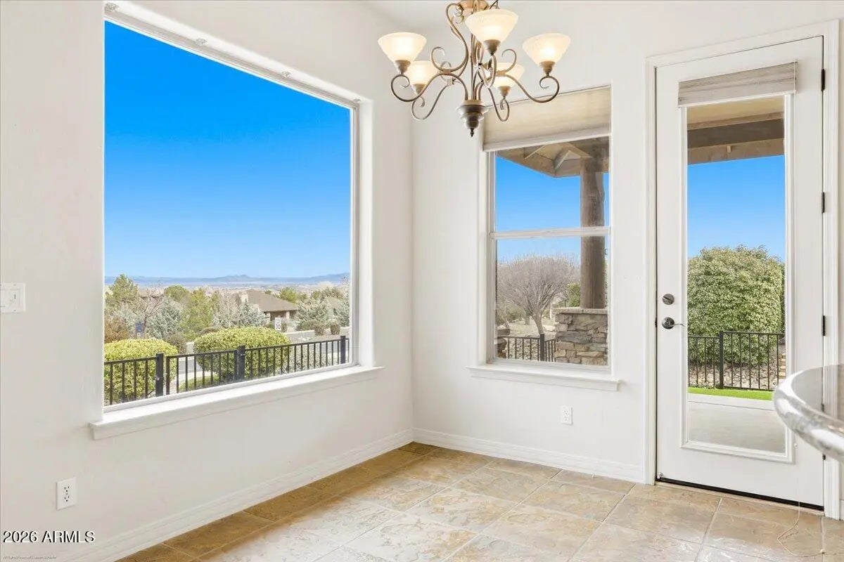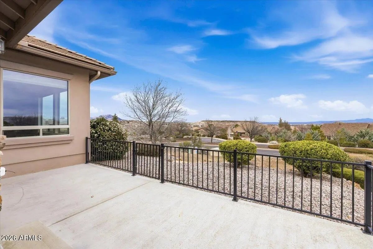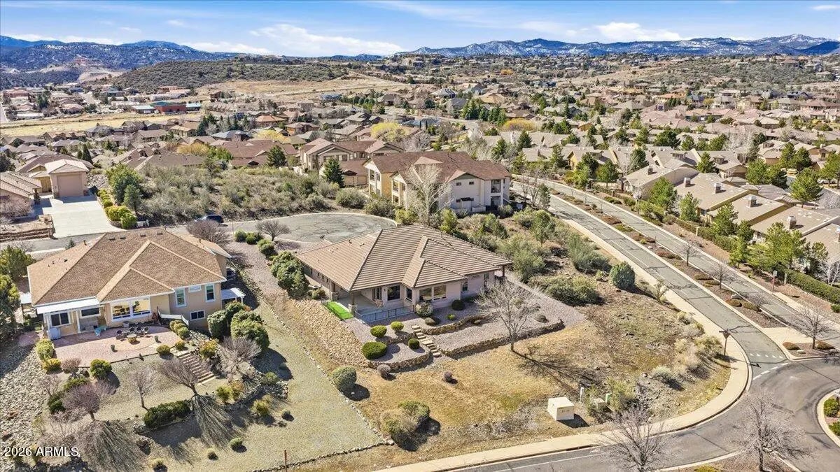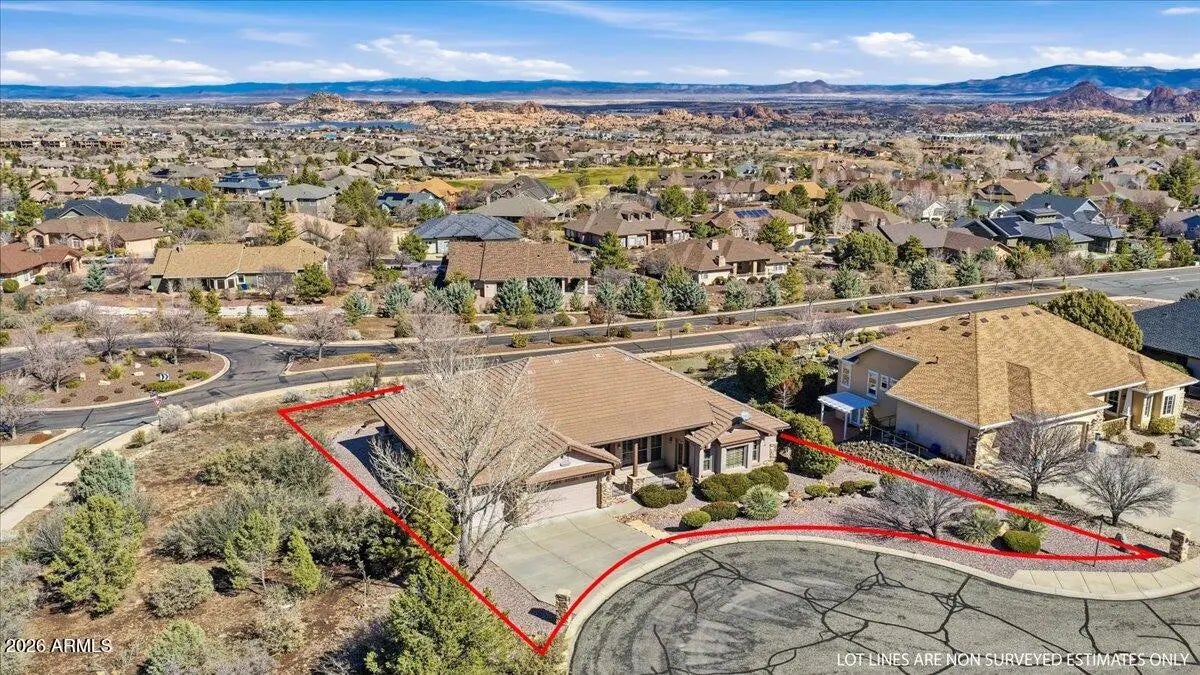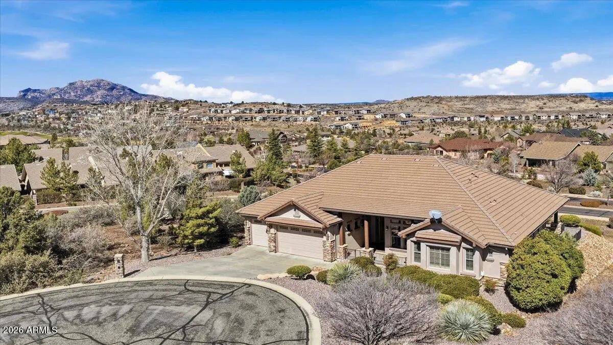 Luxury living meets unmatched views in this rare Carrington-built gem. Perfectly situated on a premier almost half-acre cul-de-sac lot, this single-level residence offers the ideal blend of privacy and grandeur. Boasting soaring 10-foot ceilings, an all-tile roof, and breathtaking, expansive vistas, this home provides the freedom of no HOA alongside the convenience of all city services. Just inside the entry, a sophisticated dedicated office offers the perfect space for work or reflection. The heart of the home features a formal dining room accented by rustic lodgepole separators, which flows seamlessly into a magnificent great room. Here, a cozy corner fireplace and large windows perfectly frame the stunning outdoor scenery, creating an inviting atmosphere for relaxation or entertaining. The kitchen is a chef's dream designed for gathering. Featuring granite countertops, an abundance of upgraded cabinetry, a wine refrigerator and bar area, gas stove, Jenn-Air grill, it truly has it all. Designed with the ultimate split floor plan for maximum seclusion, the primary wing is a true sanctuary boasting two walk-in closets, a private covered patio, and a spa-like bathroom with dual split sinks, a dedicated vanity area, a deep soaking tub, and a walk-in shower. Entirely separate from the primary suite, the secondary bedrooms offer exceptional privacy, each functioning as a junior suite with its own en-suite bathroom and walk-in closets, one having separate entrance. The 3-car garage, which is equipped with oversized 8-foot doors to easily accommodate larger vehicles, has cabinets, a sink, and plenty of light from the well placed windows. Surrounded by easy-care landscaping, the expansive lot provides multiple covered outdoor spaces, serving as a peaceful vantage point to enjoy legendary Prescott sunsets and stunning, expansive views of the Granite Mountain and San Francisco Peaks. This move-in ready home is a rare find in one of the most desirable locations in Prescott. A short drive to downtown historic Prescott courthouse, countless restaurants, boutique shopping, and hiking trails. A voluntary social membership to the Prescott Lakes Clubhouse, which includes the restaurant and social events is available with a monthly fee. Separately, Prescott Lakes private golf membership is available, and the club membership, which includes fitness/exercise Cnt, pool, spa/hot tub, tennis, and pickleball, may be added to the golf membership. This home definitely checks all the boxes! Come take a look!
