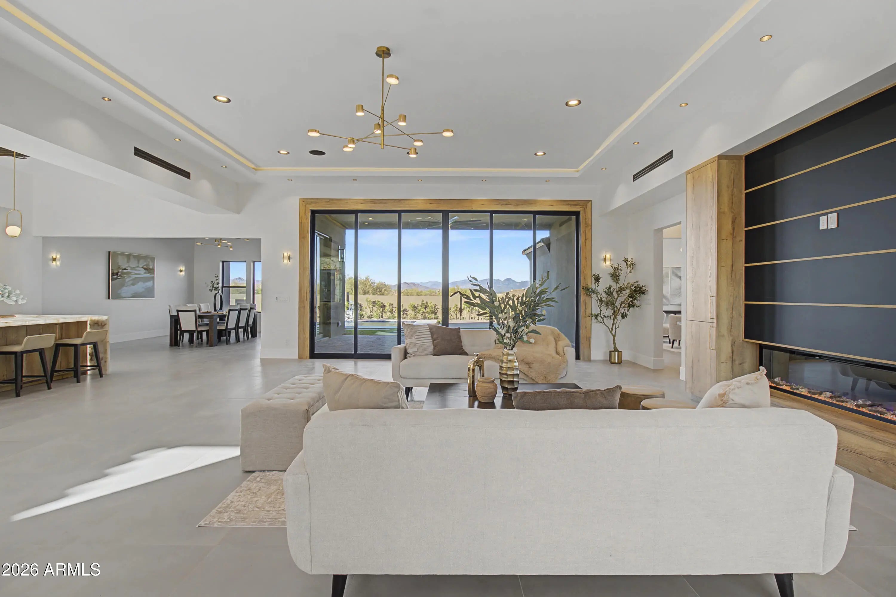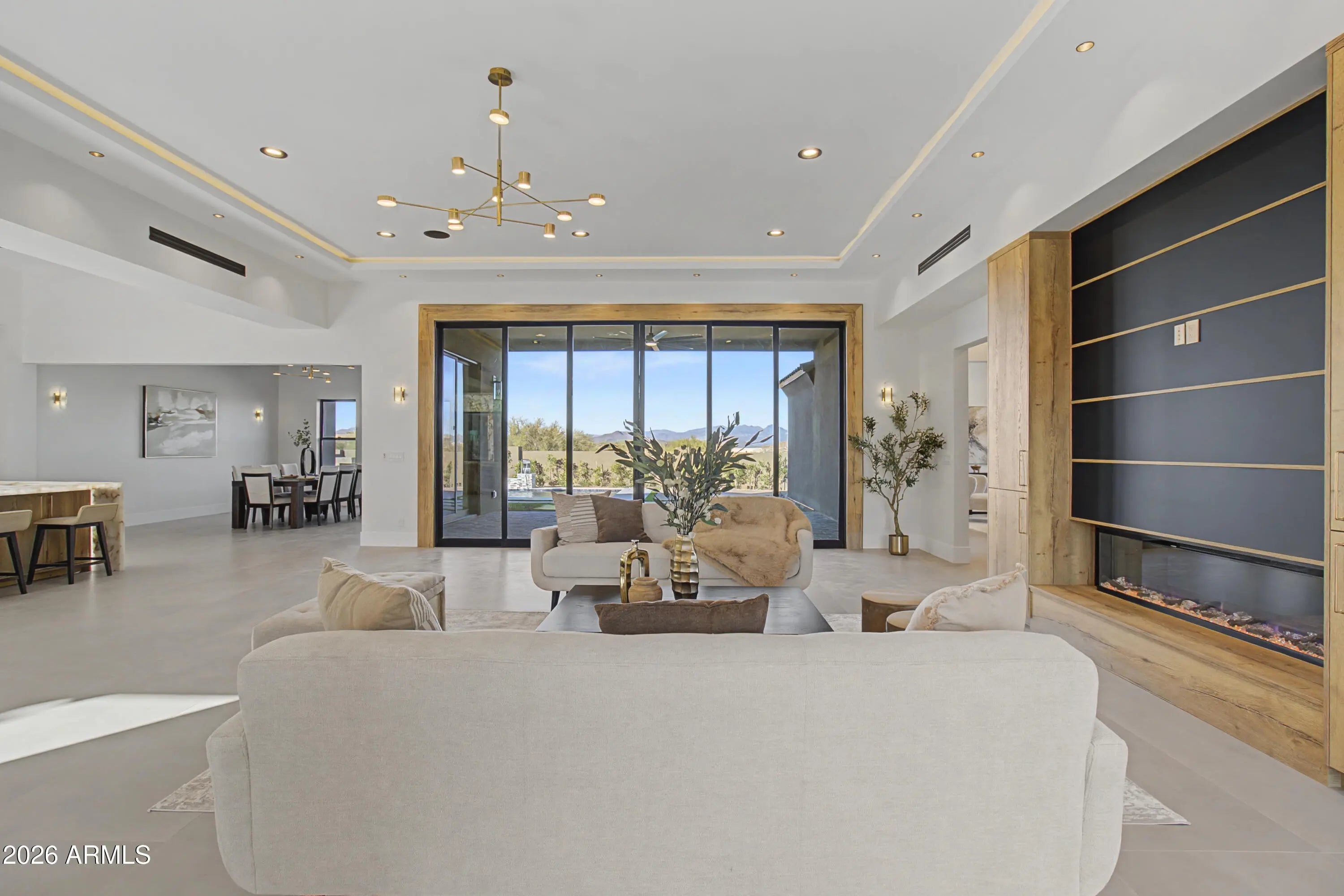 Brand new custom estate on 1.16 acres in a gated community. This stunning single level 5 bed, 4.5 bath home delivers 4,774 SF with cathedral ceilings, exposed beams, and multi slide glass doors framing panoramic mountain views. The kitchen showcases a cultured marble waterfall island, wood cabinetry, and professional grade appliances open to the great room with modern linear fireplace. Entertain in the formal dining or game room. Primary suite with hardwood floors, floor to ceiling windows, spa bath with his and hers toilets, and custom walk in closet. Two ensuite bedrooms plus Jack and Jill bath for guests. Resort backyard with sparkling pool, water features, and finished landscaping beneath a covered patio. Whole home smart technology with bluetooth speakers, 3 car garage, and RV gate.