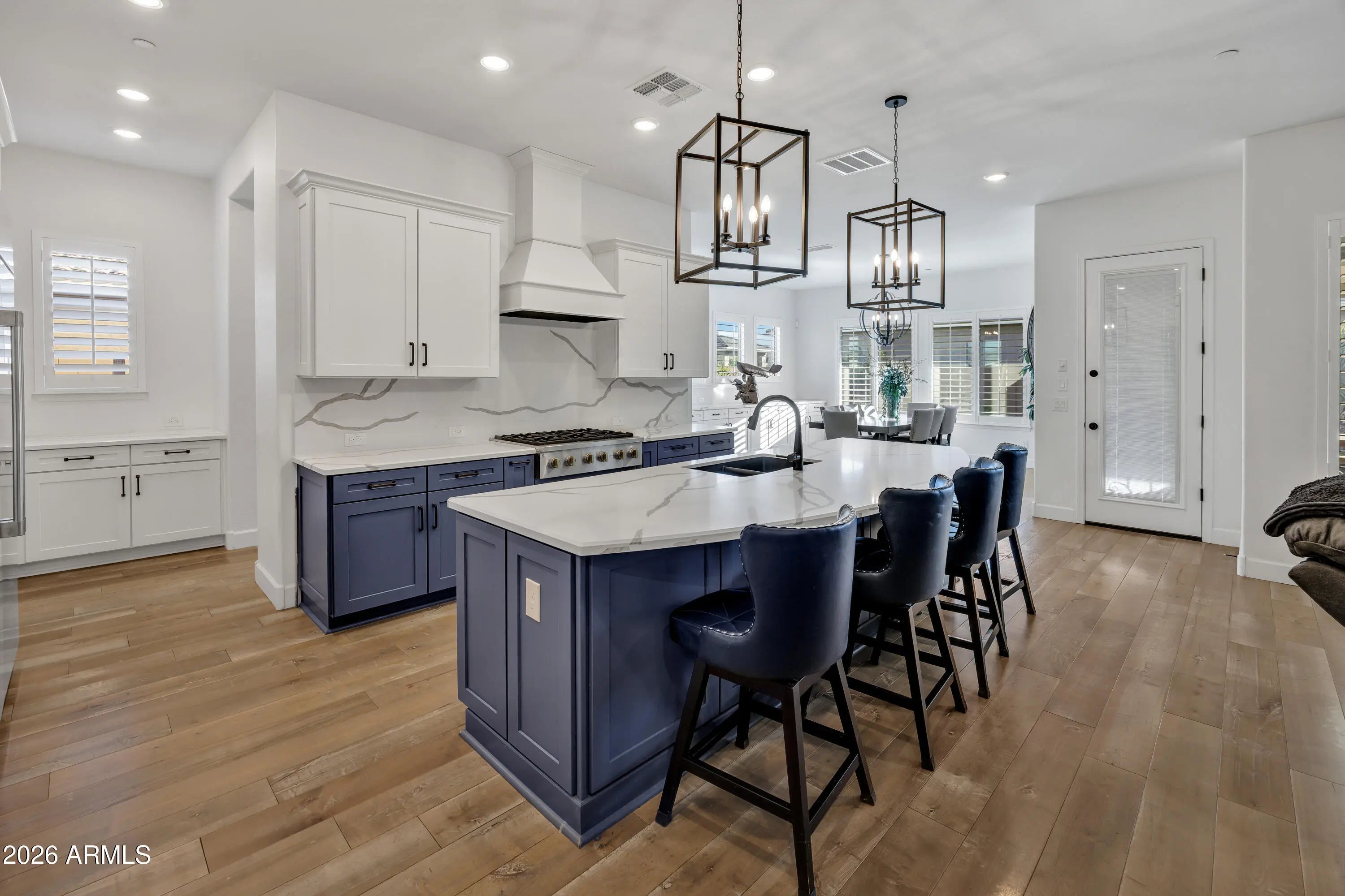 Welcome to this spacious home on a premium 16,436 sq ft corner lot in the amazing community of Eastmark. Featuring 4 bedrooms, plus an office with built-ins, teen room/second living area, and rare 4-car garage. Stunning chef's kitchen showcases quartz countertops, real wood soft-close cabinetry, gas cooktop, custom hood, full backsplash, and big island. Upgrades throughout include real wood flooring, plantation shutters, iron front door, tankless water heater, water softener, surround sound (great room & patio), alarm system, epoxy garage floors with cabinets, and two security entry doors. Enjoy outdoor living under an extended covered patio, shed with pavers underneath, and raised garden boxes with irrigation. No detail spared in builder upgrades with some warranty's still in place.