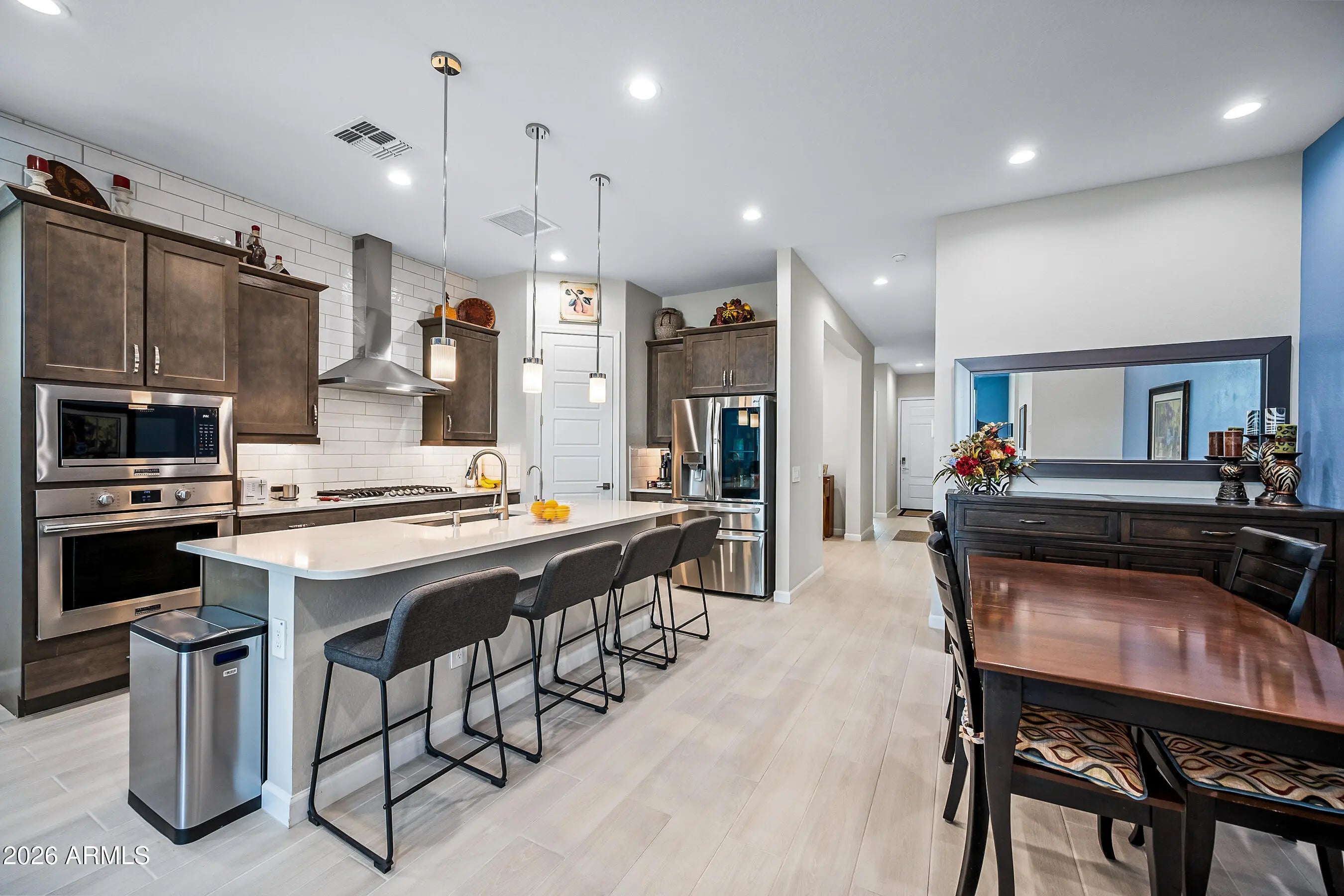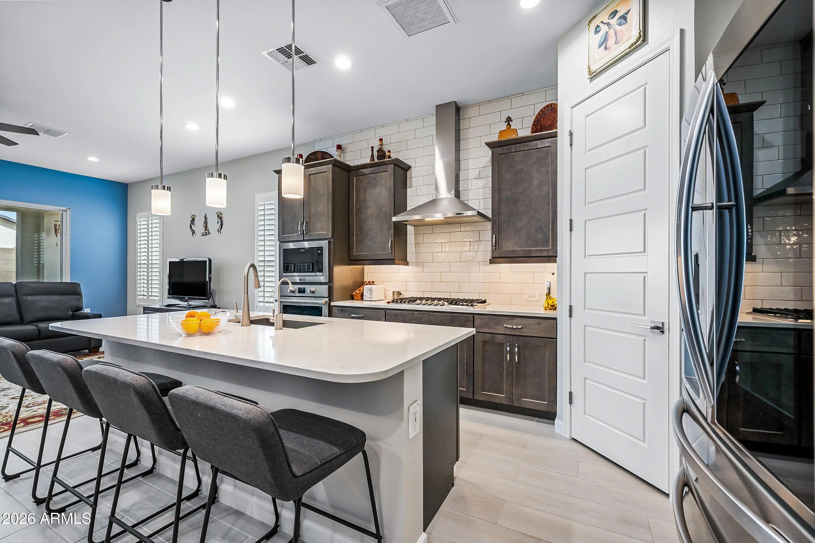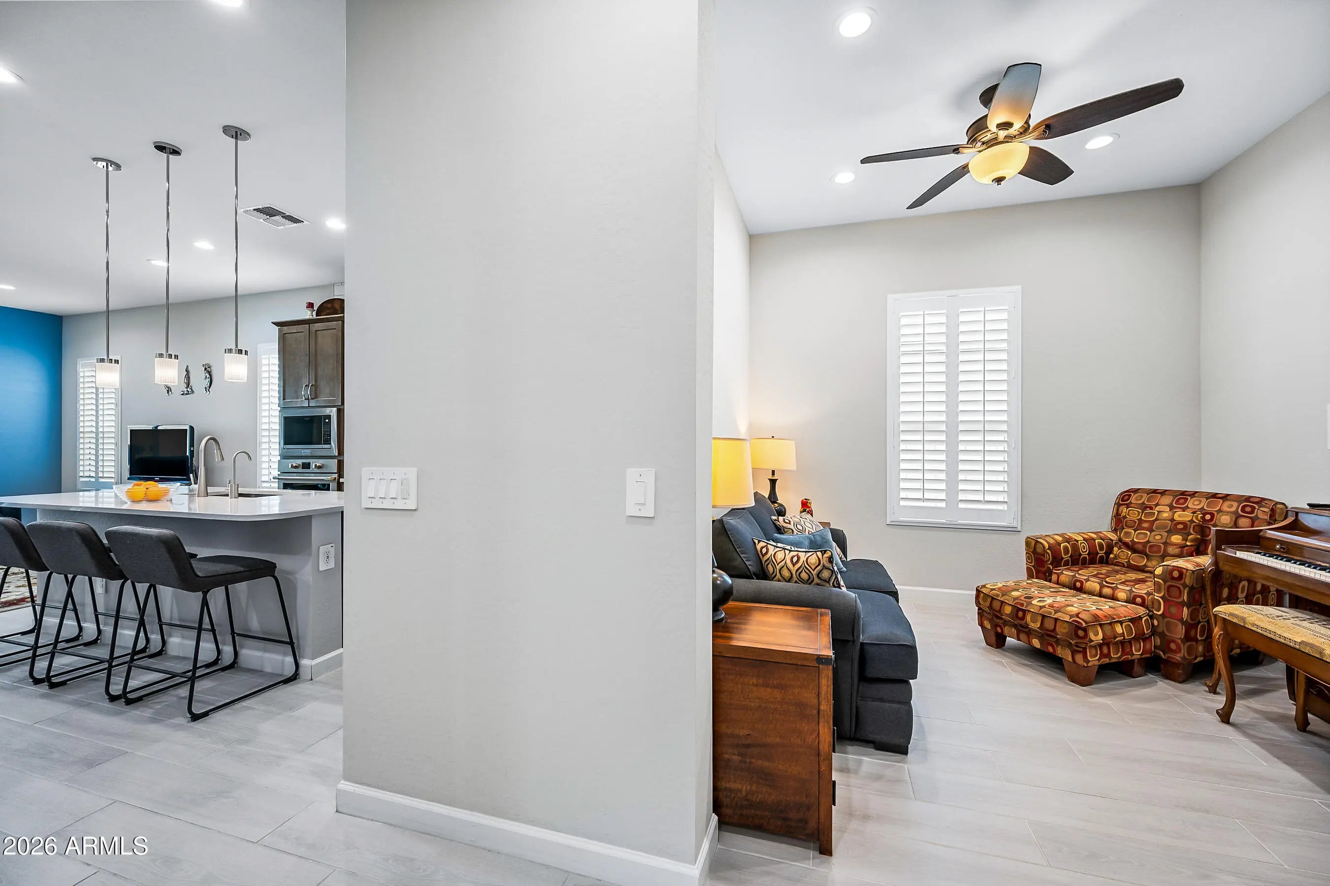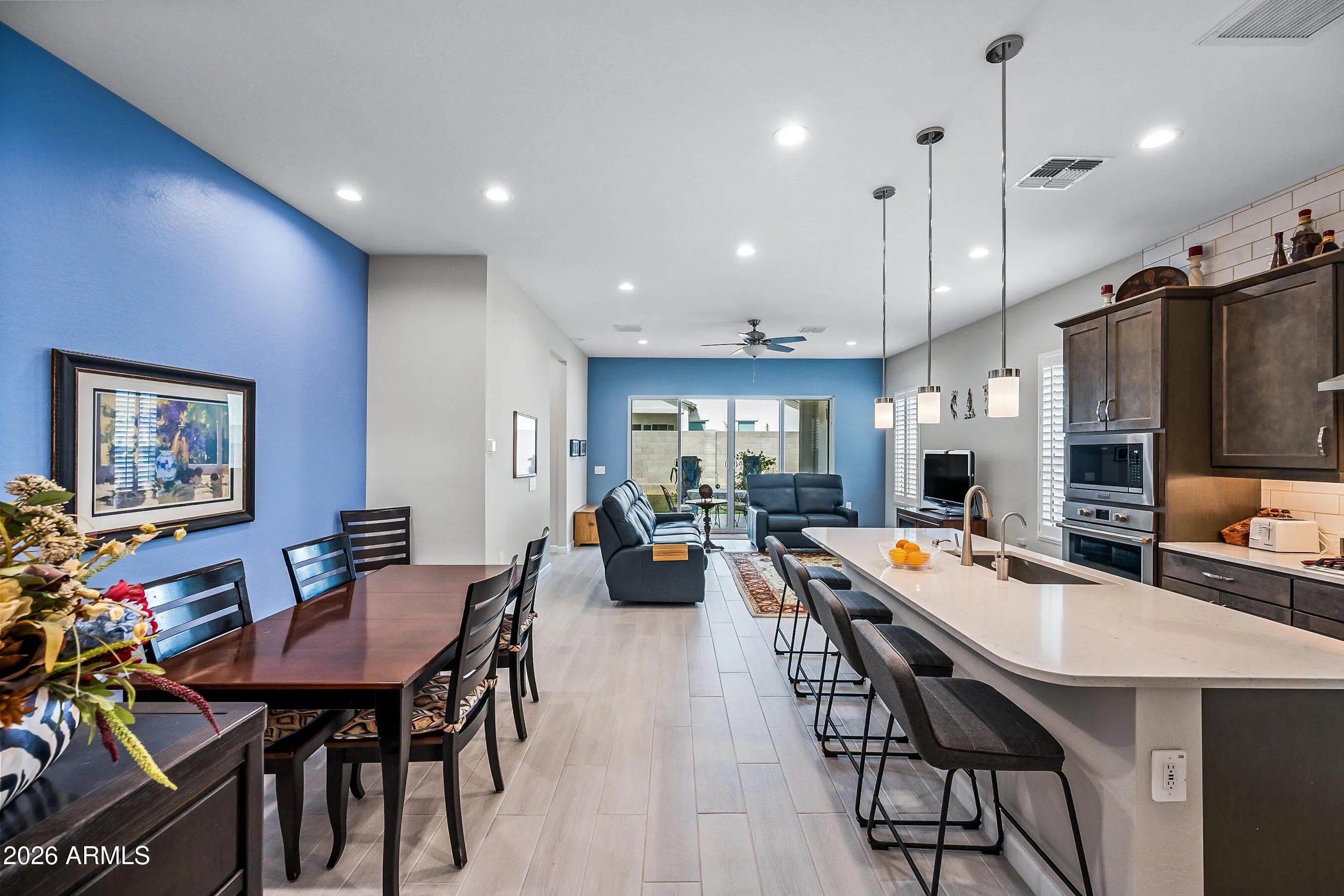 Welcome to this modern Dr Horton home for sale in the desirable Camino a Lago community in Peoria offering 4 bedrooms, 3 bathrooms, and 2,120 square feet of thoughtfully designed living space. Ideally located across from a neighborhood desert garden, this home combines privacy, views, and low-maintenance living. This single-story Peoria house features all tile flooring, ceiling fans throughout, and a spacious open-concept great room, perfect for entertaining or everyday comfort. The gourmet kitchen includes quartz countertops, a cooktop stove, wall oven, and a sleek stainless steel range hood--all seamlessly blending style and function for the home chef. Washer/Dryer and Upgraded refrigerator included. Enjoy true Arizona indoor-outdoor living with a stunning 4-panel sliding glass door that opens to a covered patio perfect for relaxing or dining outdoors. Additional upgrades include attractive shutters, a garage with a sealed epoxy floor, and a clean, modern design throughout. The primary shower is luxurious and spacious with a bench. Also, something to note is the stone elevation. Located near shopping, dining, and outdoor recreation, this move-in ready Peoria AZ home offers style, functionality, and a prime location. Don't miss this opportunity to own a modern home in Camino a Lago.