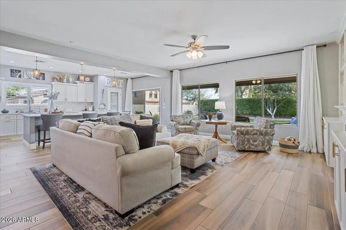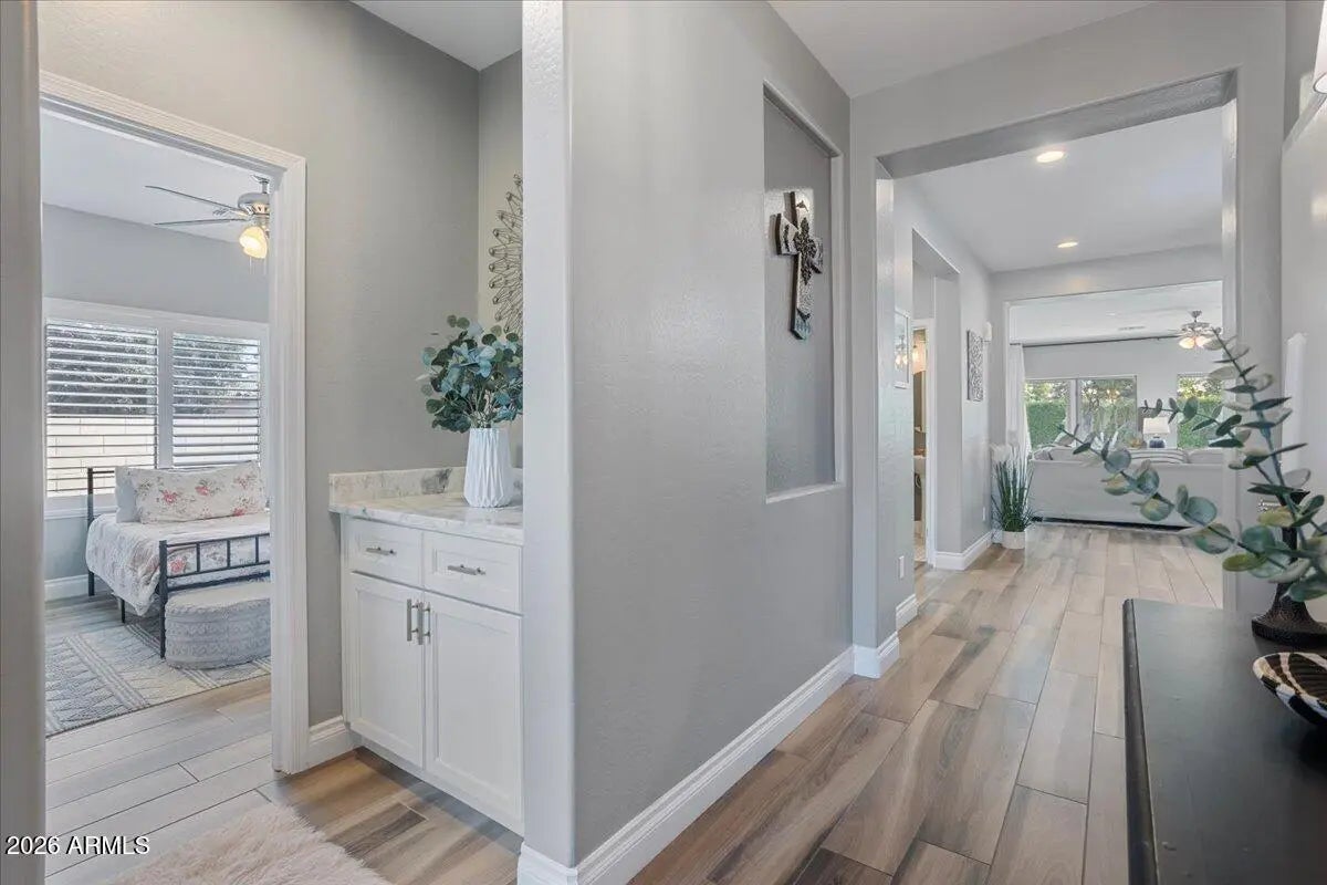 Welcome to this beautifully remodeled home in desirable Arroyo Mountain Estates! Offering 2,205 square feet of thoughtfully designed living space, this stunning residence features 3 spacious bedrooms plus a versatile den, and 2.5 baths. Situated on a premium corner lot with view fencing, this home offers privacy and an open, airy feel. The backyard is an entertainer's dream with a relaxing spa and motorized patio cover screens, creating the perfect setting for year-round outdoor enjoyment. Inside, the remodel truly shines -- showcasing a clean, modern aesthetic and an open-concept floor plan that feels even better than a model home. Every detail has been carefully curated to create a bright, welcoming atmosphere ideal for both everyday living and hosting guests. A 3-car garage provides ample space for vehicles, storage, or hobbies. Come experience the charm, beauty, and lifestyle that make living in Litchfield Park so special -- this one is a must-see