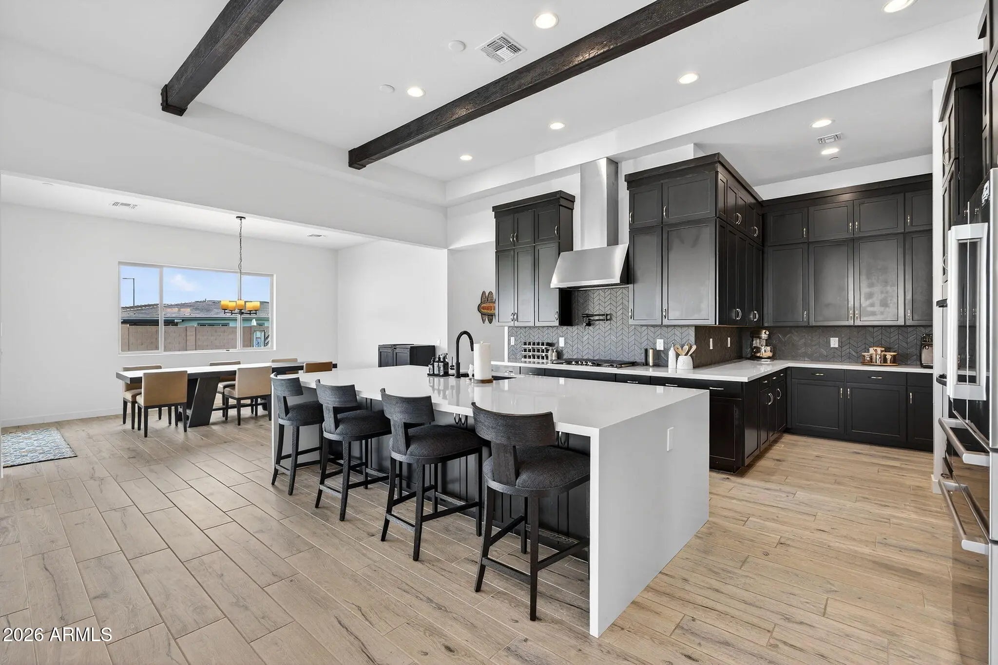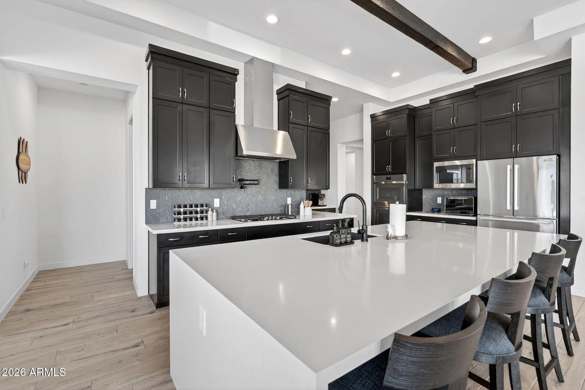 Welcome to this absolutely stunning single-story, corner lot home, located within one of the West Valley's most coveted gated communities, Sedella. This 3-year-old 4 Bedroom, 4.5 Bathroom masterpiece makes an unforgettable first impression, beginning with a charming private courtyard entry that sets the tone for the luxury that awaits inside. From the moment you step through the door, this home radiates elegance and sophistication. Filled with an abundance of natural light, the bright and open floor plan boasts grand ceiling heights, including a stunning tray ceiling with exposed beams in the main entertaining space. The chef's kitchen is the true heart of the home, showcasing beautiful upgrades including Stainless Steel GE Smart Appliances, a Designer Tile Backsplash, Quartz Countertops, a Pot Filler Faucet over the stove, an Expansive Island with Breakfast Bar, a Walk-In Pantry, and so much more! Throughout the interior, you'll find Wood Plank Tile Flooring, an Oversized Laundry Room complete with a GE Cafe Washer & Dryer and secondary GE Cafe Refrigerator, 3 En-Suite Bedrooms, and 2 Additional Bonus Rooms perfectly suited as a home office, game room, media room, or home gym. The Primary Suite Retreat is a sanctuary of its own, featuring an Oversized Walk-In Closet, an Additional Walk-In Closet with direct access to the Laundry Room, and a Spa-Like Primary Bathroom with Separate Sinks, a Large Porcelain Soaking Tub, and a fully enclosed Tile Shower. Car enthusiasts and hobbyists will love the expansive 4-Car Garage, complete with epoxy flooring -- offering both exceptional storage and a polished, finished look. Step outside and discover your very own Resort-Style Pool, featuring an Extra-Large Baja Shelf, a Waterfall Feature, 3 Pool Fountains, and a Built-In Basketball Hoop. Maintenance is effortless with an In-Floor Cleaning System and Aerator to help keep your pool cool and refreshing, even on the hottest Arizona days. The expansive backyard offers a covered patio and a blank canvas ready for you to complete the outdoor oasis of your dreams. All of the heavy lifting has already been done -- now it's your turn to add the finishing touches!