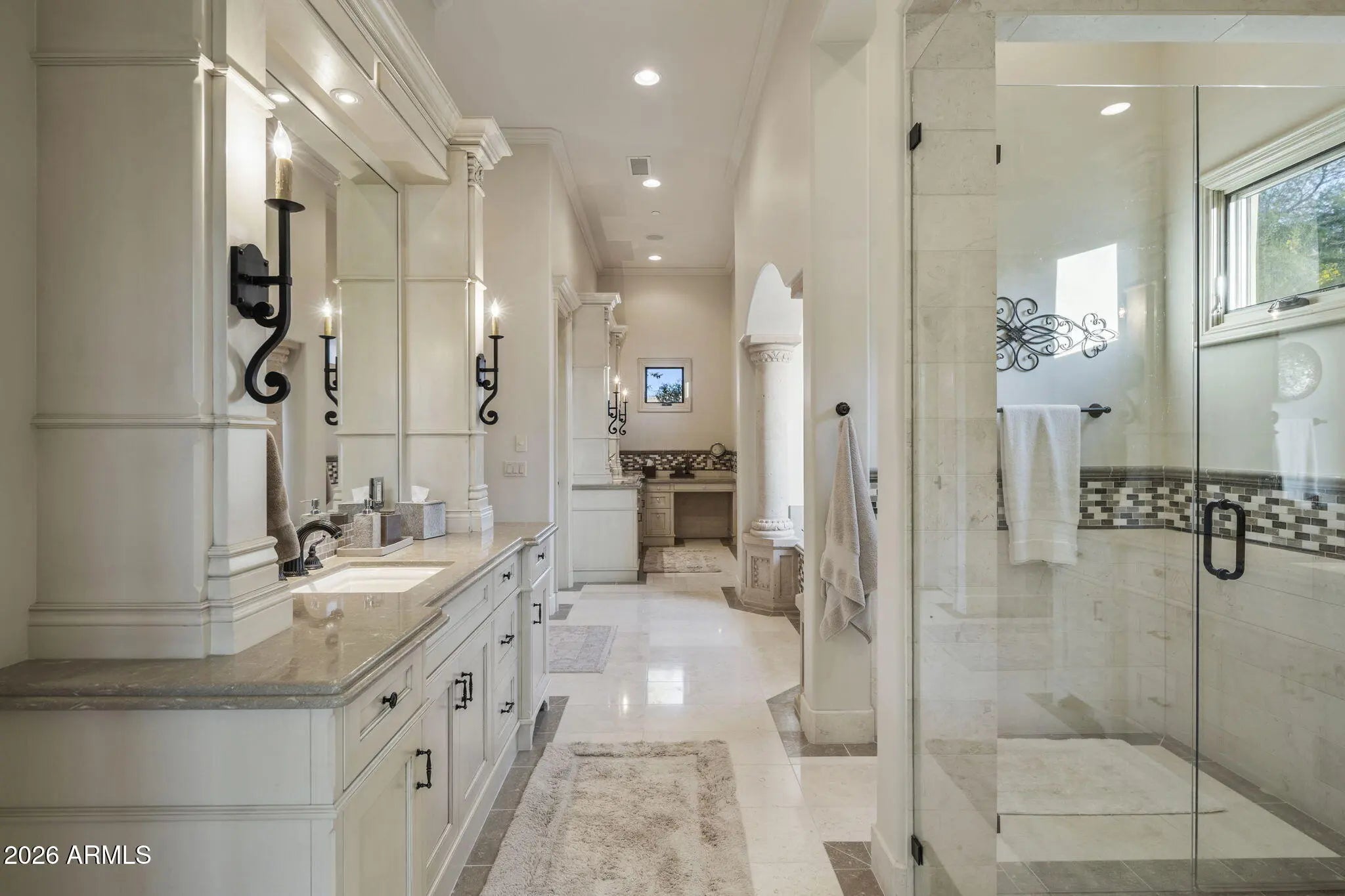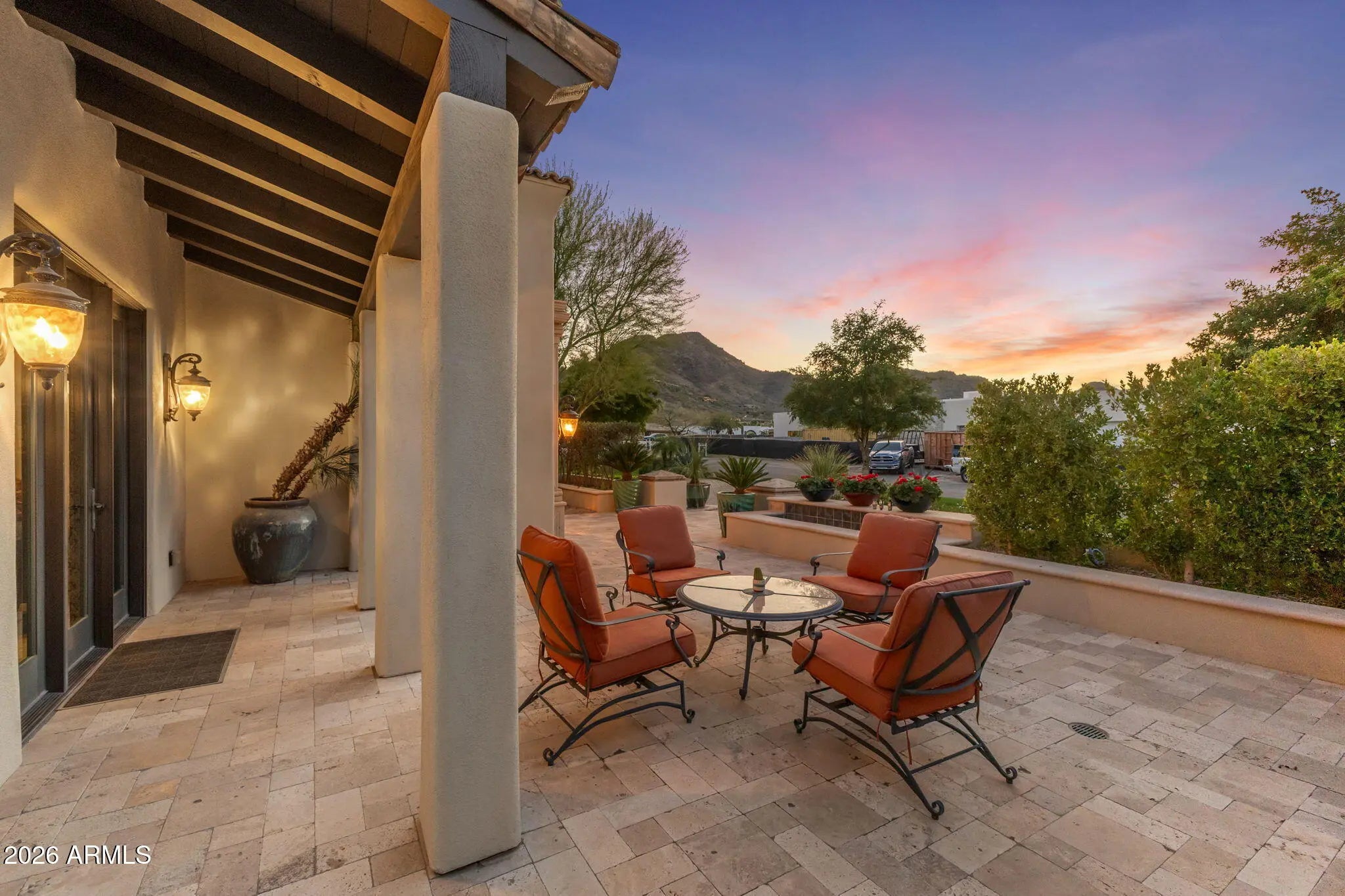 A masterful expression of Santa Barbara-inspired architecture, this extraordinary estate captures the essence of a private resort designed for effortless year-round living. Perfectly positioned to showcase unobstructed views of Mummy Mountain, every primary living space is oriented to embrace its breathtaking natural backdrop. Thoughtfully designed for both grand entertaining and private repose, the residence features a desirable split floor plan, with an opulent primary suite on one wing and a beautifully appointed attached guest quarters on the other--each enjoying serene views and seamless indoor-outdoor flow. ((CONTINUED)) Smart-home technology, including an integrated Control4 system, allows for effortless control and monitoring from your smartphone, while the meticulously maintained grounds provide beauty without burden. Inside, rich walnut custom cabinetry, intricate ceiling detailing, and the artful use of travertine and marble create a refined yet inviting ambiance. State-of-the-art wireless electronics are integrated throughout. At the heart of the home, an expansive gourmet kitchen is outfitted with premier Wolf and Sub-Zero appliances, designed to inspire culinary excellence. An intimate bar area gracefully connects the casual dining space and family room, setting the stage for elegant gatherings. The media and game room opens directly to the resort-style pool and spa, while a private library/office enjoys its own entrance through the charming front courtyard. Additional enhancements include a newly finished epoxy garage floor, elevating both function and presentation in the spacious garage. Unlike any other property, the attached guest house offers its own secluded courtyard--an exceptional retreat for visitors seeking privacy and comfort. Distinctive, sophisticated, and truly one of a kind, this remarkable estate must be experienced to be fully appreciated.