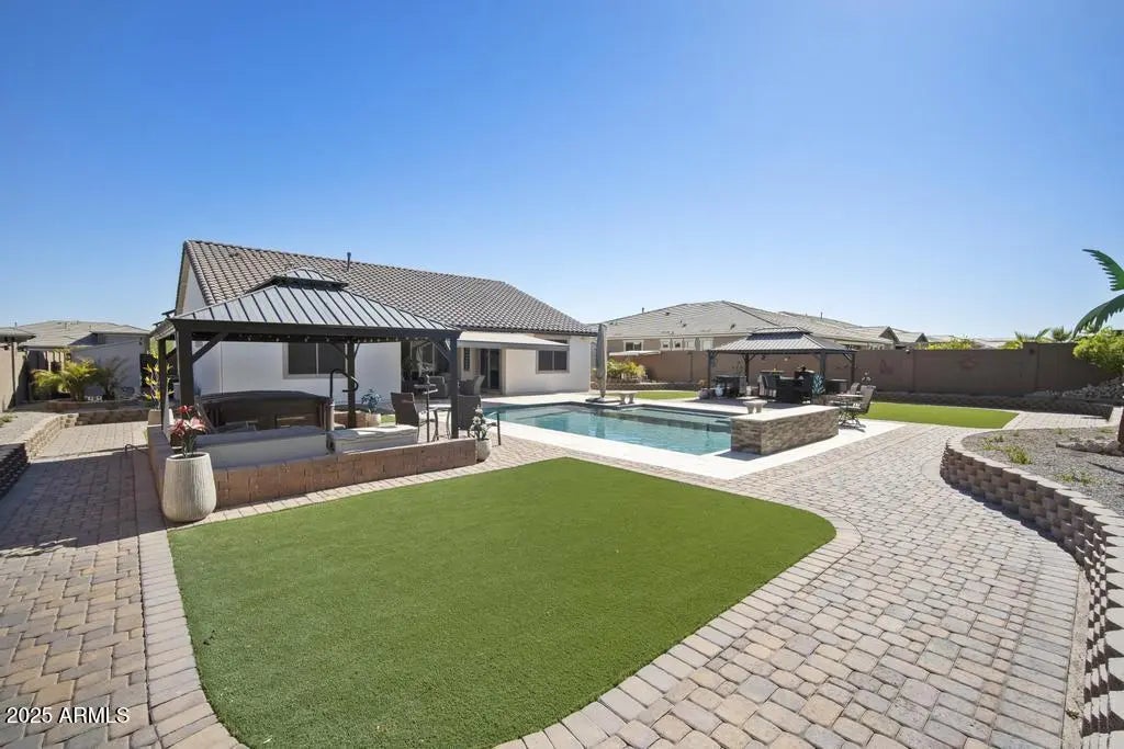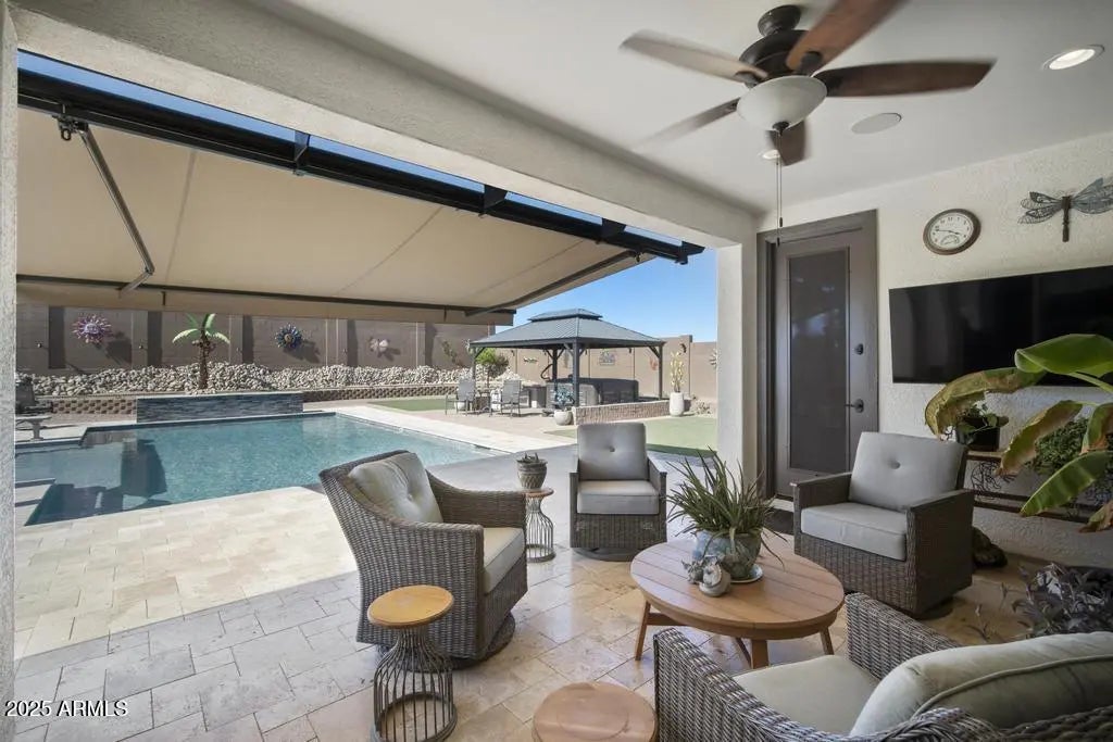 Welcome to this beautifully upgraded home in the highly sought-after gated community of Falcon View. The spacious, open floor plan features a gourmet kitchen with custom cabinets, granite countertops, a gas 5-burner cooktop, dual pantries, and convenient slide-outs in all cabinets. The elegant primary suite offers a generous walk-in closet with custom built-ins, a designer paint accent wall, dual sinks, and an upgraded deluxe spa shower for a true retreat experience. A separate wing of the home includes two additional bedrooms and a bonus teen/media room, offering the perfect setup for guests, kids, or a flexible work/play space. Step outside to your private backyard oasis, thoughtfully transformed with an 18' x 30' heated and cooled pool complete with dual waterfalls and an in-floor cleaning system. Enjoy the expansive travertine decking and pavers, above-ground 4-person spa, two 12' x 16' gazebos with lighting, a retractable awning over the back patio, two storage sheds, and lush landscaping-perfect for entertaining or relaxing in style. Not to be missed-the 3-car garage has been upgraded into a highly functional space with epoxy flooring, overhead storage racks, a mini-split system, and added insulation for year-round climate control. This home has it all-style, function, and resort-style outdoor living.