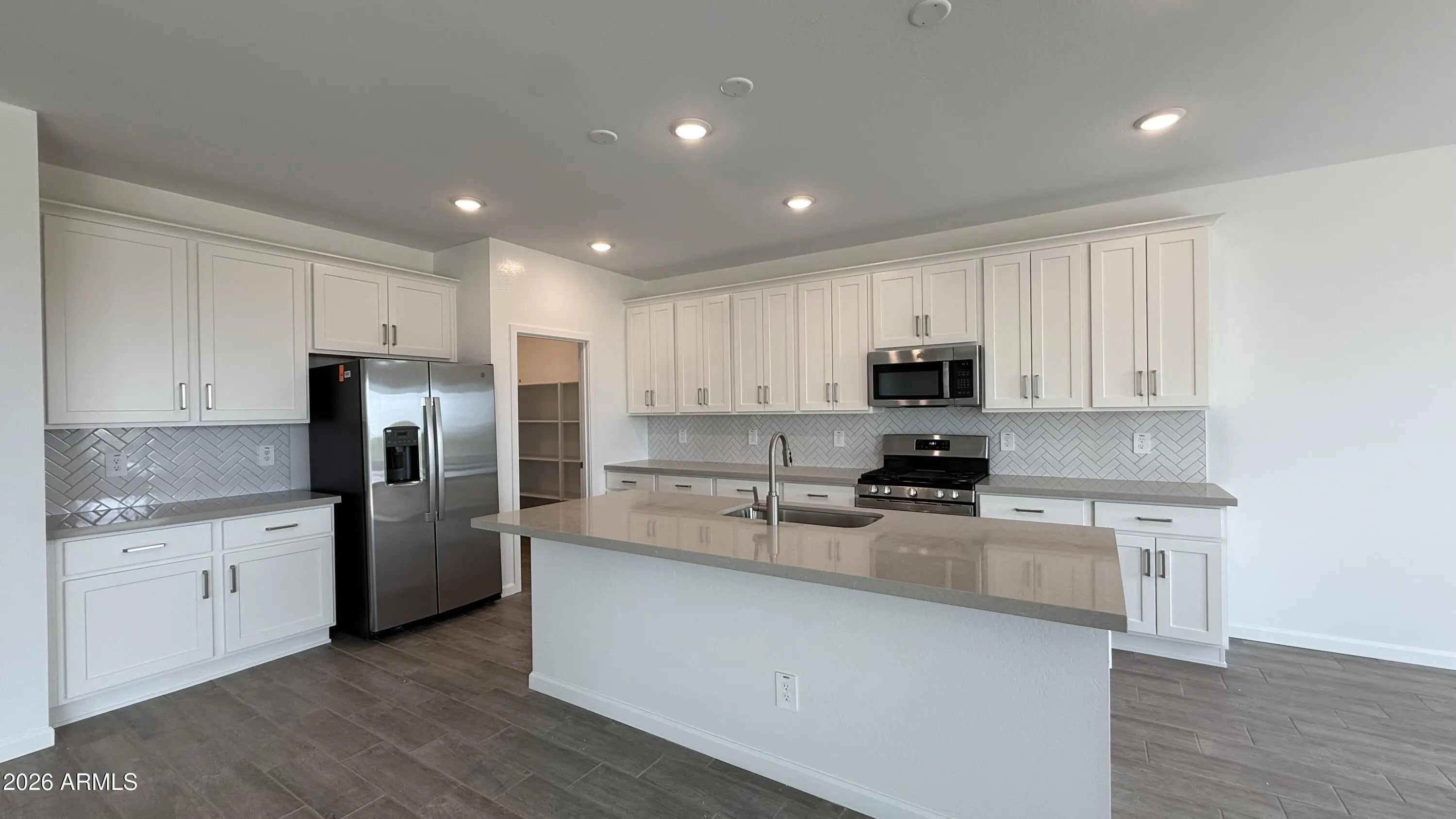 This Modern style Topaz home boasts 2,488 sq ft of living space, featuring 3 bedrooms, 2.5 bathrooms, a 3 car tandem garage, a separate den, and ample storage throughout. This home showcases our thoughtfully curated Timeless Collection. The open concept kitchen is perfect for entertaining family and friends with the kitchen featuring White Shaker 42'' upper cabinets with satin nickel cabinet hardware, Baker Blvd Herringbone Mosaic White Gloss backsplash, beautiful Ivory White quartz countertops, stainless steel gas stove, and a walk in pantry designed with an organizer's dream in mind. You'll love the 4-panel center meet sliding glass door that utilizes the indoor and outdoor flow for a bright airy feel, 9' ceilings and 7 x 22 Lakewood plank tile flooring. The Amarillo Creek community is conveniently located near Route 347 for easy commuting to Phoenix, Chandler and Mesa. Just minutes away from an array of dining, shopping and entertainment options that Maricopa has to offer. Don't miss out on this beautifully appointed turn key home!