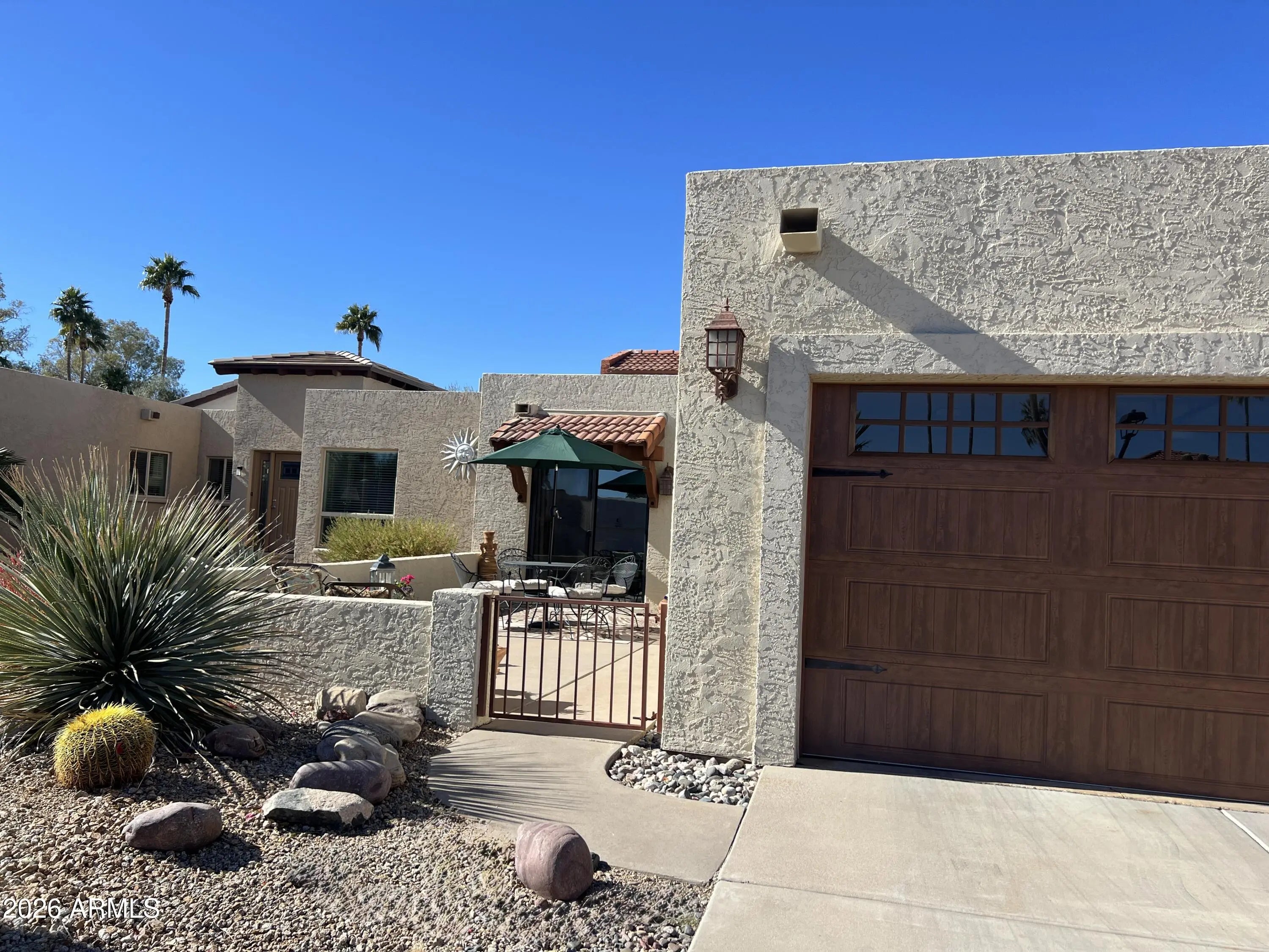3 bedroom townhouse. Vaulted ceiling, beehive fireplace & dining in family room. Arcadia doors opens to covered patio /back area of natural designed cactus garden & groomed vegetation. Primary bedroom with ensuite & walk in closet. 2nd bedroom & 3rd bedroom or den. Eat in kitchen/granite counters, sliding doors open to large courtyard/ 2 car garage. Furnished with exception of limited personal items. $4000 credit to purchase new appliances, golf cart included.55 and older award winning resort community. Golf, tennis, pickleball,hiking, biking,swimming, community center, country club and so much more