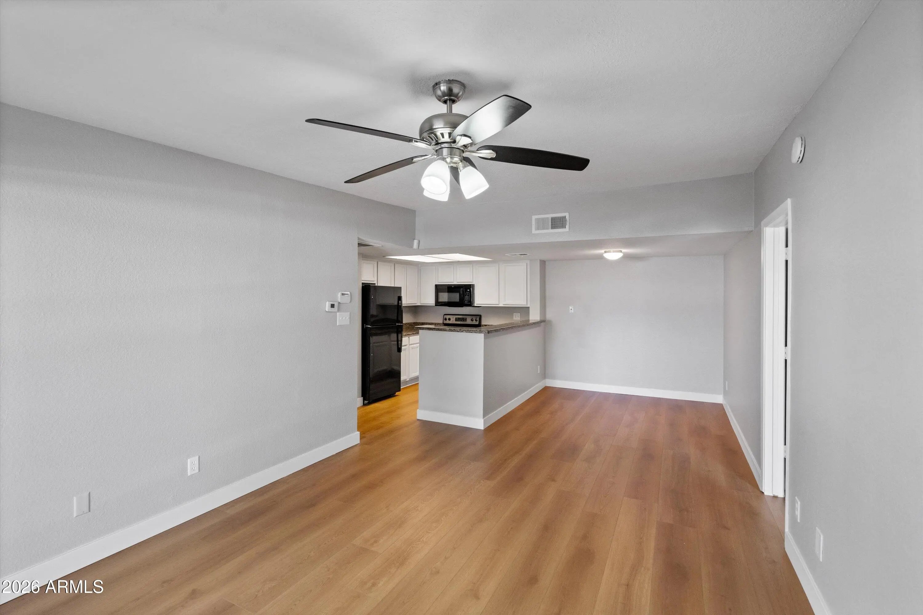 Completely remodeled and truly move-in ready, this stunning 2 bed, 2 bath second-floor condo in Thunderbird Paseo Condominiums offers modern updates, a desirable split floor plan, and exceptional flexibility in a prime Glendale location. Located directly across from Banner Thunderbird Medical Center, the community allows mid-term rentals, creating a unique opportunity for seasonal residents, traveling medical professionals, or buyers seeking a low-maintenance investment property in a high-demand medical corridor. Whether used as a full-time residence, lock-and-leave winter retreat, or income-producing asset, this condo offers built-in versatility. Inside, the beautifully updated interior features fresh paint, brand-new laminate flooring throughout, updated appliances, refreshed batht new hardware, modern mirrors, and stylish finishes that create a clean, contemporary feel from the moment you enter. The spacious living area is filled with natural light from a large sliding glass door that opens to a private patio. The open layout flows seamlessly into the dining area and kitchen, complete with ample cabinet space, updated appliances, and a raised breakfast bar overlooking the main living space, perfect for everyday living and entertaining. The split floor plan enhances privacy, with a generously sized primary suite featuring dual closets, ceiling fan, and private en-suite bath. The secondary bedroom is positioned on the opposite side of the unit near the hall bath with tub/shower combo. Thunderbird Paseo offers resort-style amenities including a heated pool and spa, clubhouse with fitness center and lounge areas, billiards room, picnic areas with gas BBQs, mature landscaping, and assigned covered parking. Excellent Glendale location near ASU West, Thunderbird Paseo Park, shopping, dining, and major freeways, offering convenience, comfort, and long-term value in one of the area's most accessible pockets.
